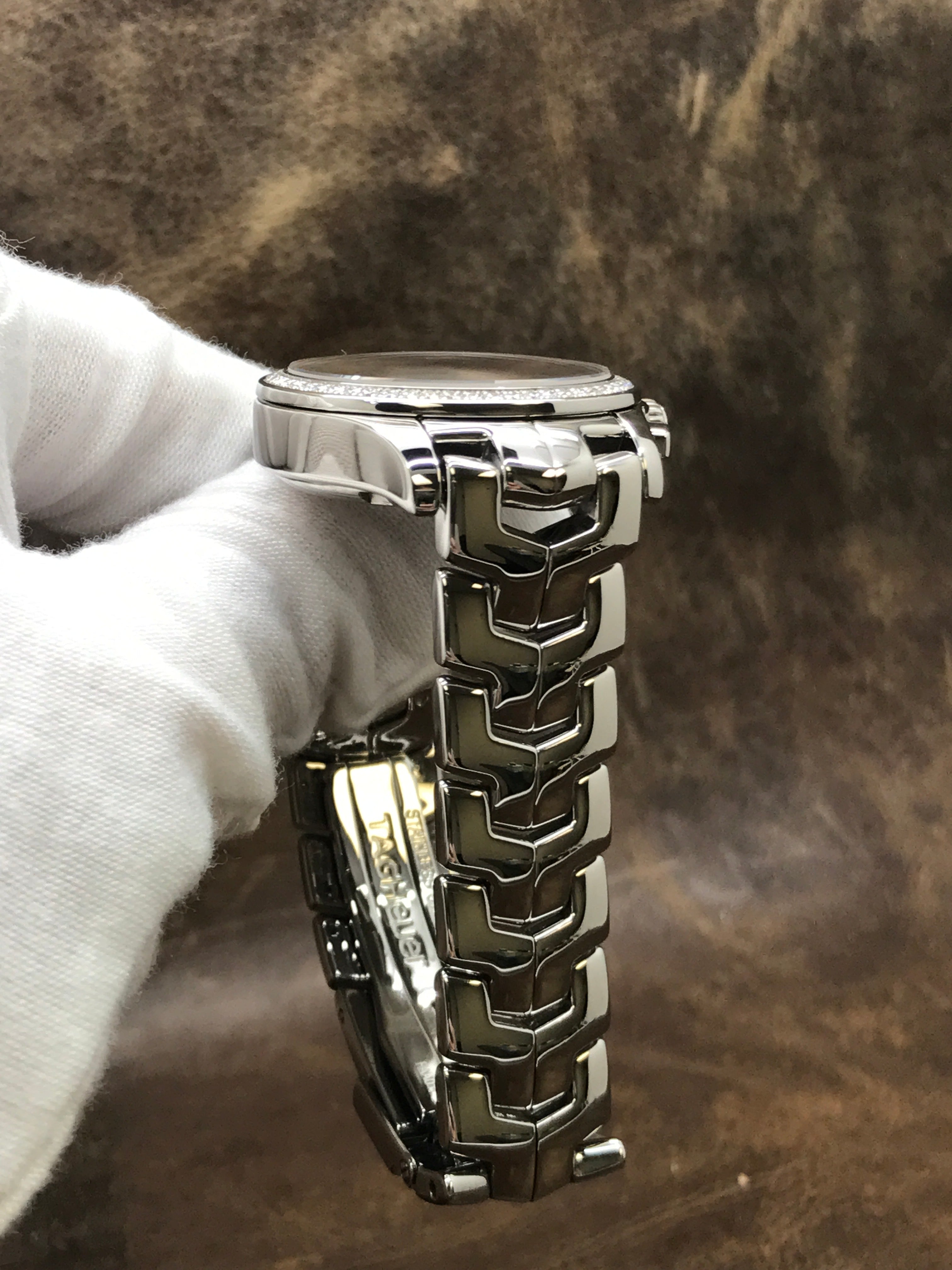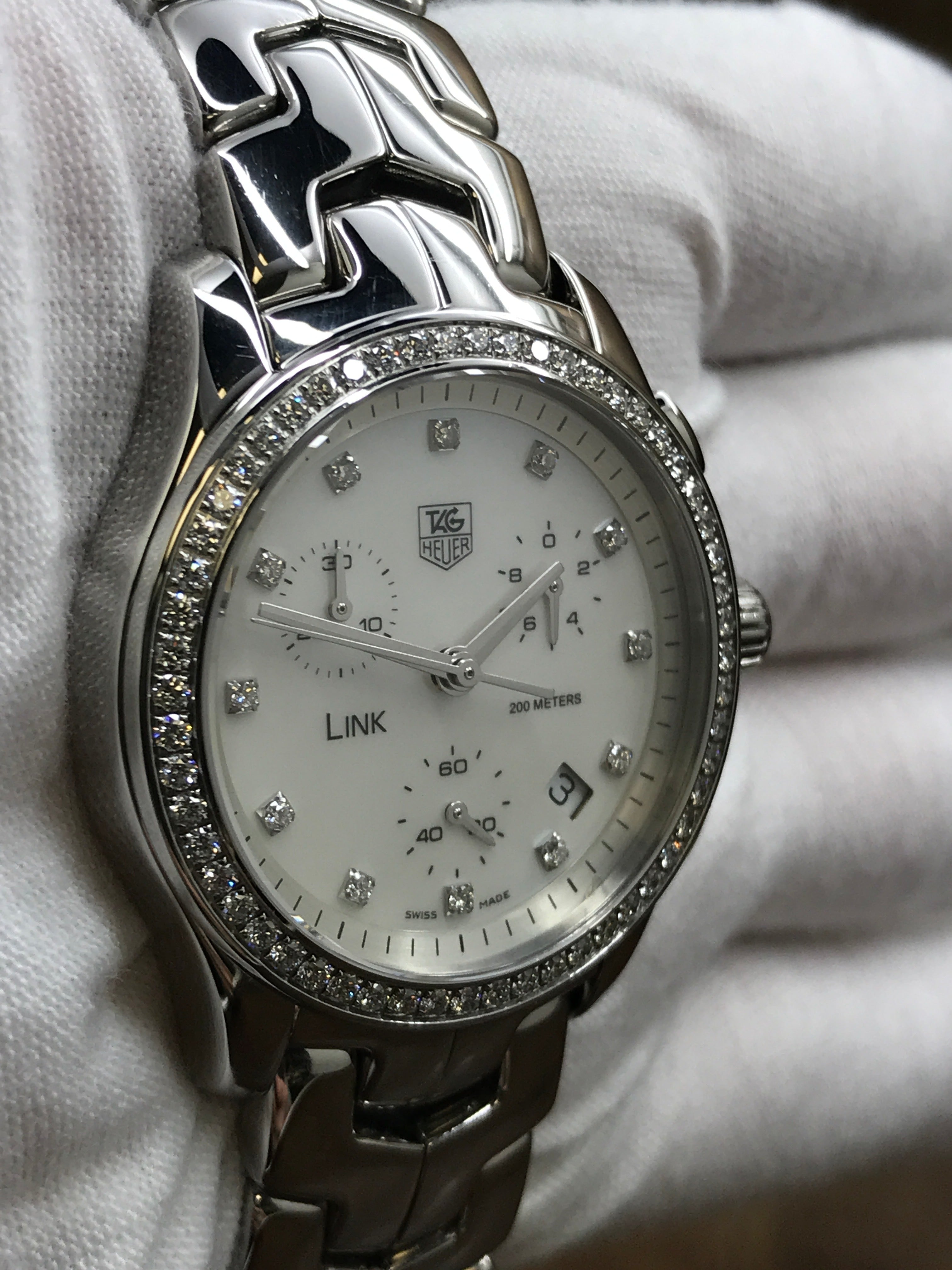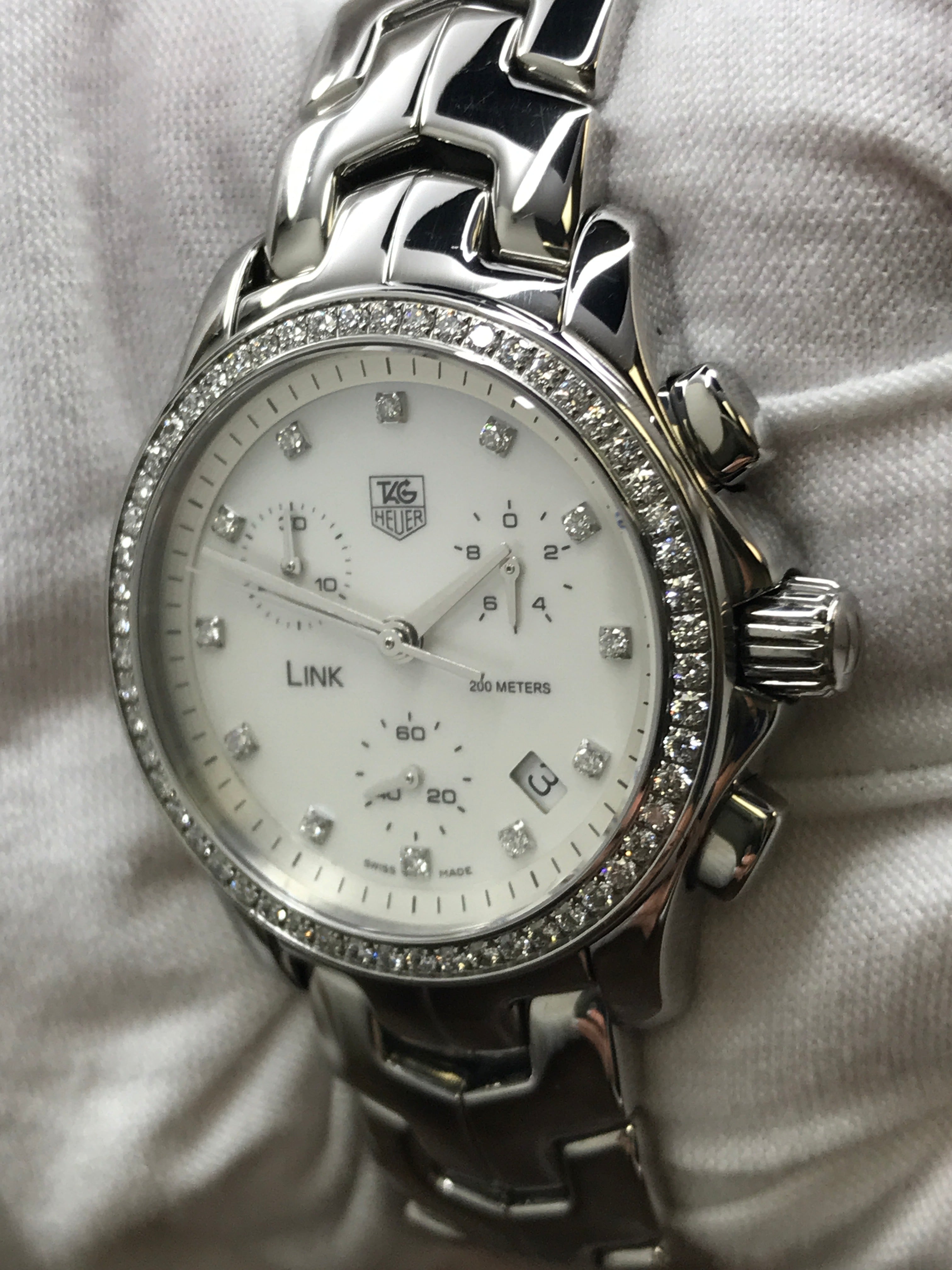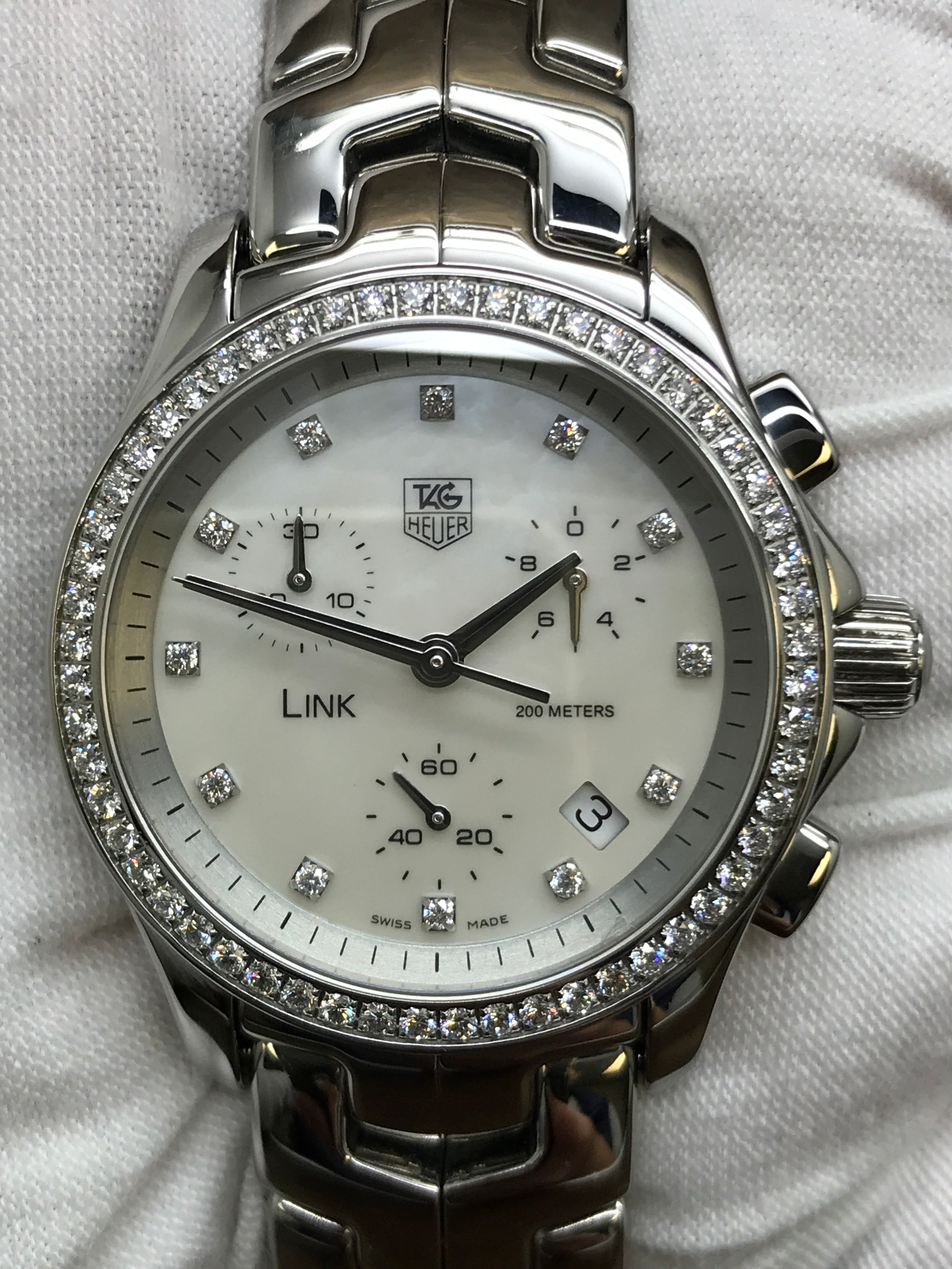 Stainless steel case with a stainless steel bracelet. Fixed set with diamonds stainless steel factory diamond setting bezel. Mother of pearl diamond dial with silver-tone hands and diamond hour markers. Dial type: analog. Eta 251471 quartz movement with about of power reserve. Sapphire crystal. Screw down crown. Solid case back. Case size: 33 mm. Case thickness: 10.9 mm. Round case shape. Band width: mm. Fold over deployment clasp. Water resistant at 200 meters / 660 feet. Functions: hours, minutes, seconds, chronometer . TAG Heuer Link Chronograph CJF1314 Mother of Pearl Diamond Dial Quartz Women's Watch.