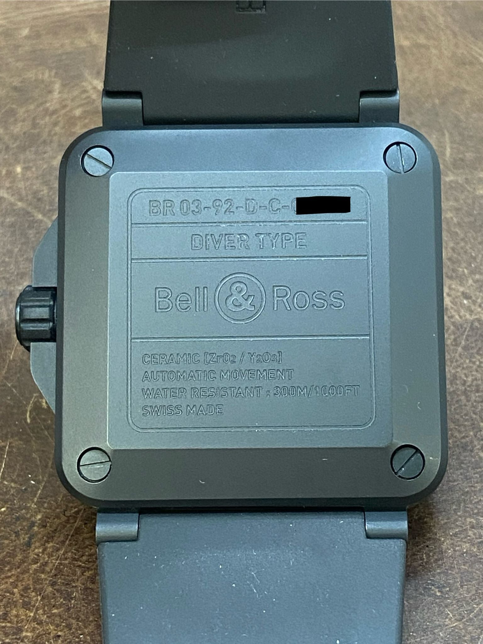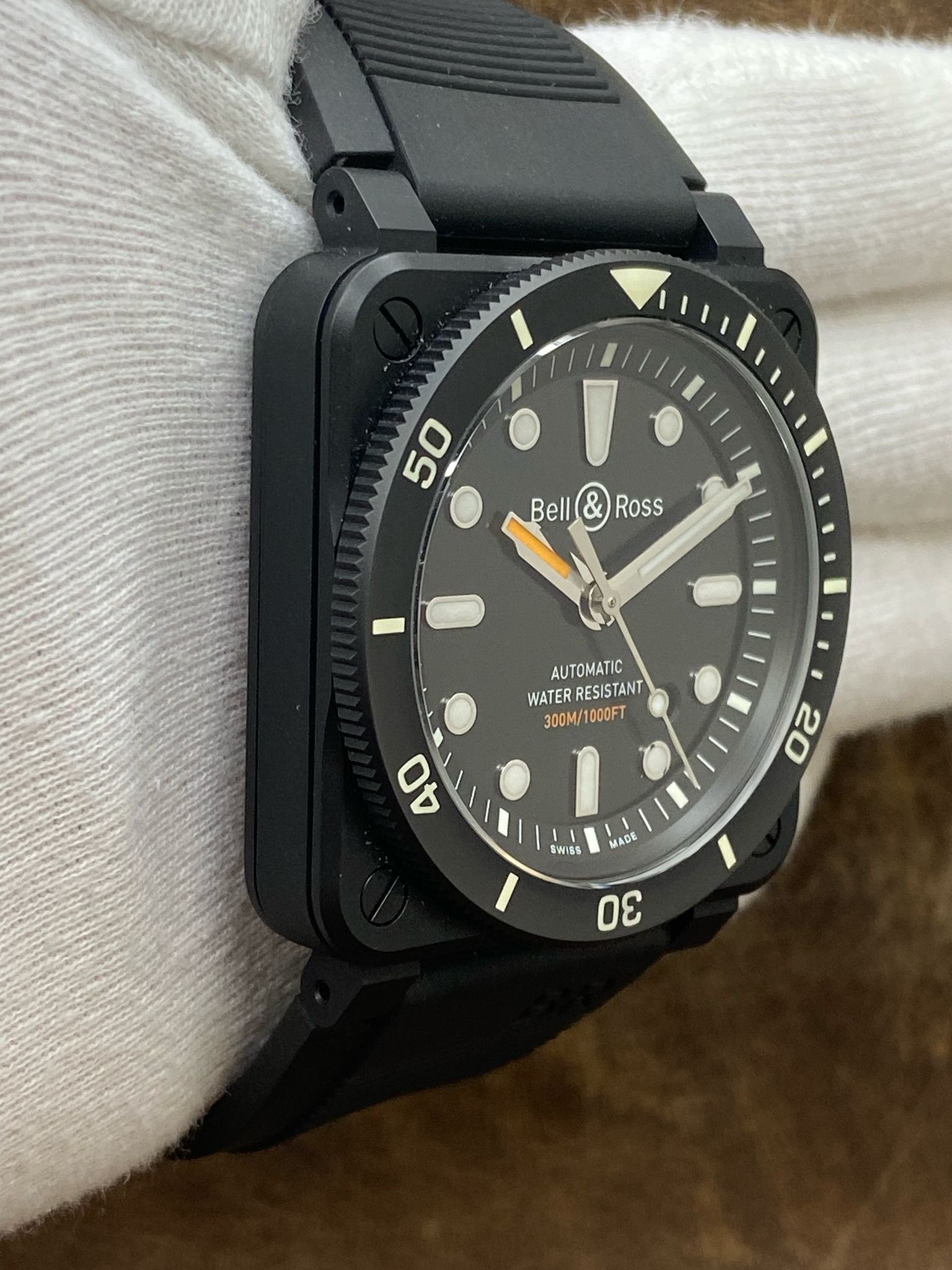 Ceramic case with a rubber strap. Uni-directional rotating ceramic bezel. Black dial with luminous silver-tone hands and luminous dot & index hour markers. Dial type: analog. Br-cal.302 automatic movement with about 54 hours of power reserve. Sapphire with anti-reflective coating crystal. Screw down crown. Solid case back. Case size: 42 mm. Case thickness: mm. Square case shape. Band width: mm. Tang buckle clasp. Water resistant at 300 meters / 1000 feet. Functions: date, hour, minute, seconds. Bell & Ross Black Matte Ceramic BR-03 Diver Black Dial Automatic Men's Watch.