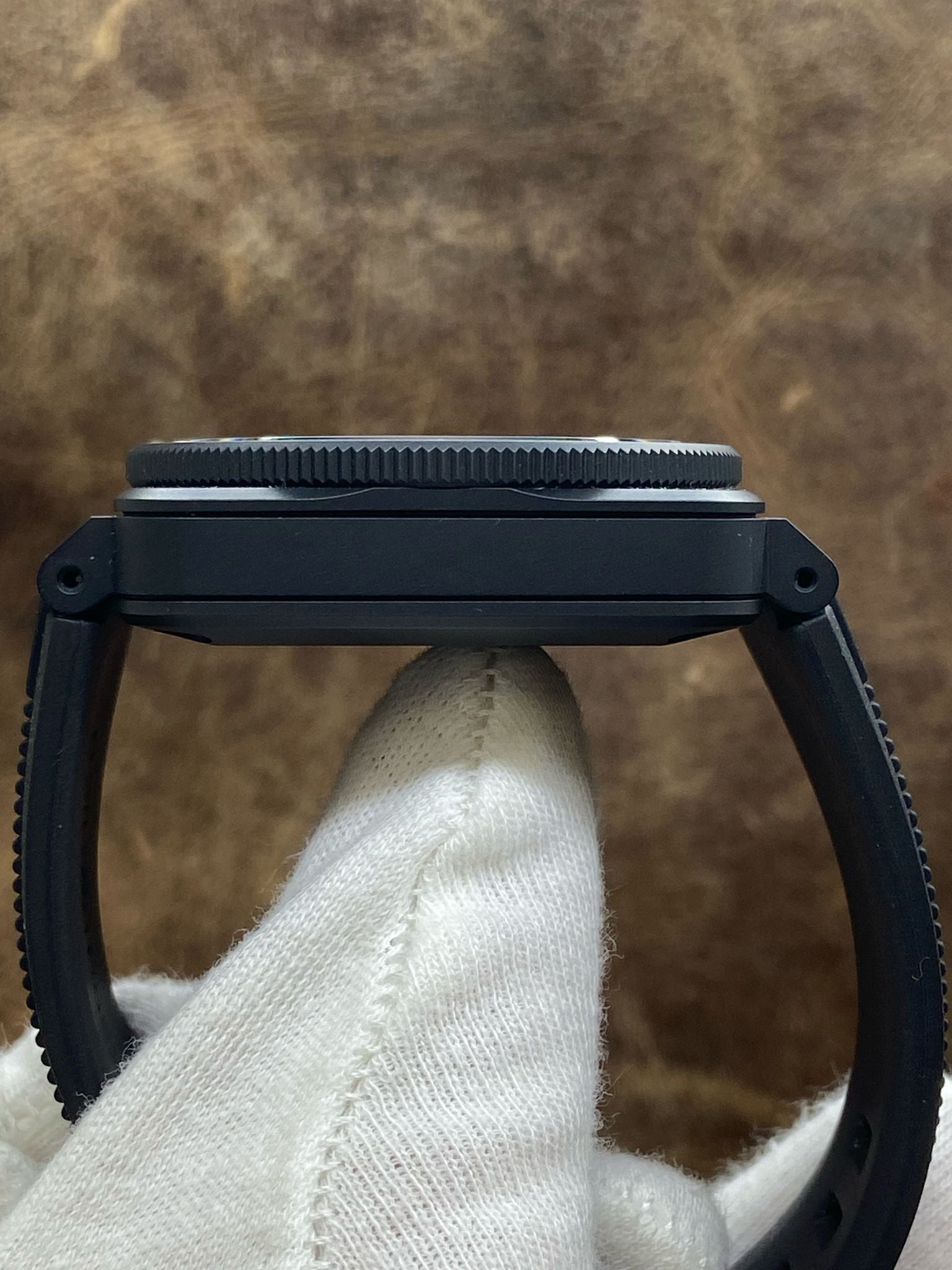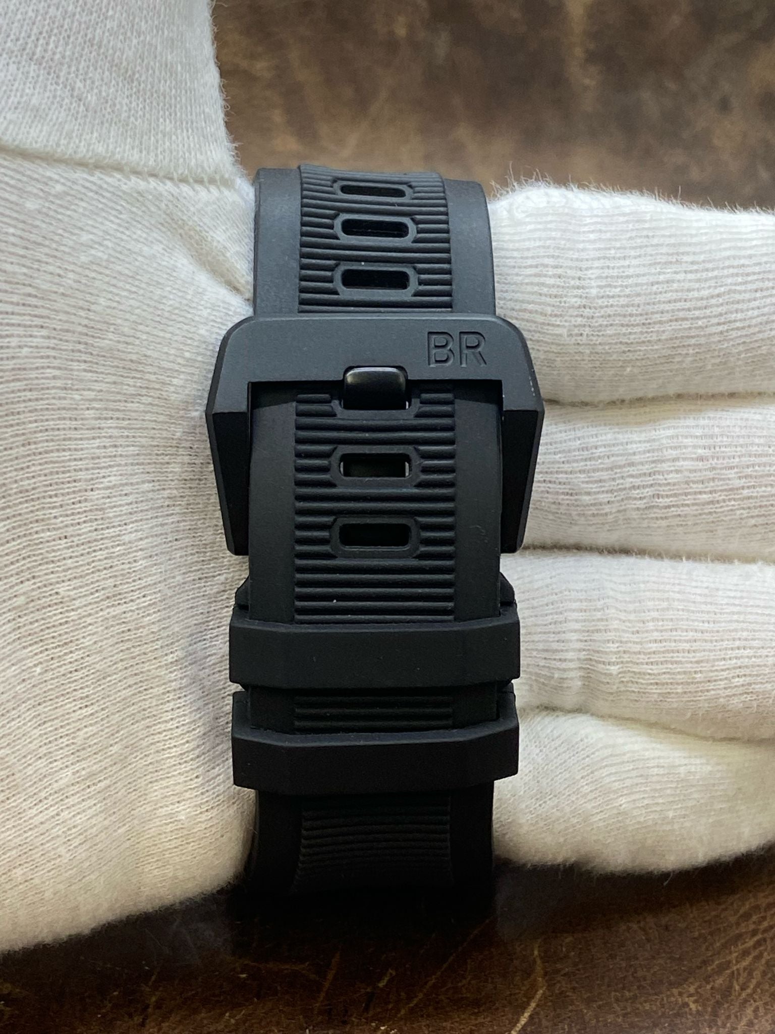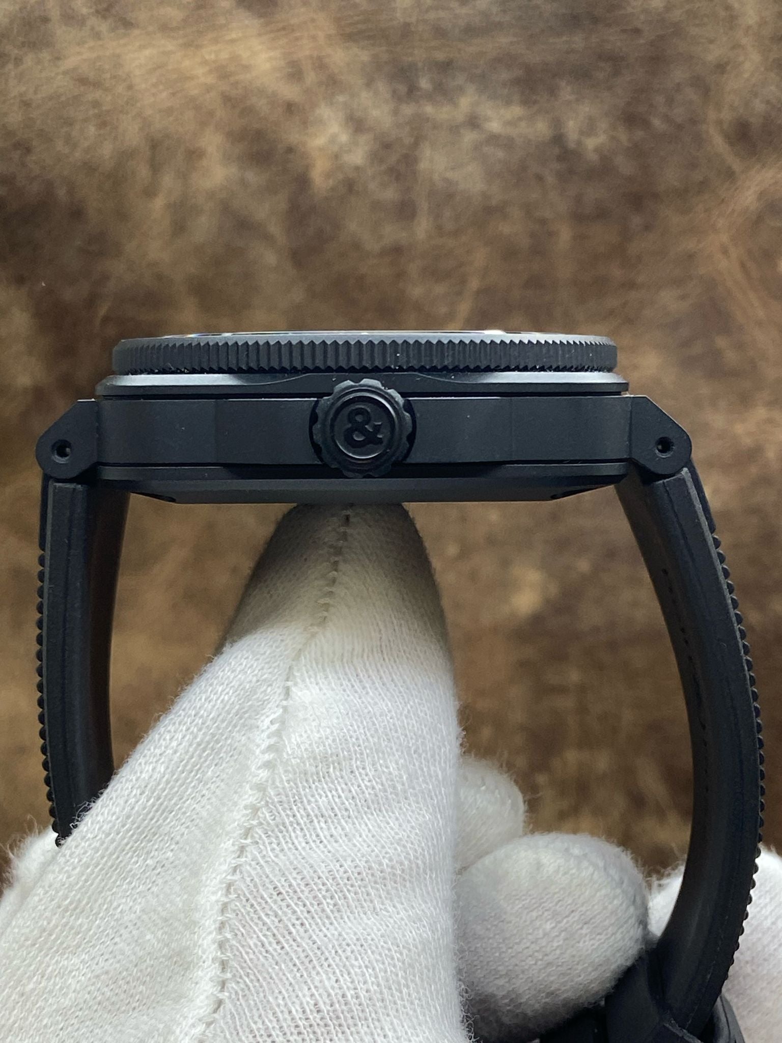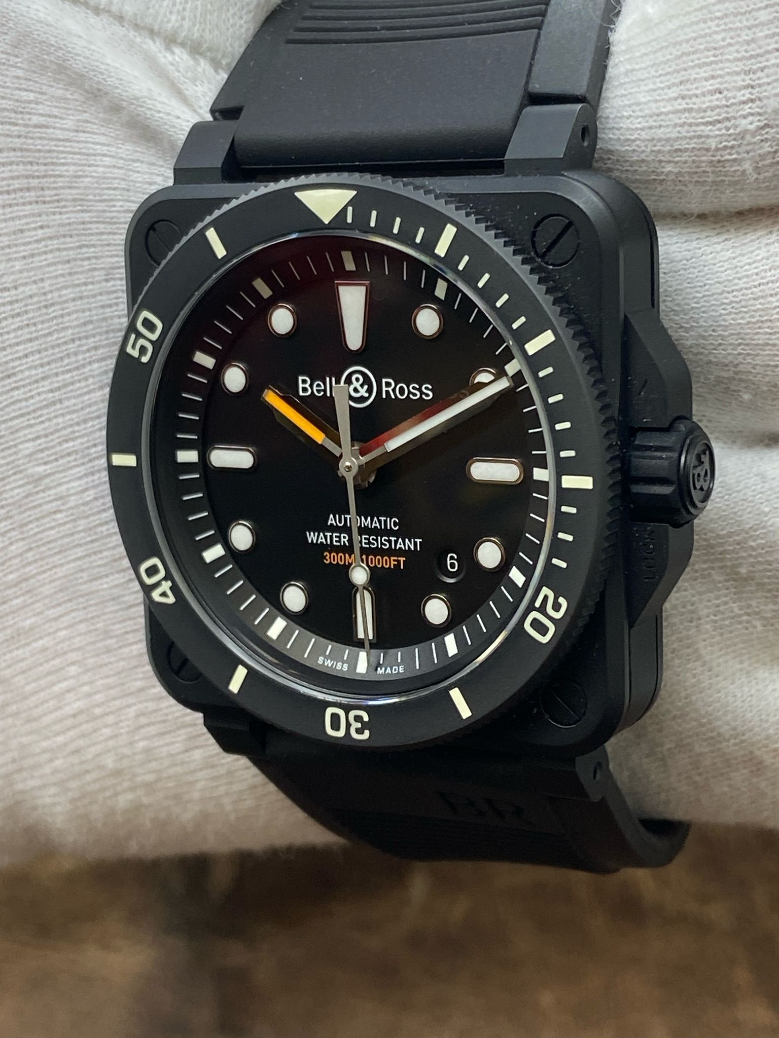 This pre-owned Bell & Ross Black Matte Ceramic BR-03 Diver is in mint condition and comes with: original Bell & Ross box, tools, booklet, extra black textile strap & custom orange rubber strap with matching warranty card dated 2024. Max wrist size: 7.75 in.