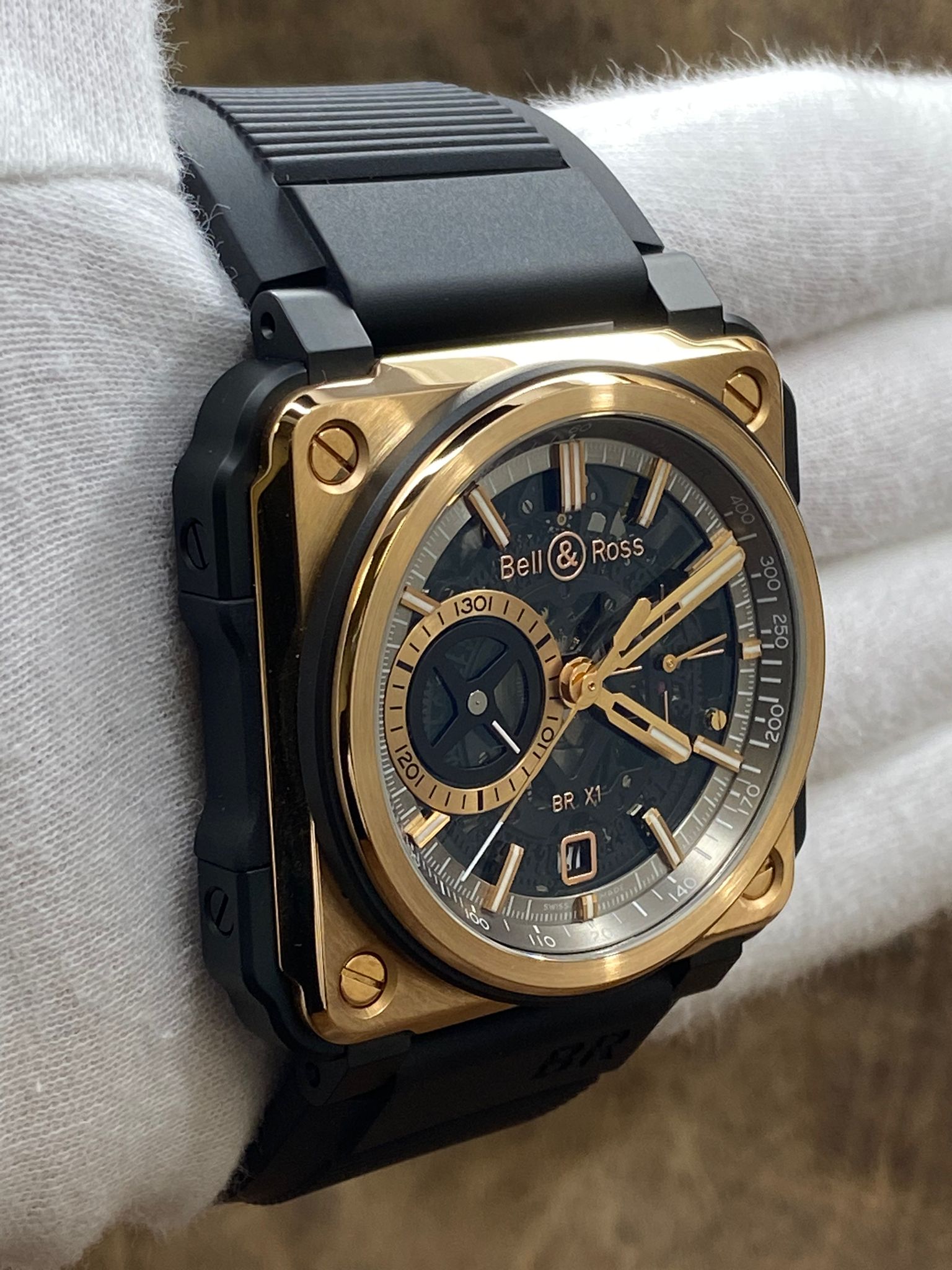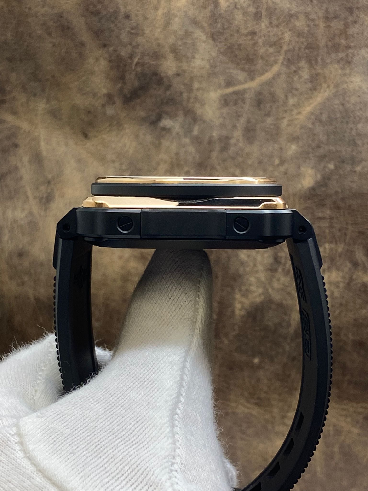 This pre-owned Bell & Ross BR-X1 ROSE GOLD & CERAMIC L.E 99pcs BR X1-PG-CE is in excellent condition and comes with: original Bell & Ross double box, booklet and matching warranty card dated March 2022. The gold parts of the watch have a few minor signs of wear. Max wrist size: 7.25 in.