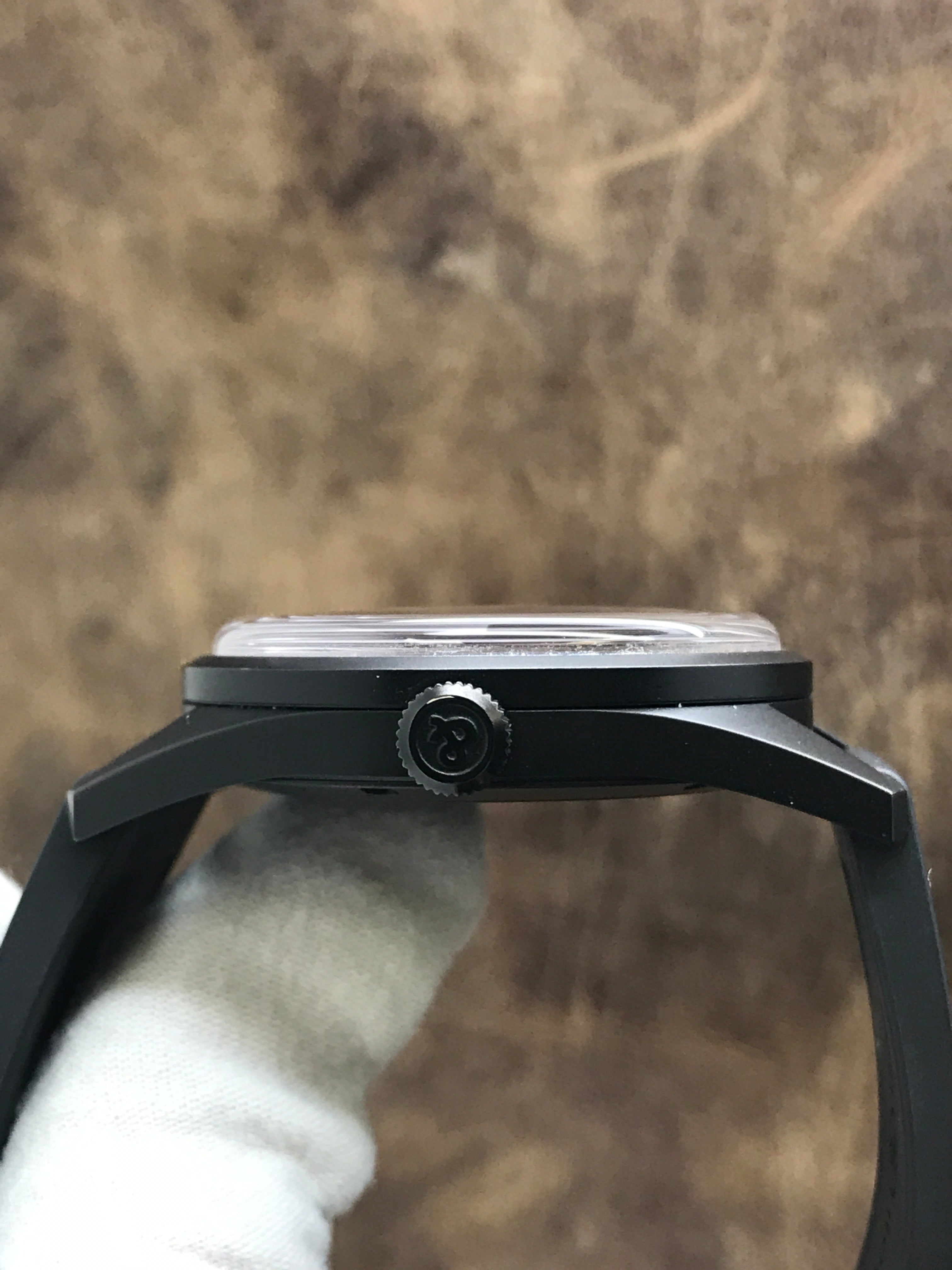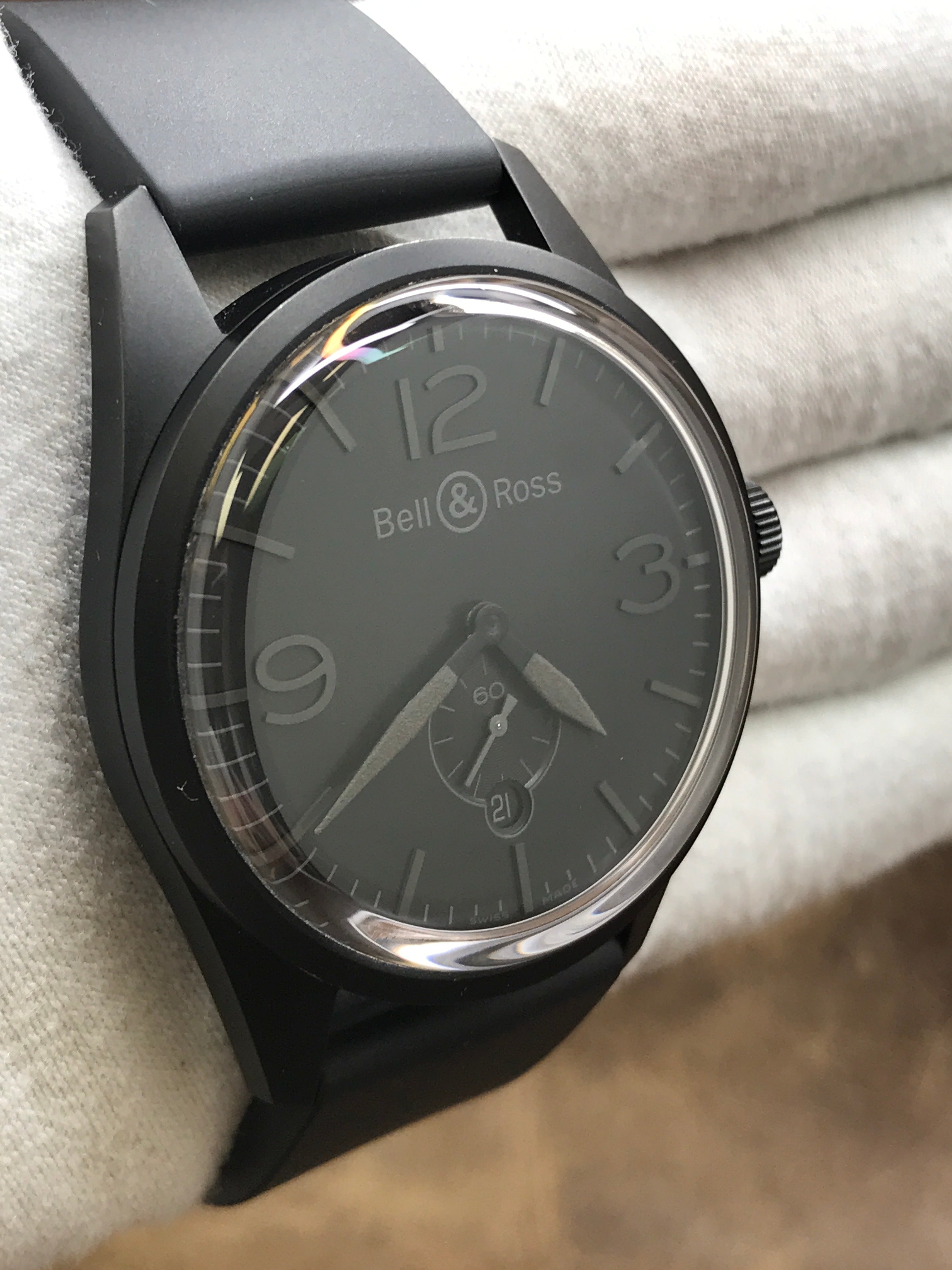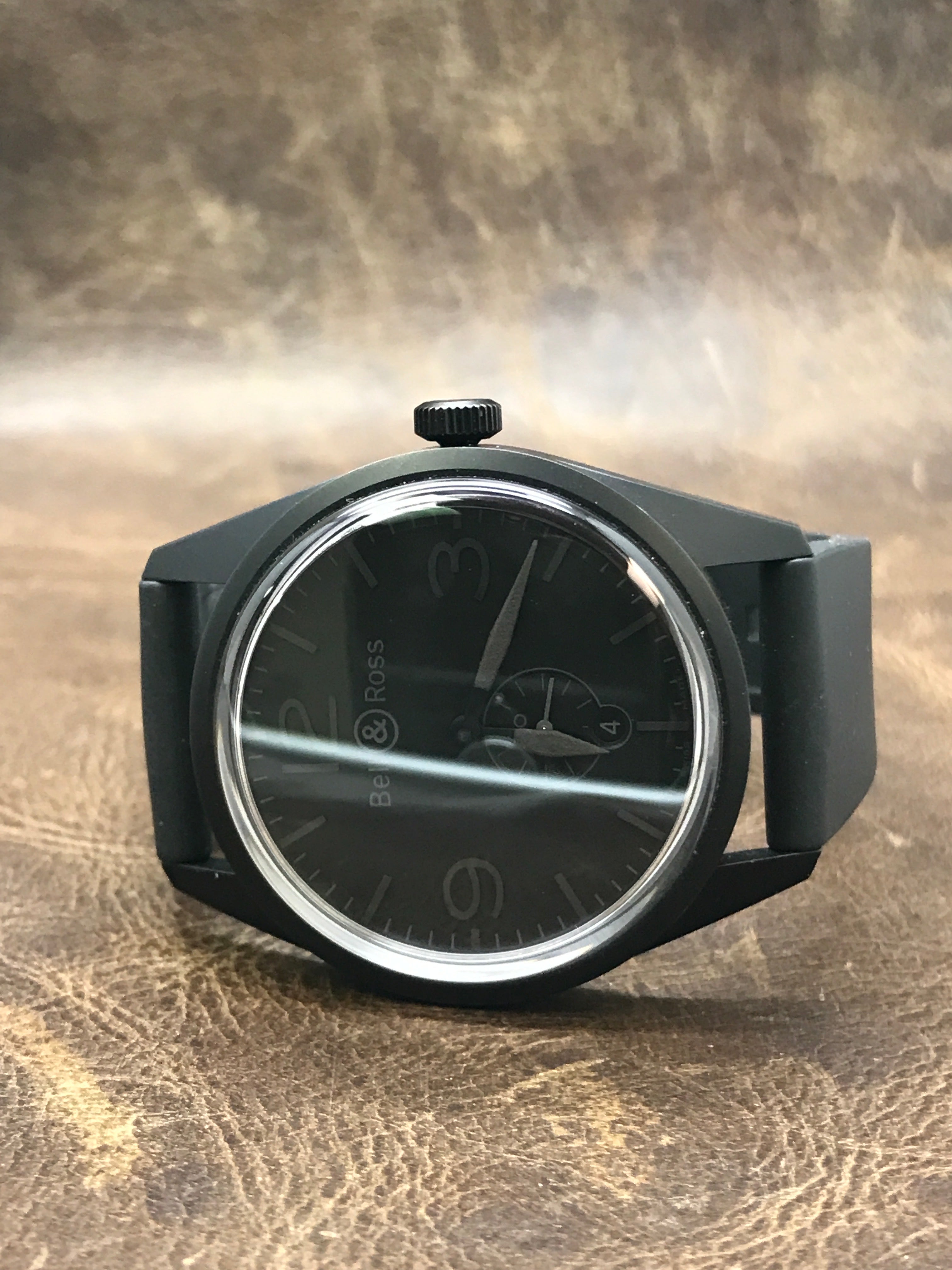 This pre-owned Bell & Ross Vintage PVD Phantom BR 123-95-SC is in excellent condition and comes with: NO box or papers. The crystal has a tiny hairline at 12 o’clock and the bezel has tiny chips on the edges between 7-8 o’clock. Max wrist size: 7.5 in.