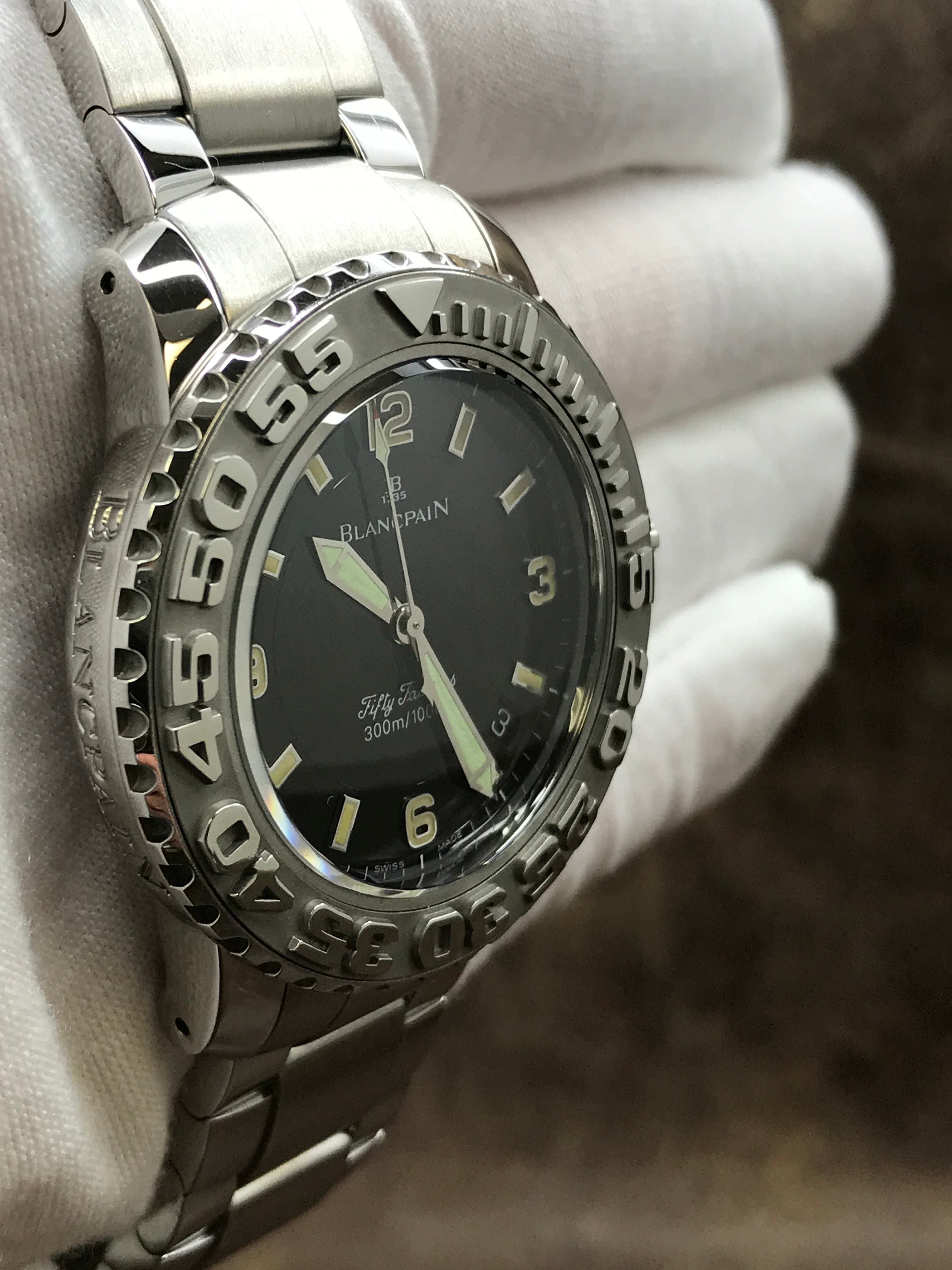 This pre-owned Blancpain Fifty Fathoms 2200-1130-71 is in excellent condition and comes with: original Blancpain peeling box, booklet & matching warranty papers dated 2002. The cushion inside the inner box is missing & the box is peeling. Max wrist size: 7.5 in.