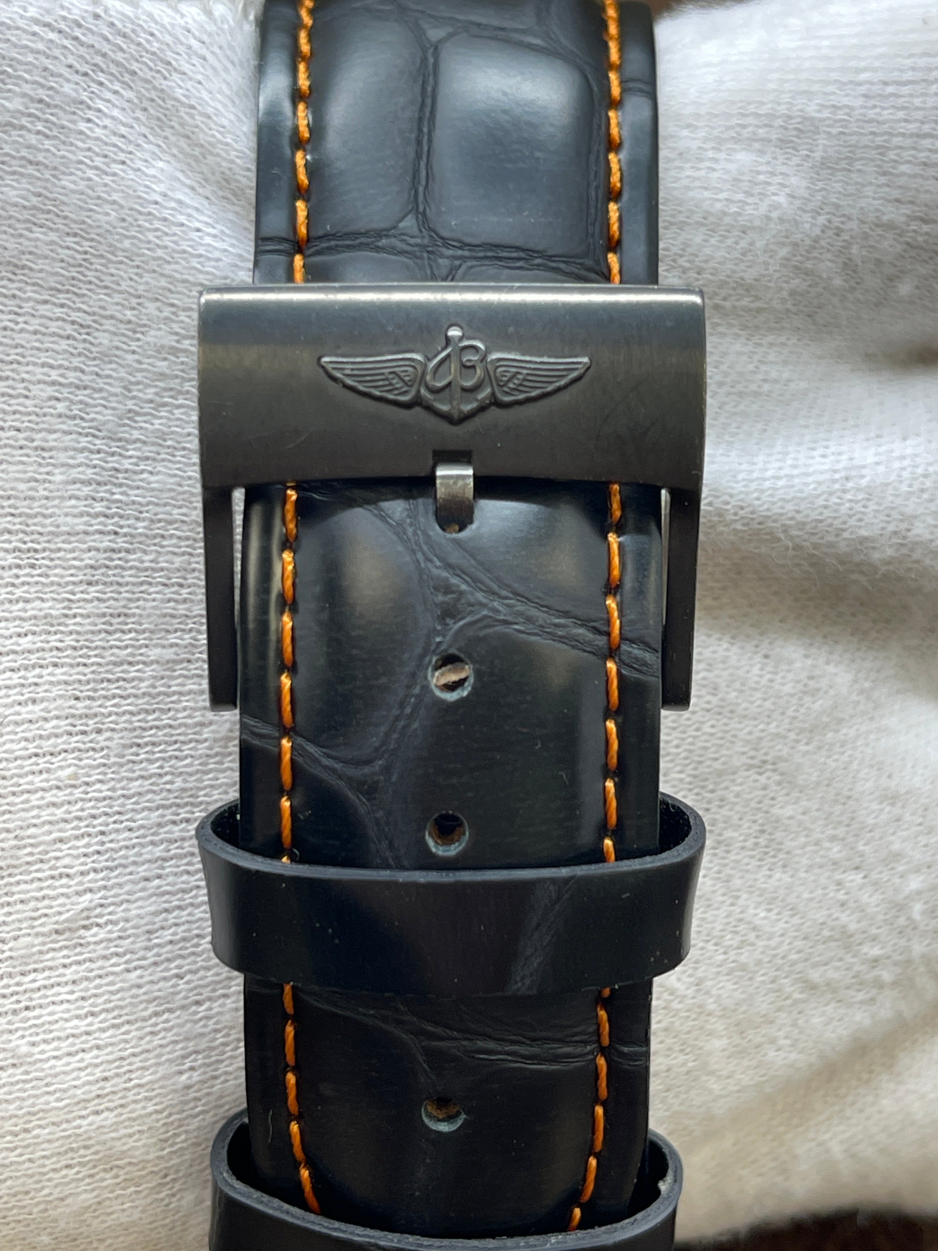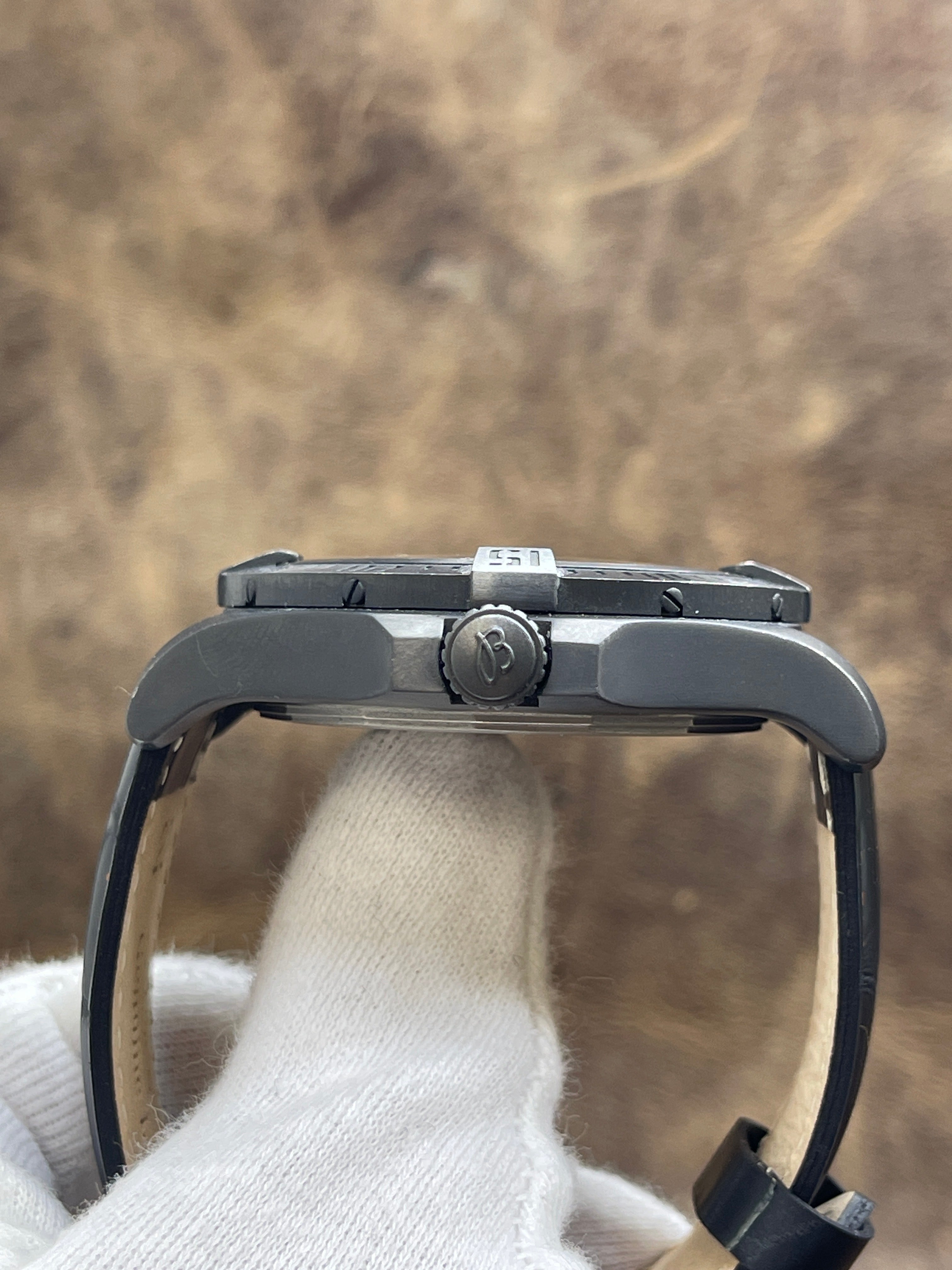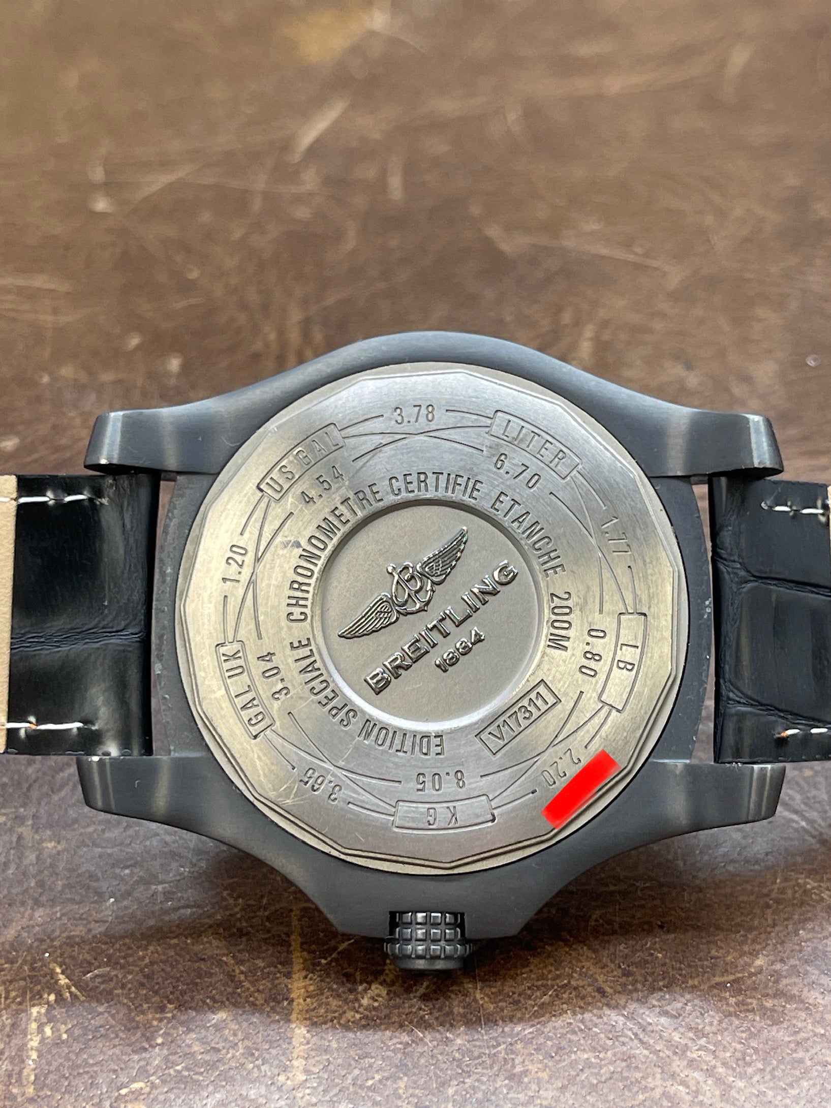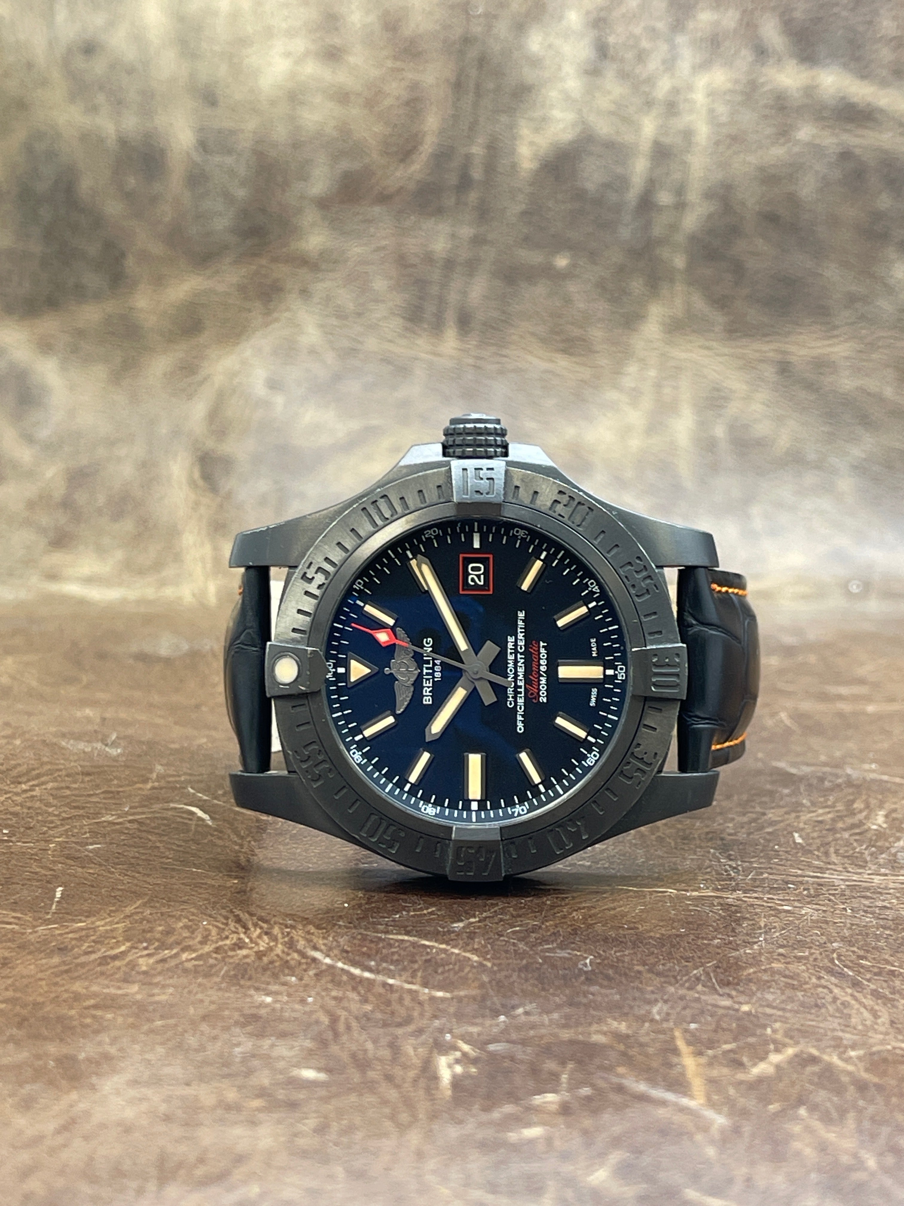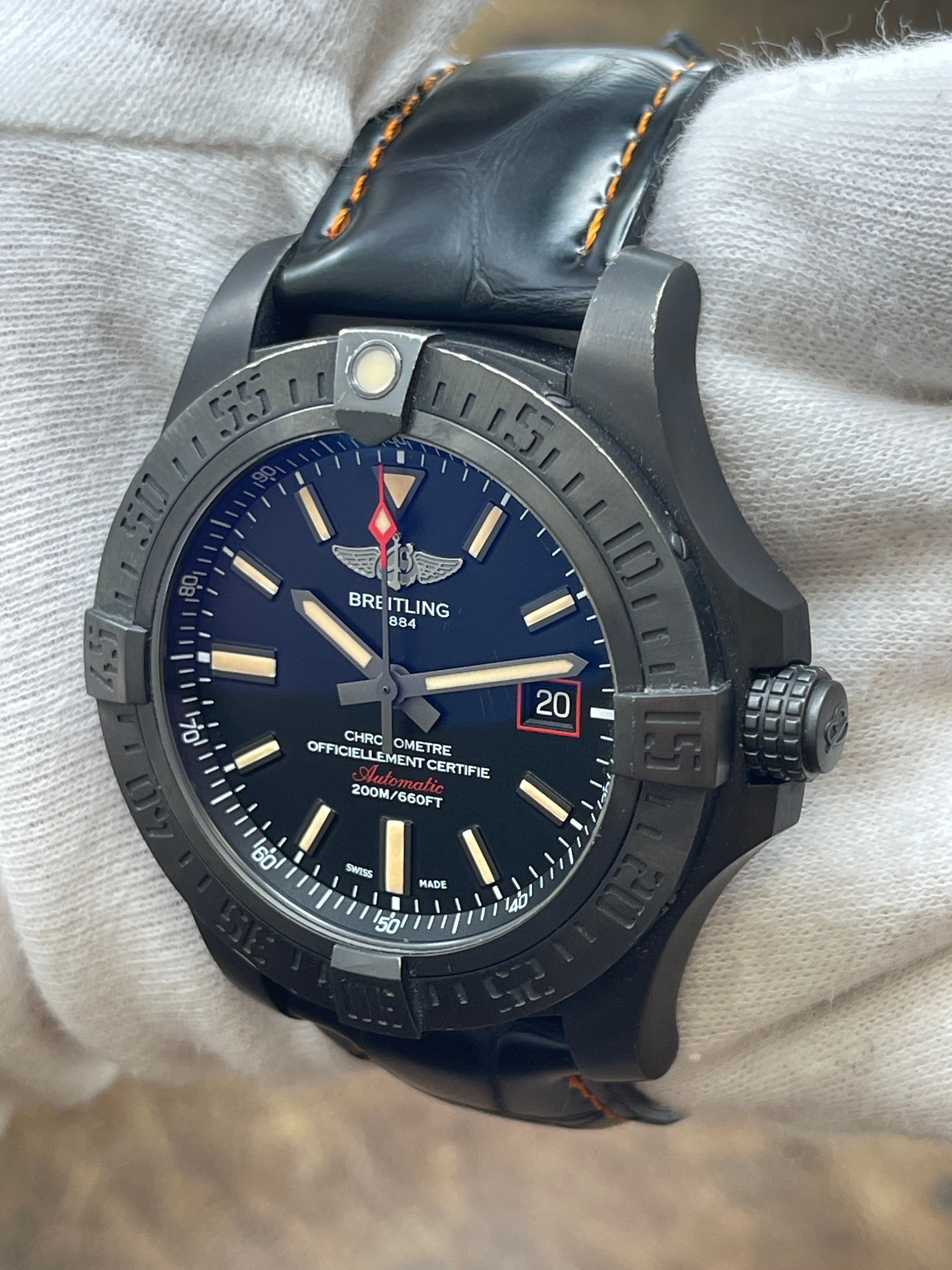 Dlc titanium case with a custom leather strap custom leather. Uni-directional rotating titanium with pvd or dlc coating bezel. Black dial with luminous grey hands and index hour markers. Dial type: analog. Breitling 17 automatic movement with about 38 of power reserve. Cambered sapphire, glareproofed both sides crystal. Screw-locked, two gaskets crown. Solid case back. Case size: 44 mm. Case thickness: 12.7 mm. Round case shape. Band width: mm. Tang buckle clasp. Water resistant at 200 meters / 660 feet. Functions: date, hour, minute, seconds,. Breitling Avenger Blackbird V17311 Black Dial Automatic Men's Watch.