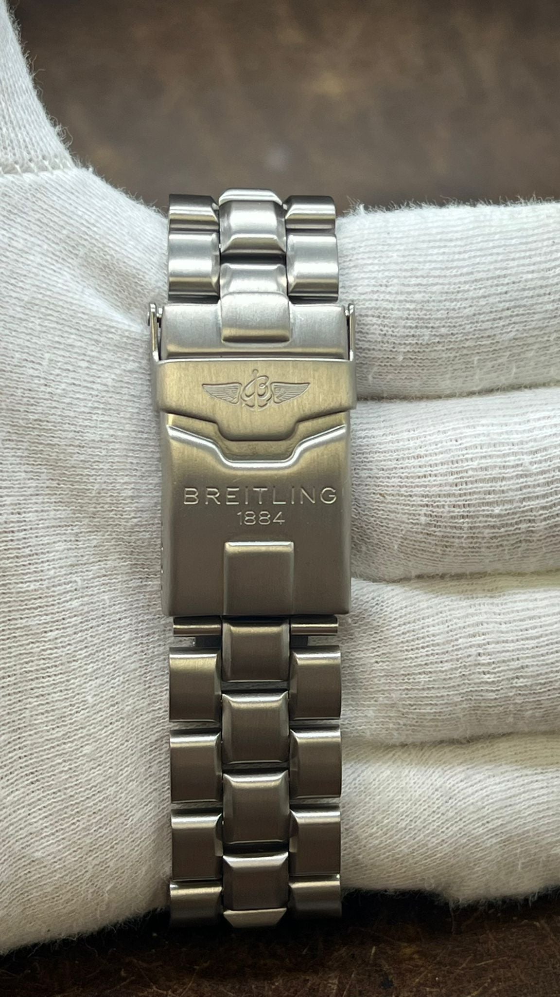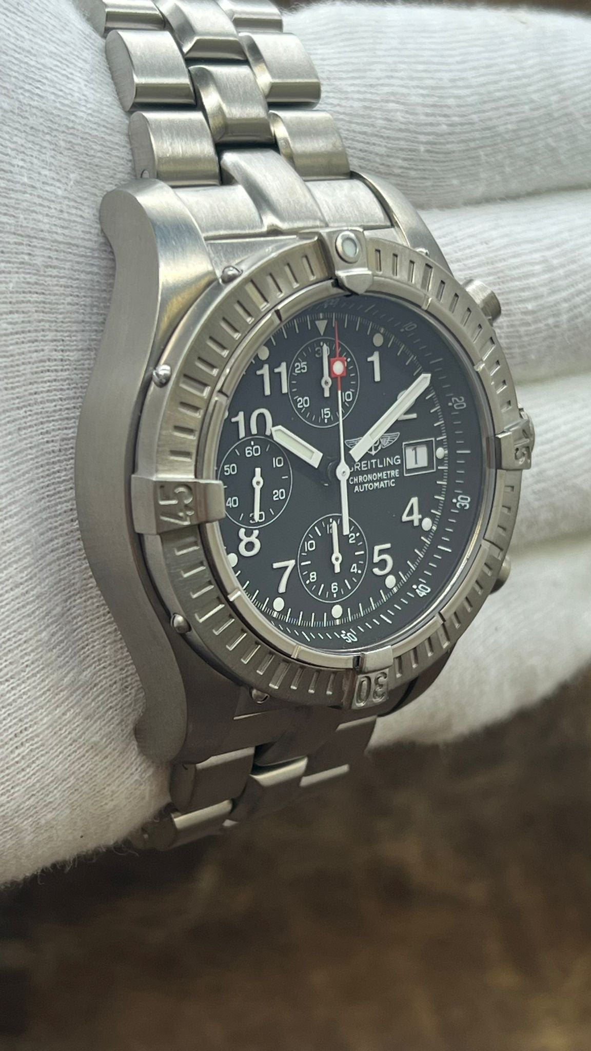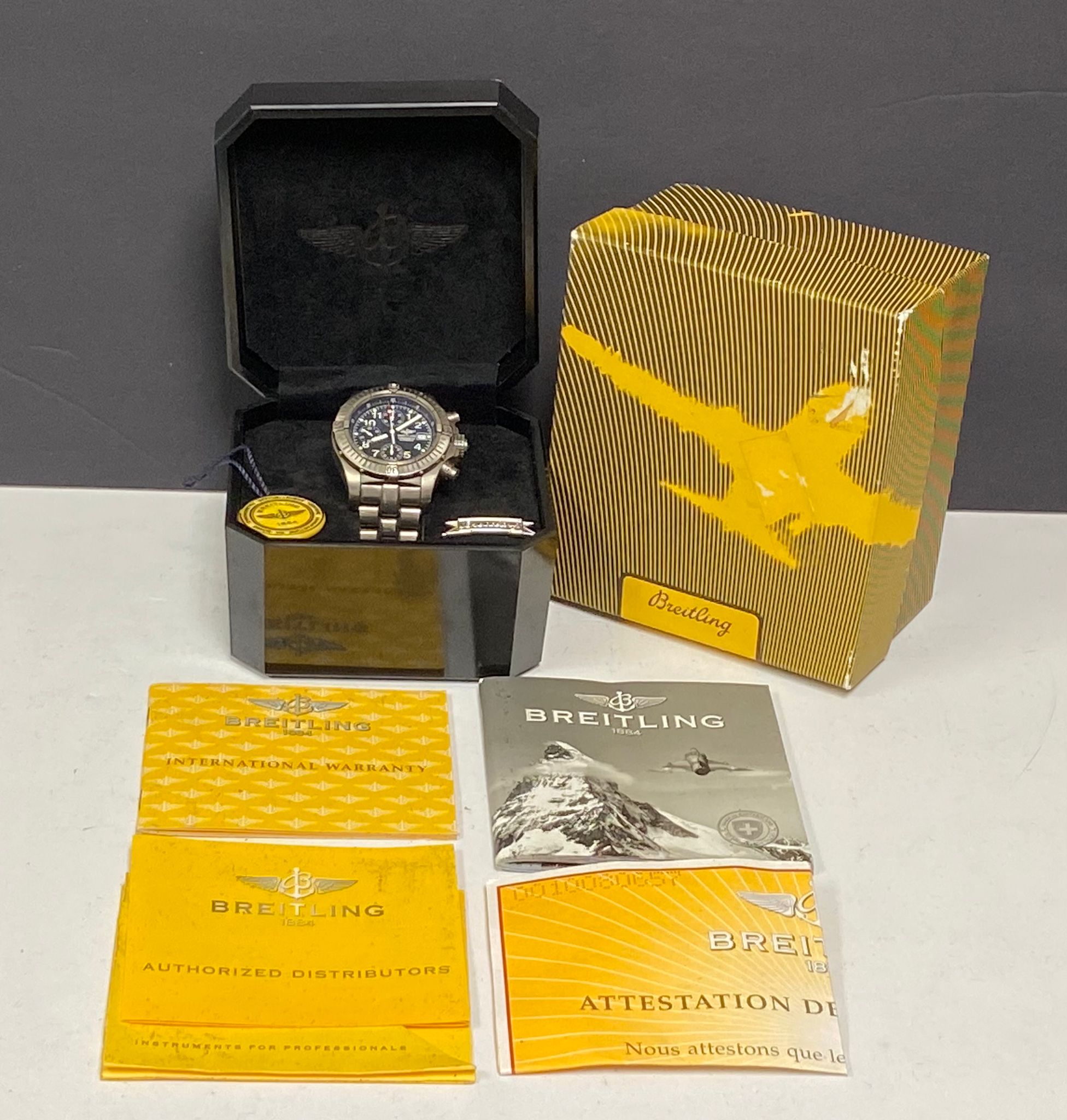 This pre-owned Breitling Avenger Chronograph Titanium 44mm B&P E13360 is in excellent condition and comes with: original Breitling double box, booklets, tag and matching warranty papers. Max wrist size: 6.5 in.