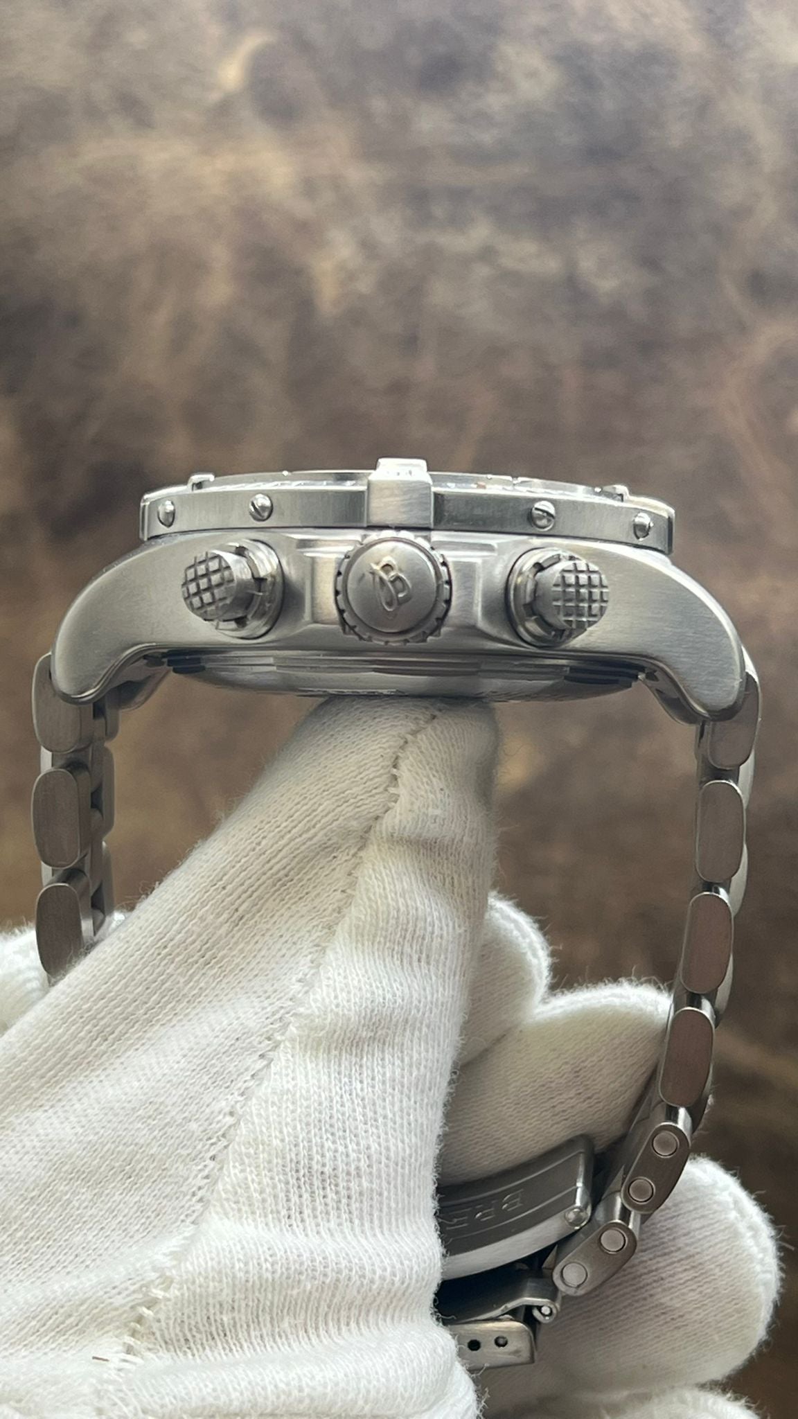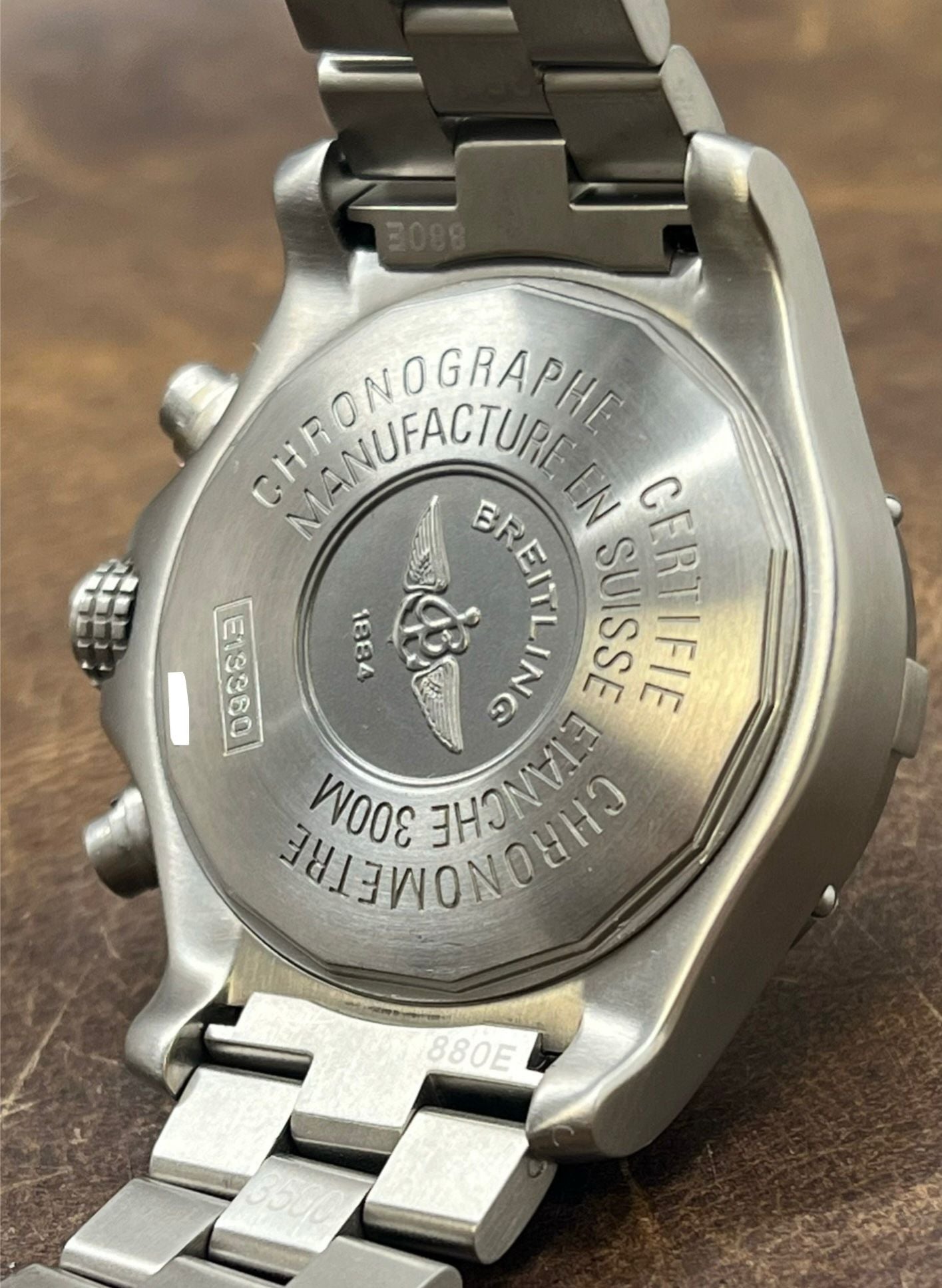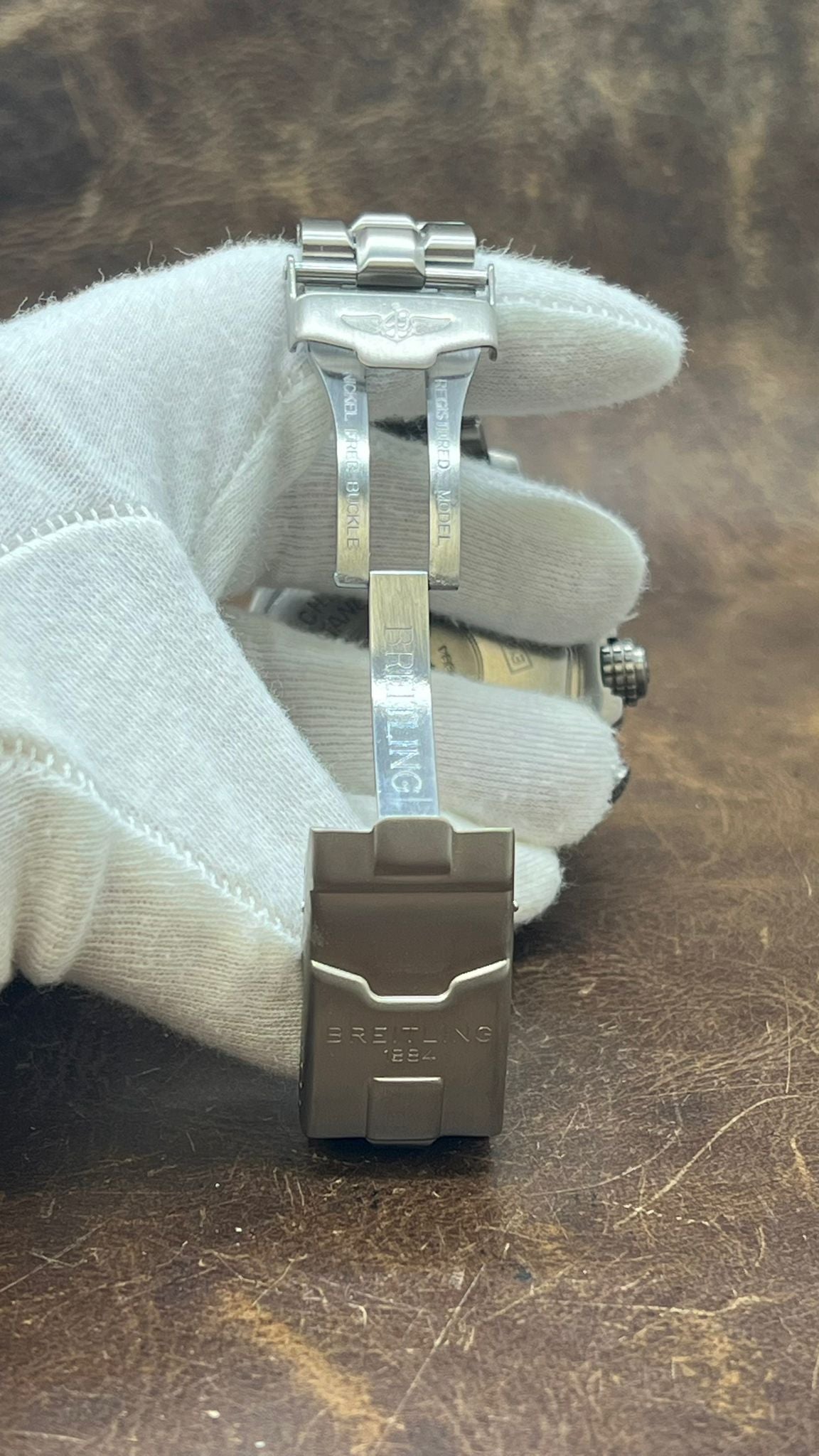 This pre-owned Breitling Avenger Chronograph Titanium 44mm B&P E13360 is in excellent condition and comes with: original Breitling double box, booklets, tag and matching warranty papers. Max wrist size: 6.5 in.