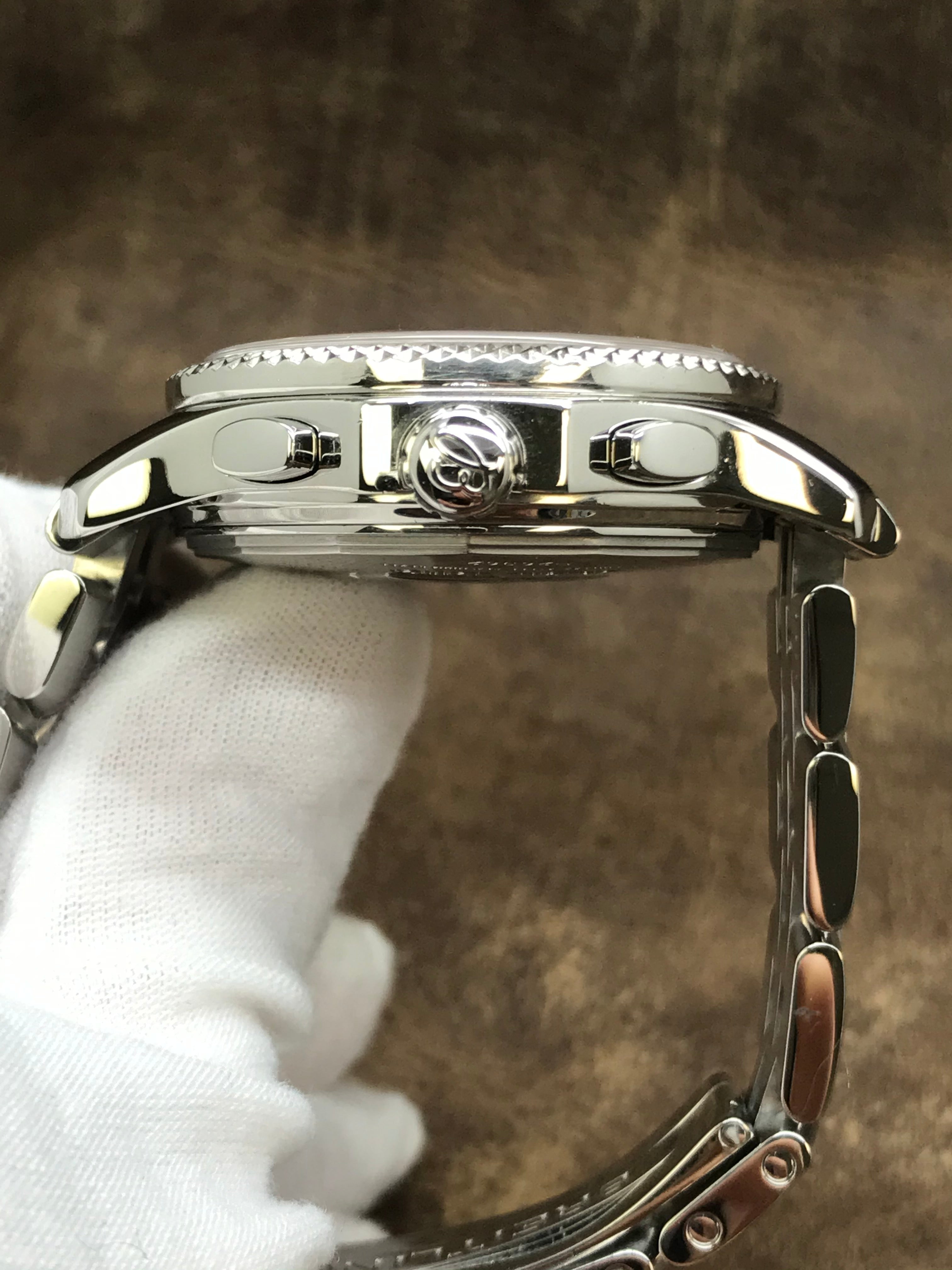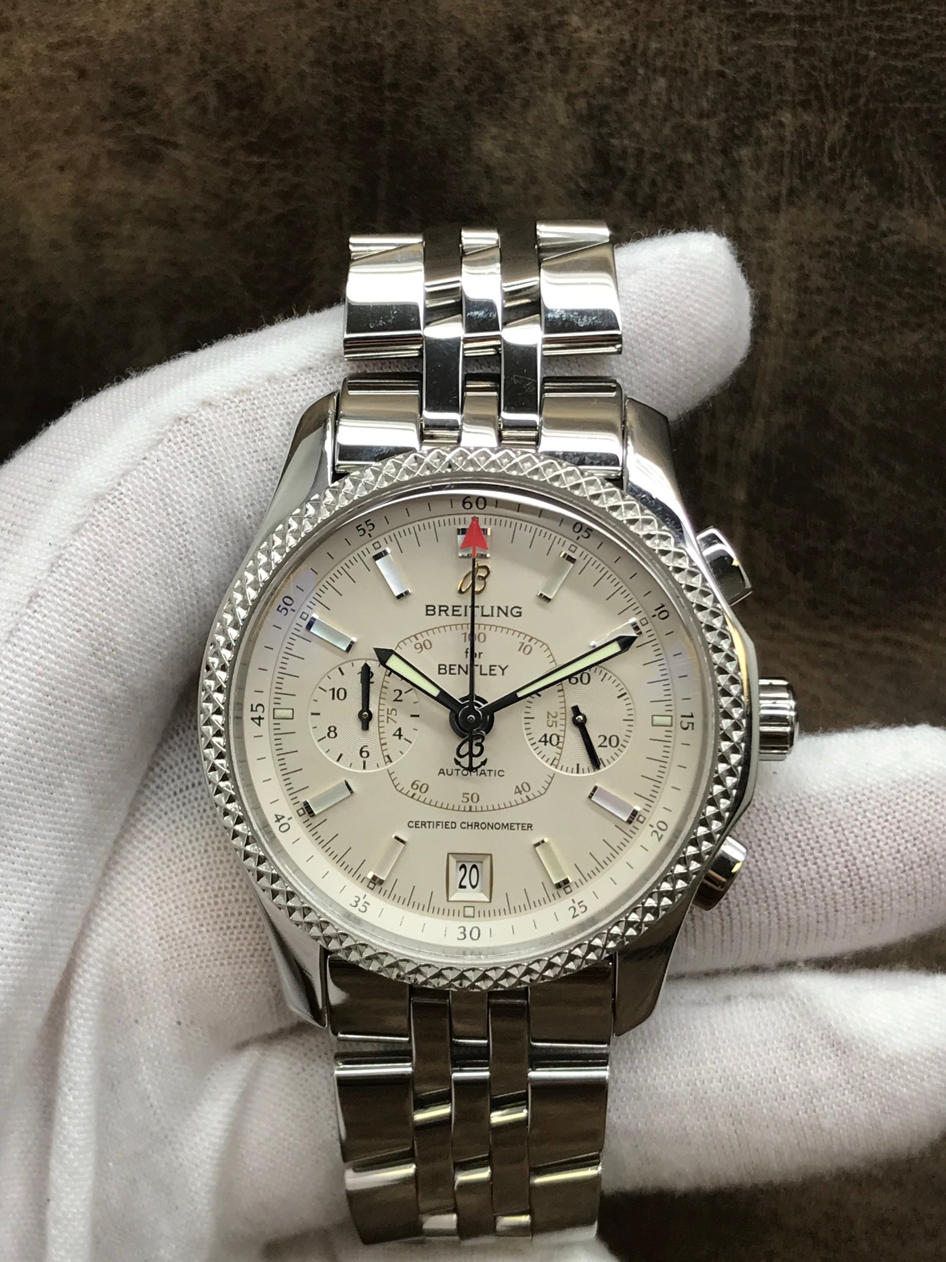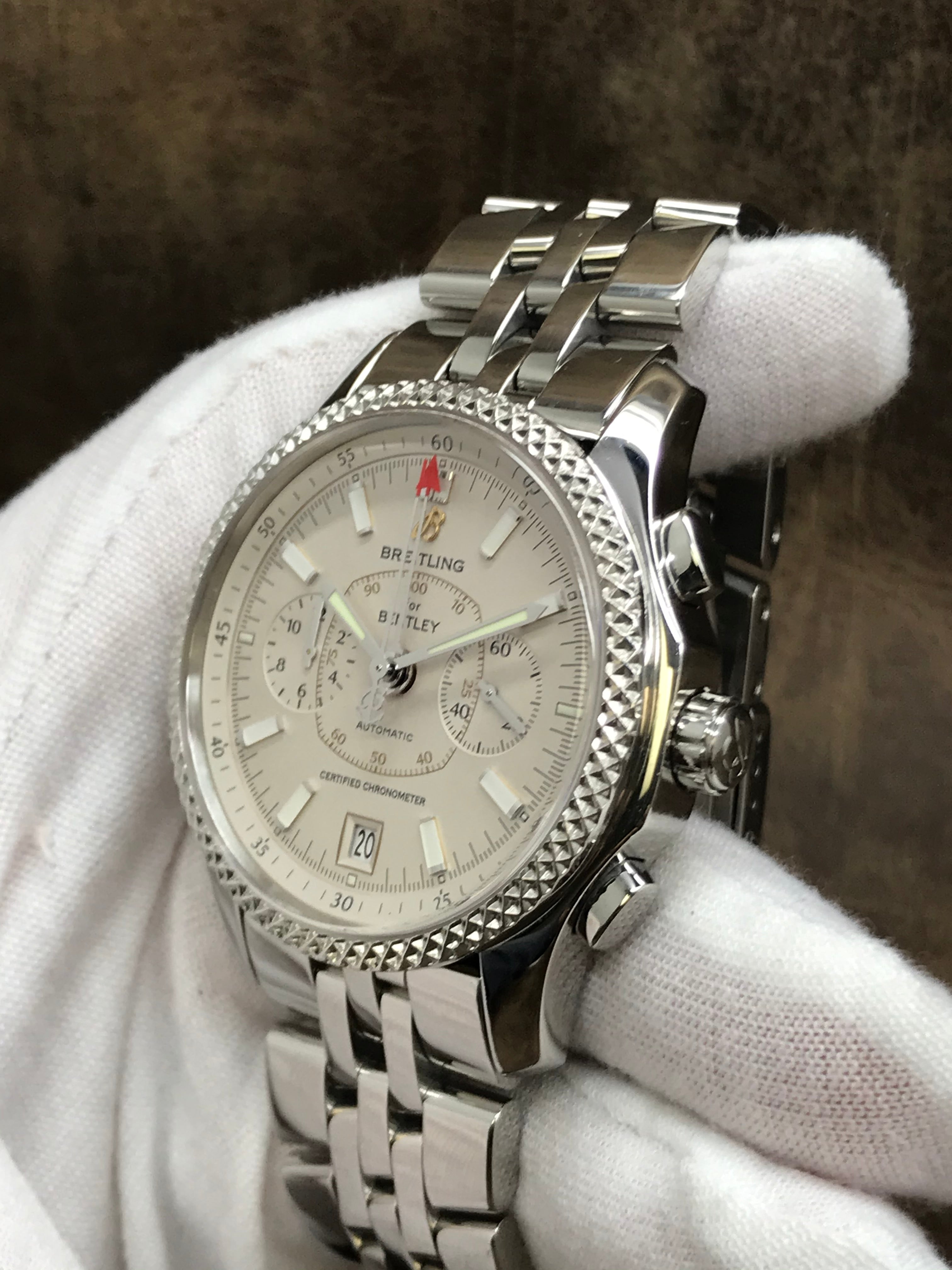 Stainless steel case with a stainless steel bracelet. Fixed platinum bezel. Silver-white dial with silver-tone hands and stick hour markers. Dial type: analog. Luminescent hands and markers. Breitling calibre 26 automatic movement with about 42 hours of power reserve. Scratch resistant sapphire crystal. Screw locked crown. Solid case back. Case size: 42 mm. Case thickness: 16 mm. Round case shape. Band width: mm. Deployment clasp. Water resistant at 100 meters / 330 feet. Functions: chronograph, chronometer, date, hour, minute, second. Breitling Bentley P2636212/G611 Silver-white Dial Automatic Men's Watch.