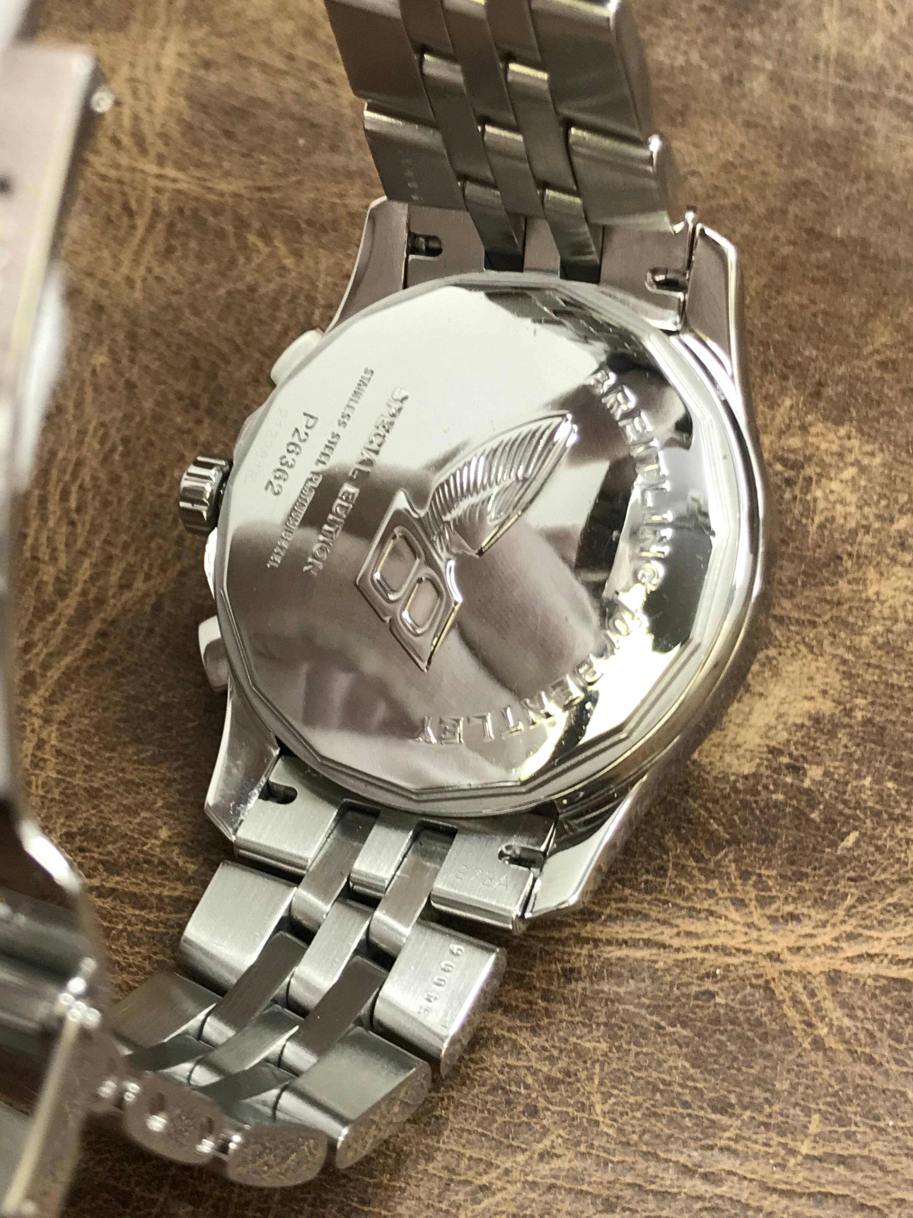 This pre-owned Breitling Bentley P2636212/G611 is in excellent condition and comes with: Box & Papers. The outer box is damaged and the inner black pouch is peeling heavily. Max wrist size: 7.5 in.