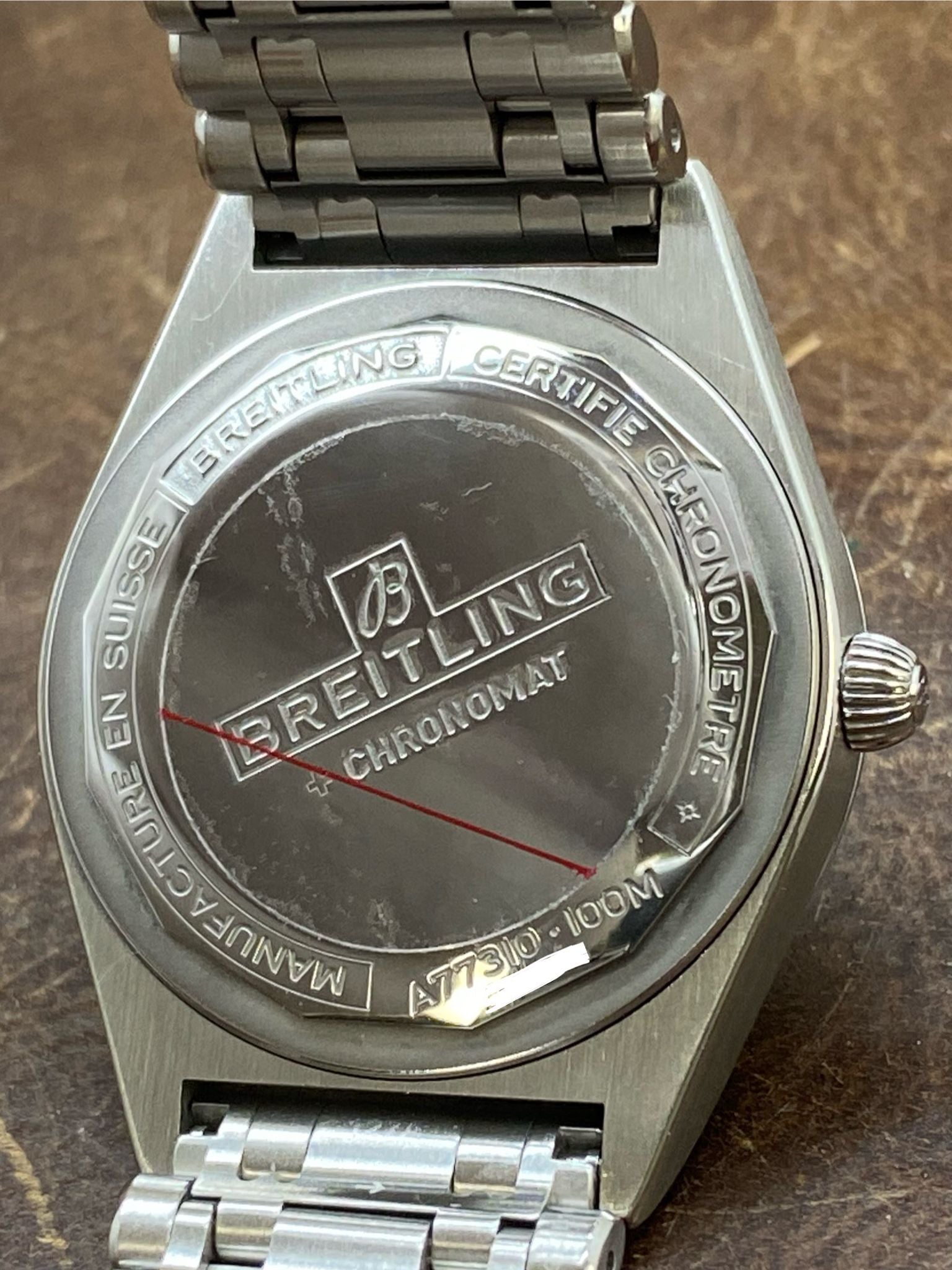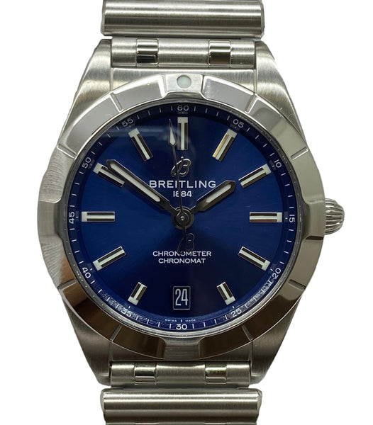Stainless steel case with a stainless steel bracelet. Fixed stainless steel bezel. Blue dial with luminous silver-tone hands and index hour markers. Dial type: analog. Breitling 77 superquartz movement with about approx. 3-4 year battery life of power reserve. Cambered sapphire, glareproofed both sides crystal. Non screw-locked, two gaskets crown. Solid case back. Case size: 32 mm. Case thickness: 8.5 mm. Round case shape. Band width: mm. Double fold-over with push button release clasp. Water resistant at 100 meters / 330 feet. Functions: date, hour, minute, seconds, chronometer. Breitling Chronomat 32mm A77310101C1A1 Blue Dial SuperQuartz Women's Watch.
