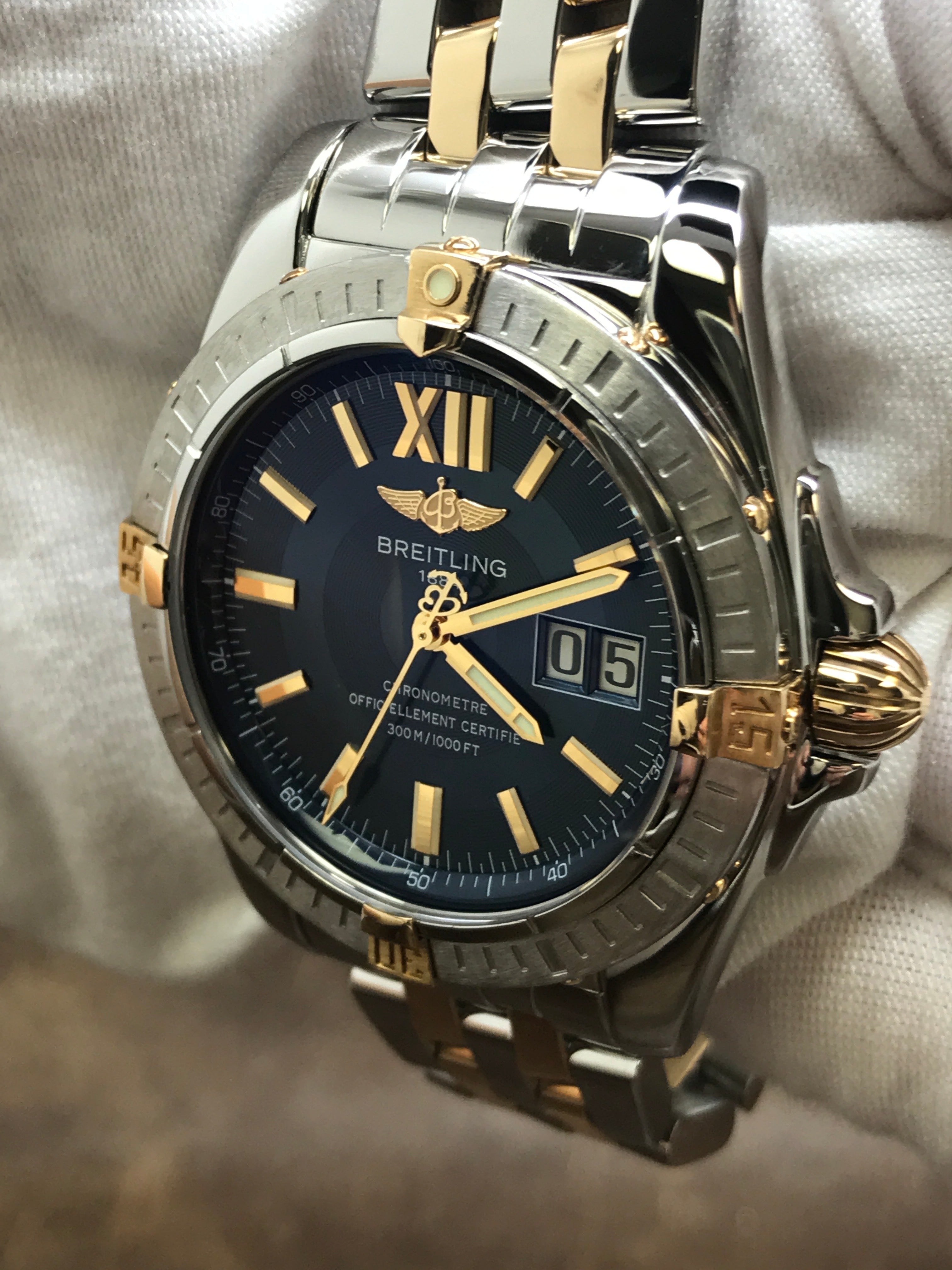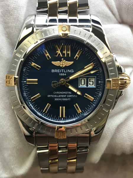 Stainless steel and 18kt yellow gold case with a stainless steel & 18k yellow gold bracelet. Uni-directional rotating stainless steel and gold bezel. Black dial with gold tone with luminous hands and luminous index hour markers. Dial type: analog. Breitling calibre 49 automatic movement with about 42 hours of power reserve. Scratch resistant sapphire crystal. Screw down crown. Solid case back. Case size: 41 mm. Case thickness: 14 mm. Round case shape. Band width: mm. Double locking deployant clasp. Water resistant at 200 meters / 660 feet. Functions: hours, minutes, seconds, big date. Breitling Cockpit Windrider B49350 Black Dial Automatic Men's Watch.
