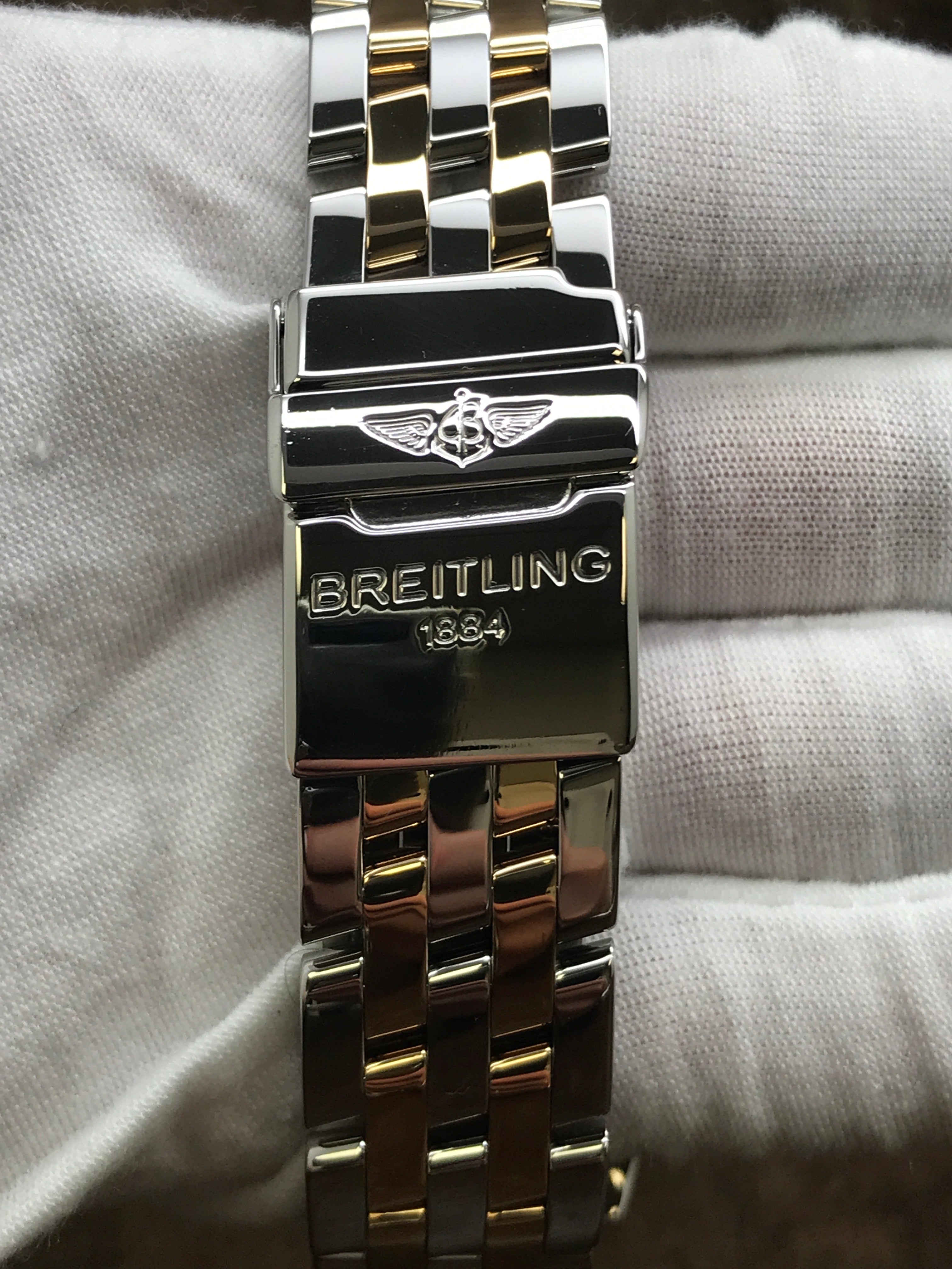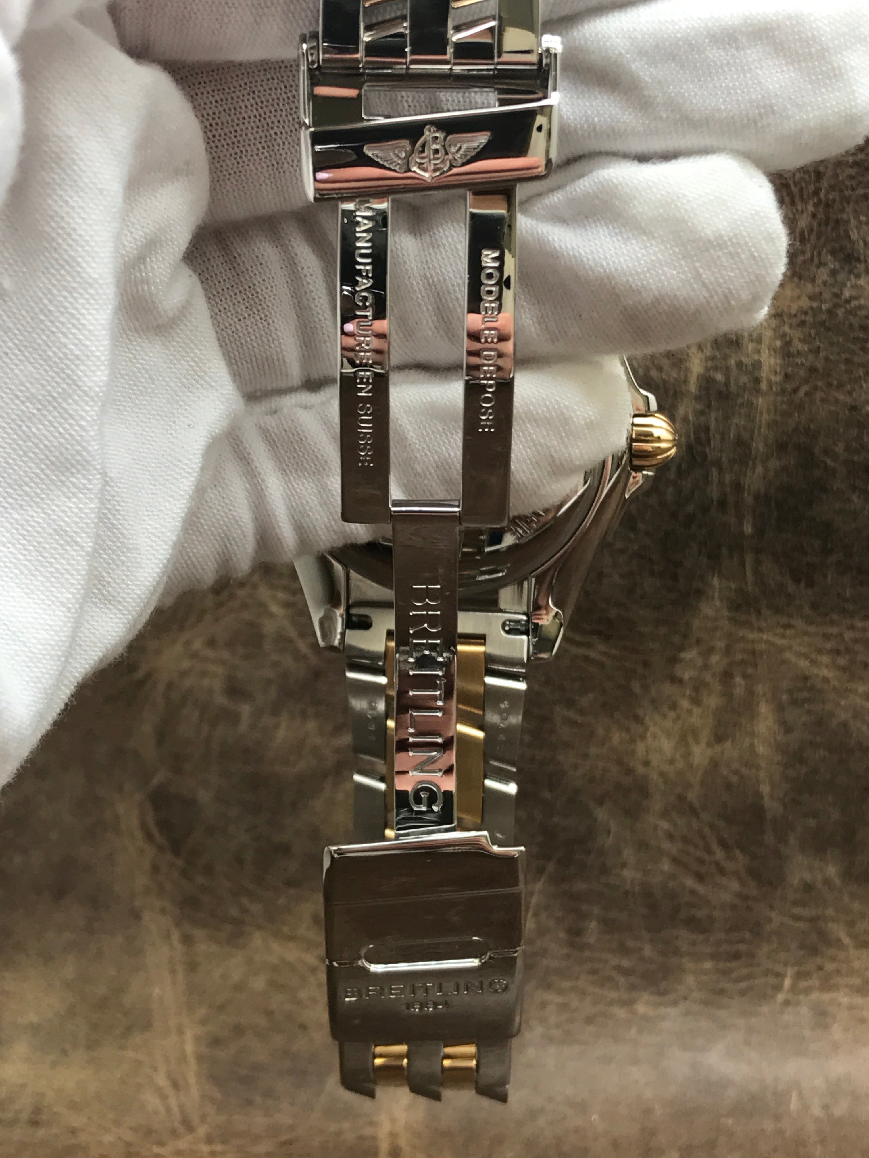 This pre-owned Breitling Cockpit Windrider B49350 is in excellent condition and comes with: original Breitling double box, tags, booklets & matching warranty papers. The inner box and the pouch are peeling badly. Max wrist size: 7.5 in.