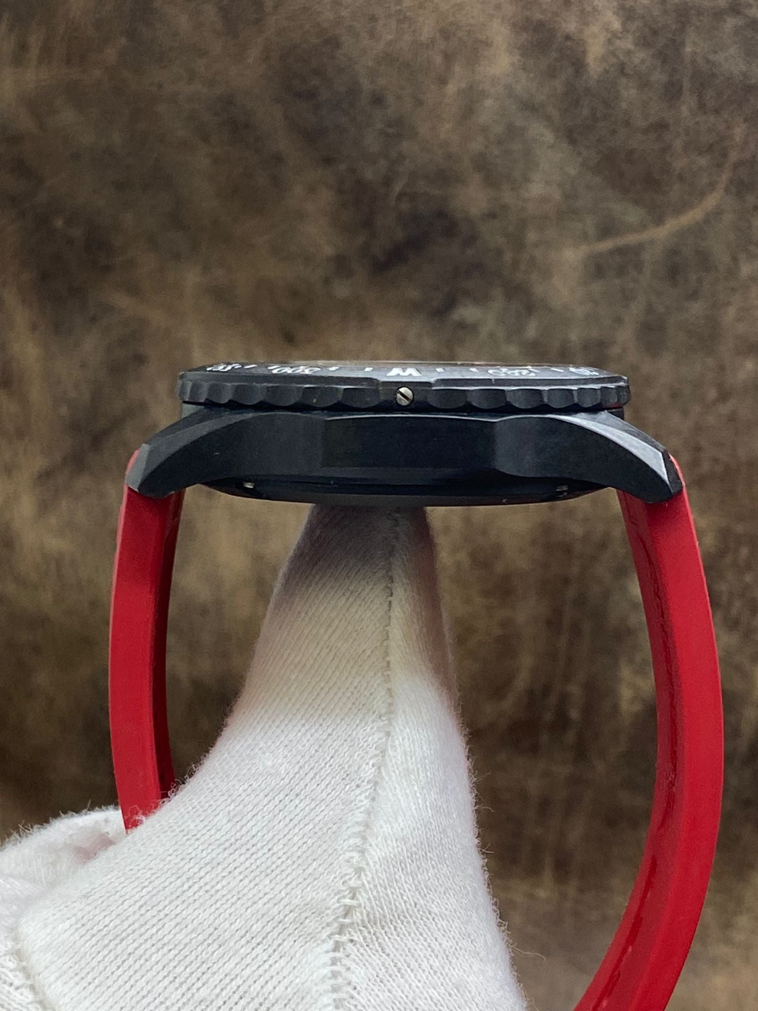 Breitlight case with a rubber strap. Bidirectional, compass scale breitlight® bezel. Red dial with luminous silver-tone hands and Arabic numerals hour markers. Dial type: analog. Breitling 82 superquartz movement with about of power reserve. Sapphire, glareproofed both sides crystal. Non screw-locked, two gaskets crown. Solid case back. Case size: 44 mm. Case thickness: 12.5 mm. Round case shape. Band width: mm. Tang buckle clasp. Water resistant at 100 meters / 330 feet. Functions: chronograph, date, hour, minute, seconds, compass scale, pulsometer. Breitling ENDURANCE PRO IronMan X82310 Red Dial SuperQuartz Men's Watch.