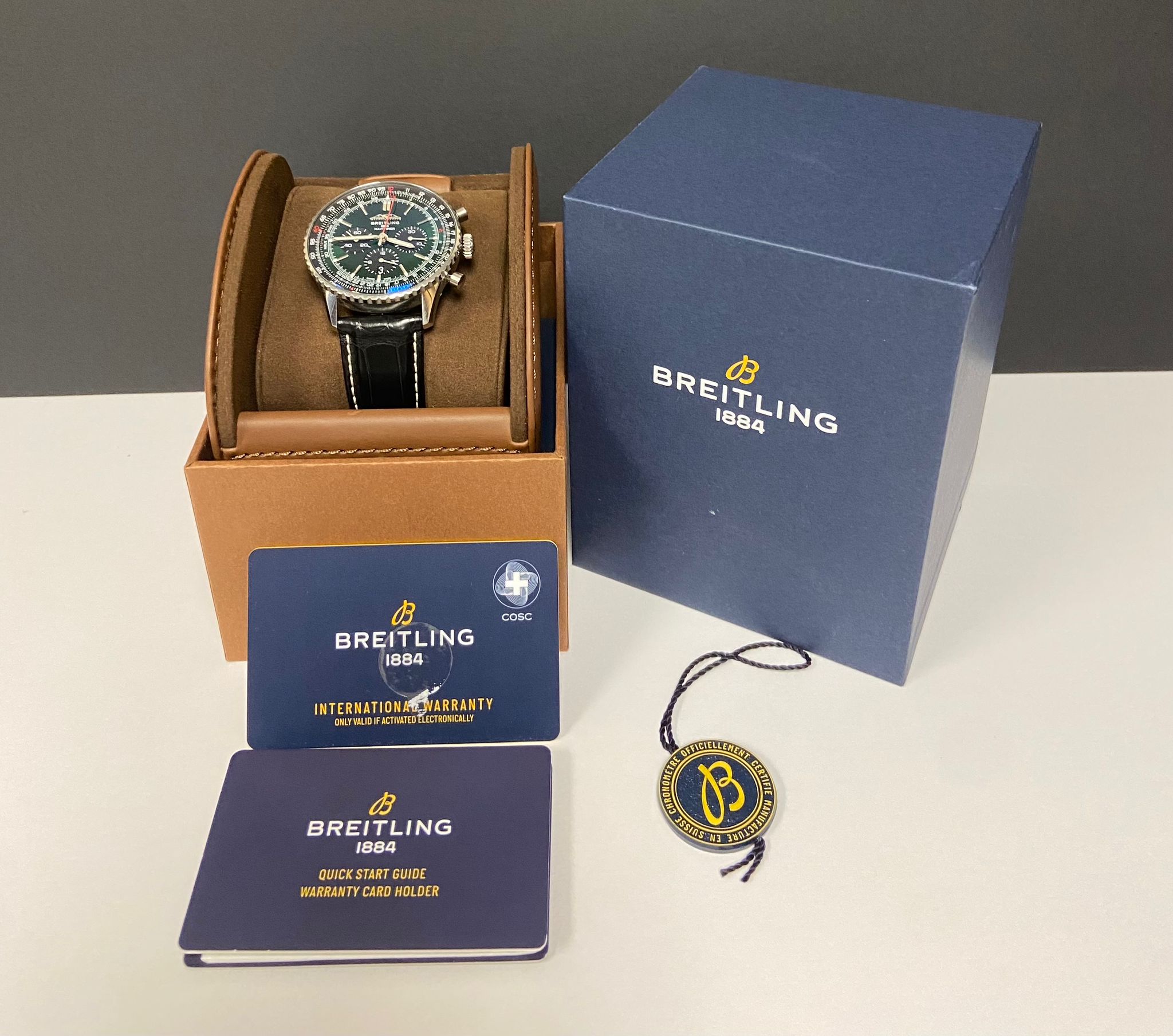 - original Breitling double box, booklet, tag and matching warranty card activated Dec 2022 with valid FACTORY warranty until Dec 2027