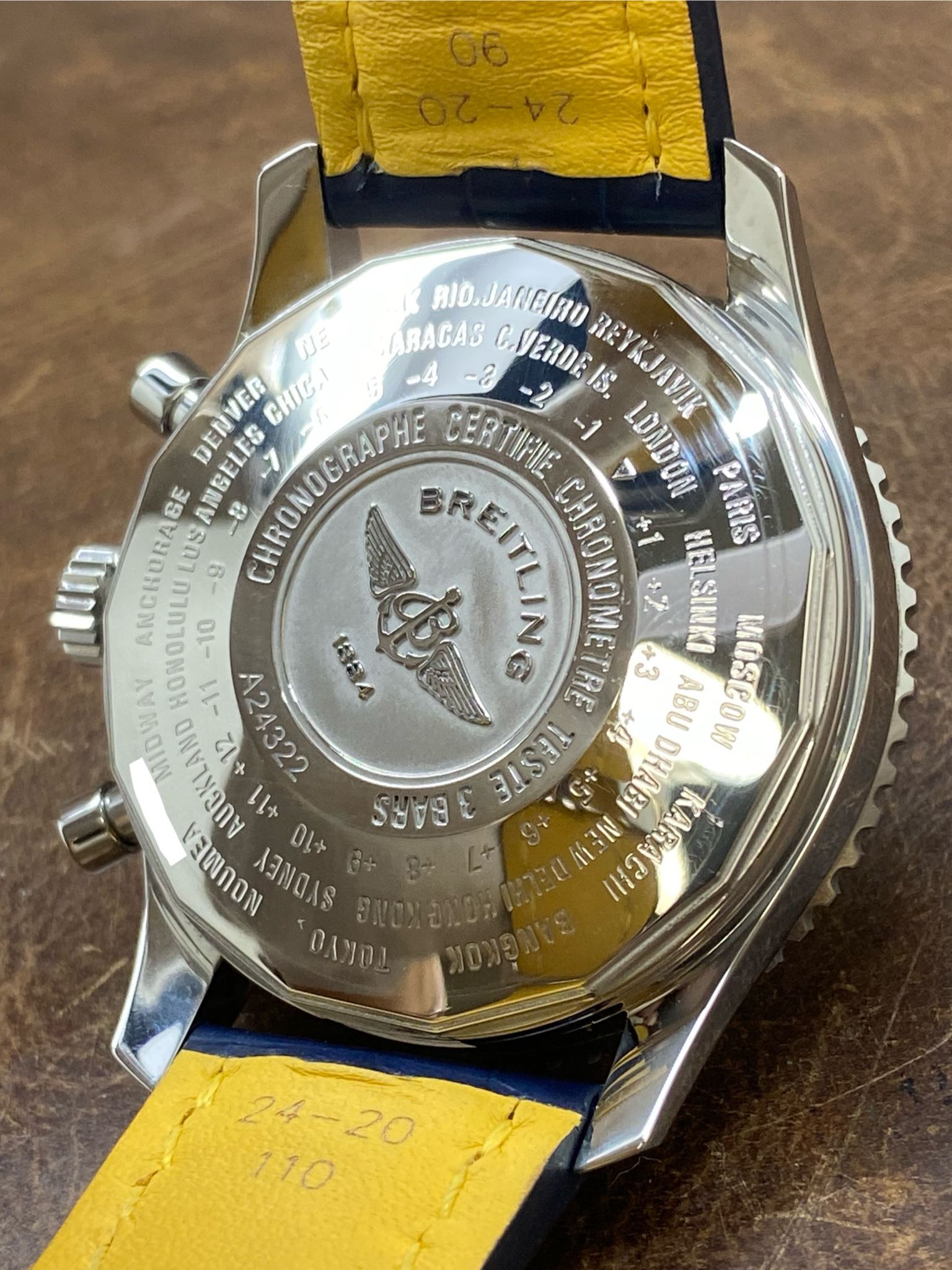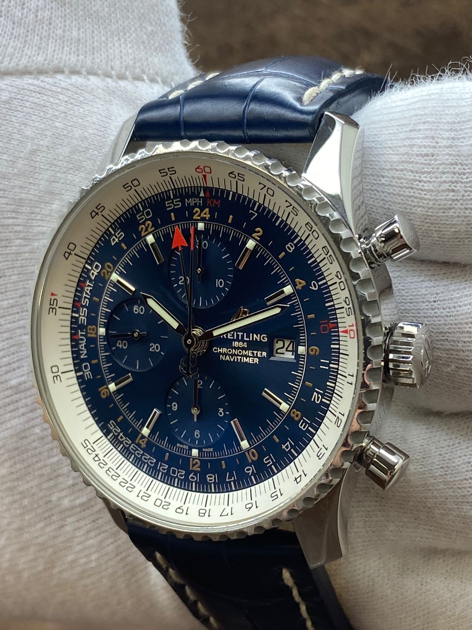 This pre-owned Breitling Navitimer Chronograph 46 GMT A24322121C2P2 is in mint condition and comes with: original Breitling double box, booklets, extra brown leather strap and matching warranty card. Max wrist size: 7.25 in.