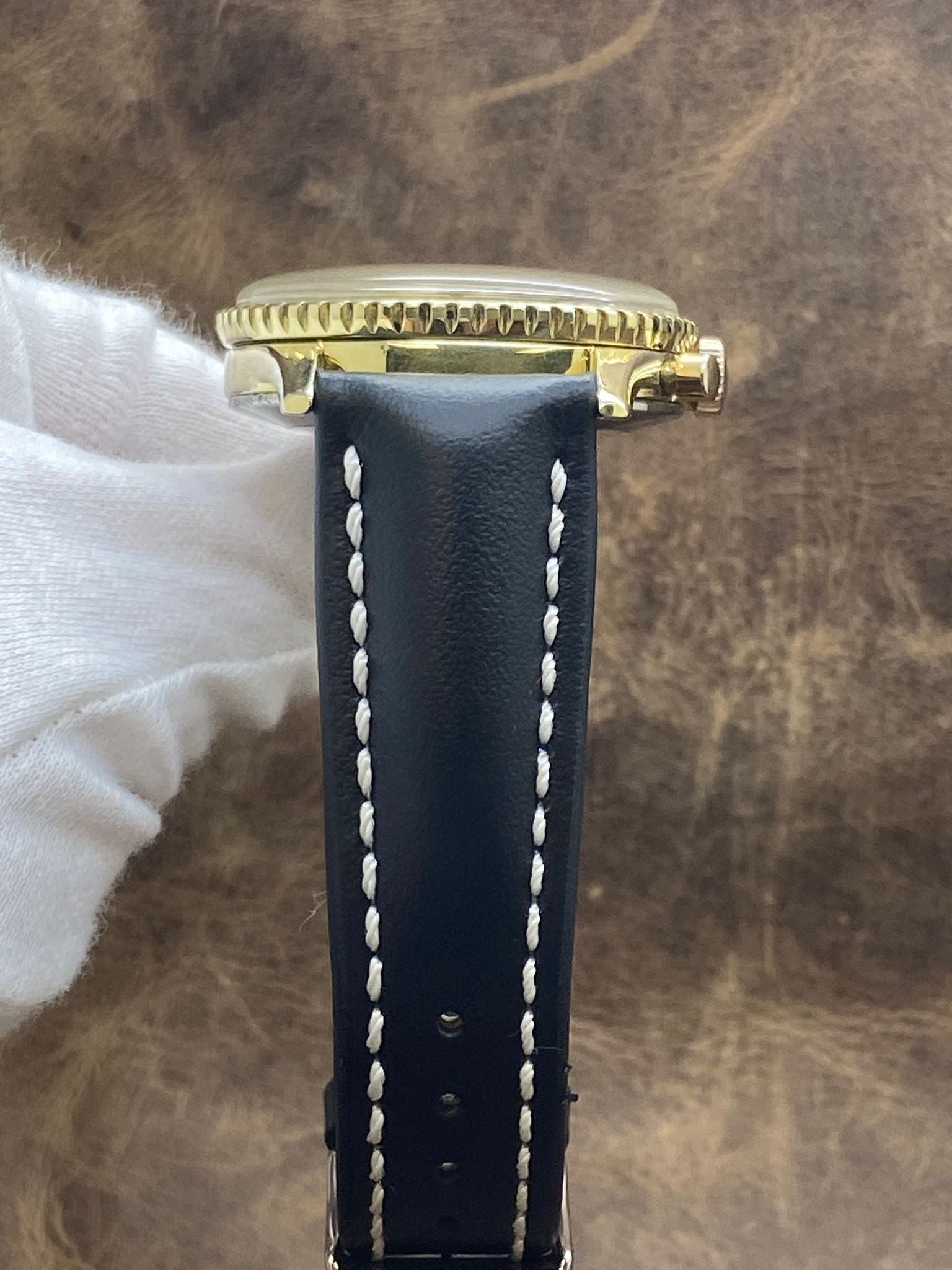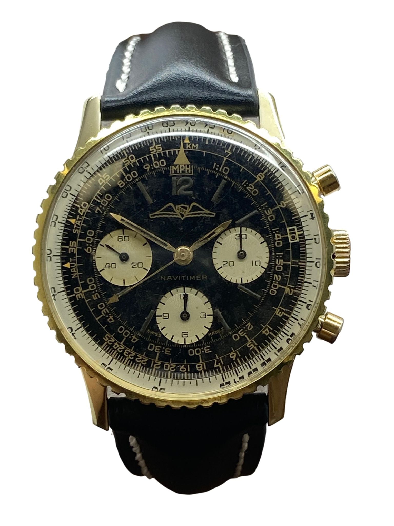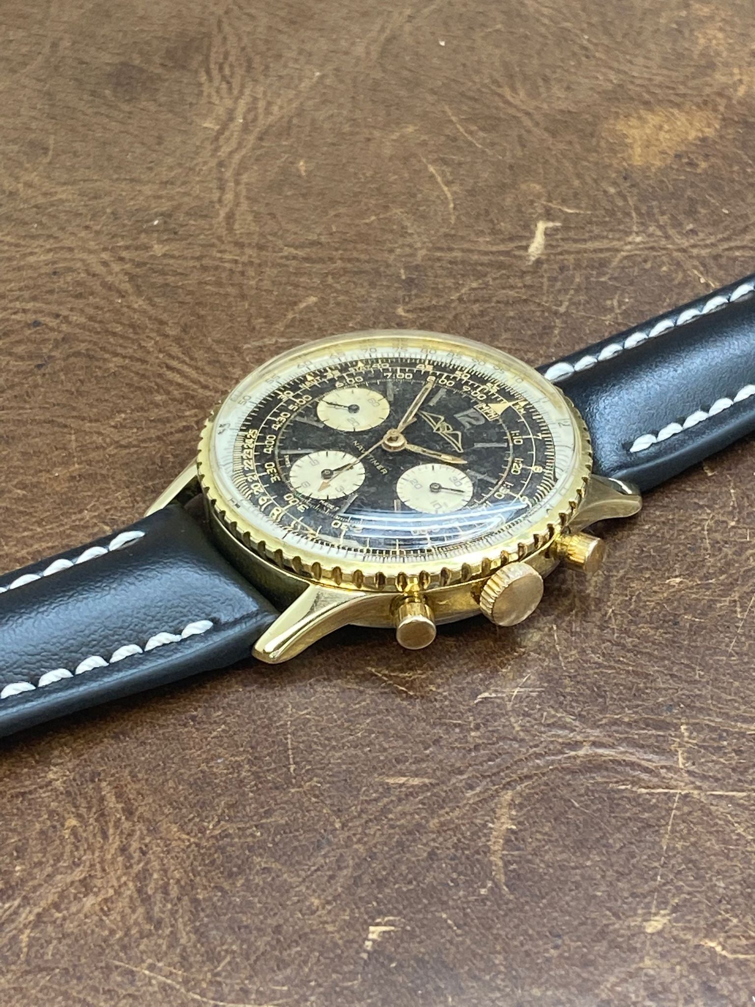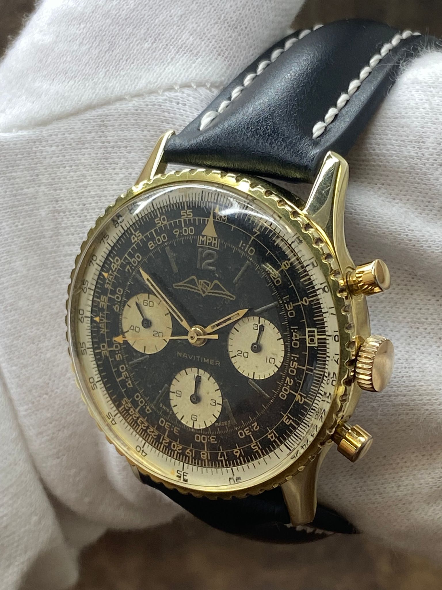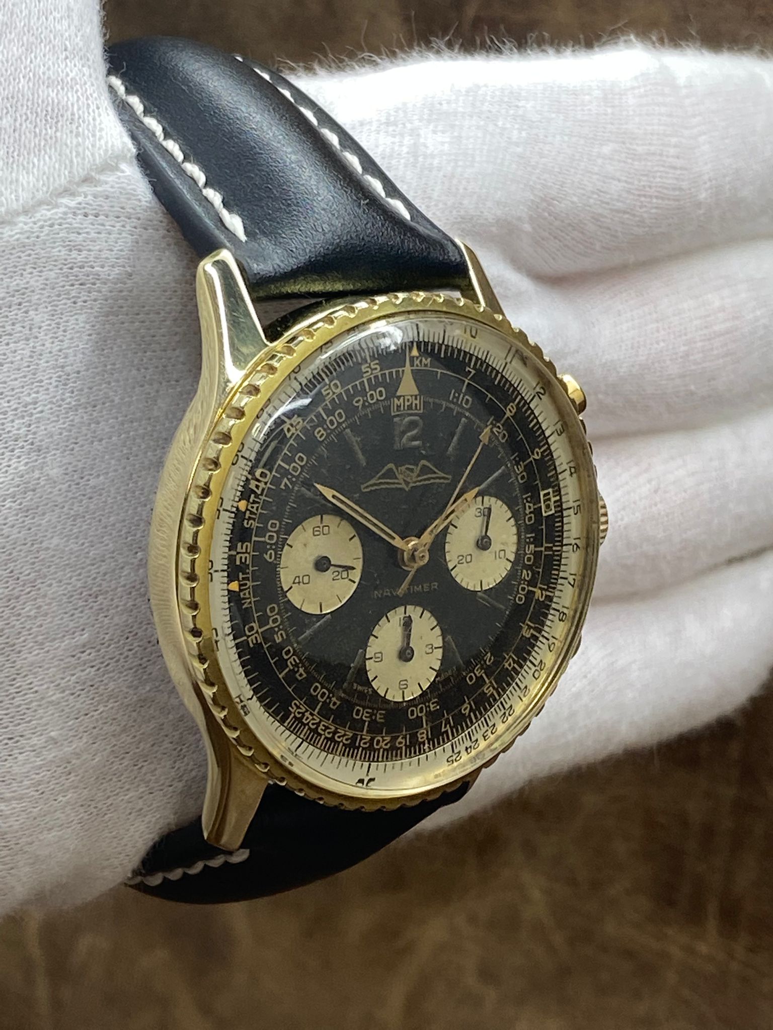 Stainless steel case with a custom leather strap custom leather strap. Bi-directional rotating slide rule gold plated stainless steel bezel. Black panda dial with gold-tone hands and index & 12 Arabic hour markers. Dial type: analog. Venus 178 manual winding movement with about 70 hours of power reserve. Sapphire crystal. Crown. Solid case back. Case size: 41 mm. Case thickness: mm. Round case shape. Band width: mm. Steel tang clasp. Water resistant at not waterproof. Functions: chronograph, hour, minute, seconds. Breitling Navitimer 41mm AOPA 806 Black Panda Dial Manual Winding Men's Watch.