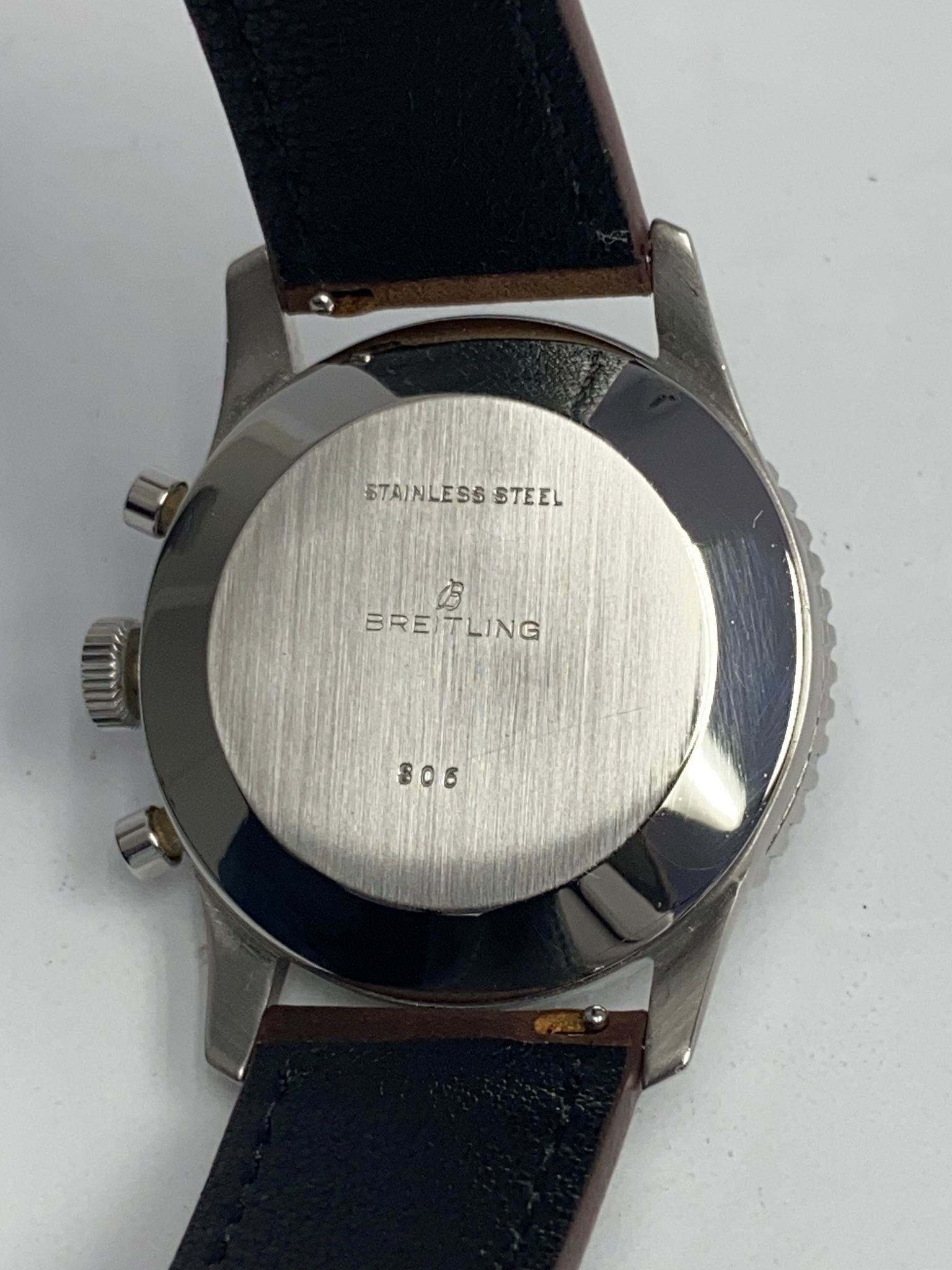 Stainless steel case with a leather custom strap. Bi-directional rotating slide rule stainless steel bezel. Black dial with luminous silver-tone hands and index & 12 Arabic hour markers. Dial type: analog. Venus 178 manual winding movement with about 70 hours of power reserve. Plexiglass crystal. Crown. Solid case back. Case size: 41 mm. Case thickness: mm. Round case shape. Band width: mm. Custom deployment clasp. Water resistant at not waterproof. Functions: chronograph, hour, minute, seconds. Breitling Navitimer 41mm Chronograph 806 Black Dial Manual Winding Men's Watch.