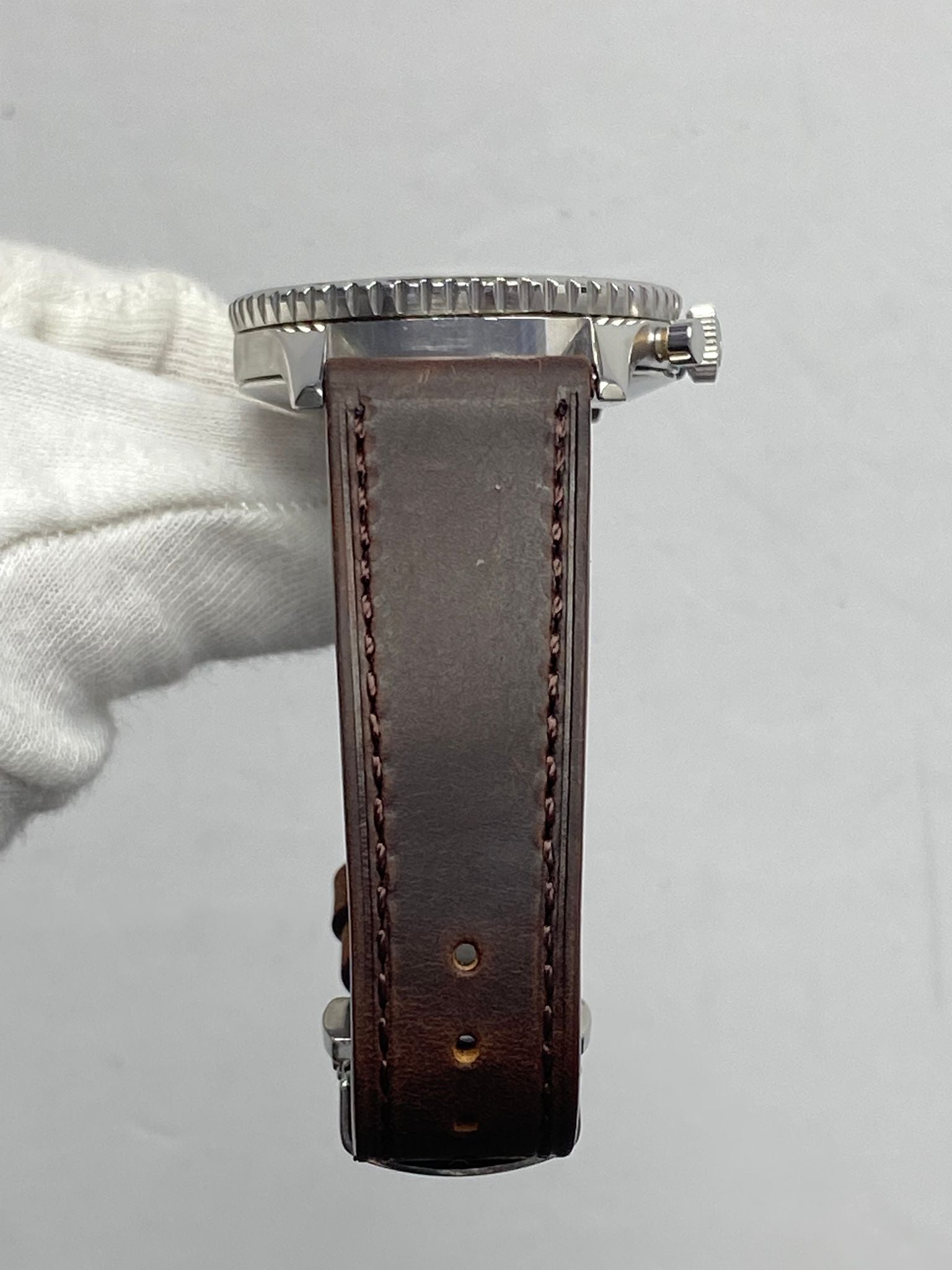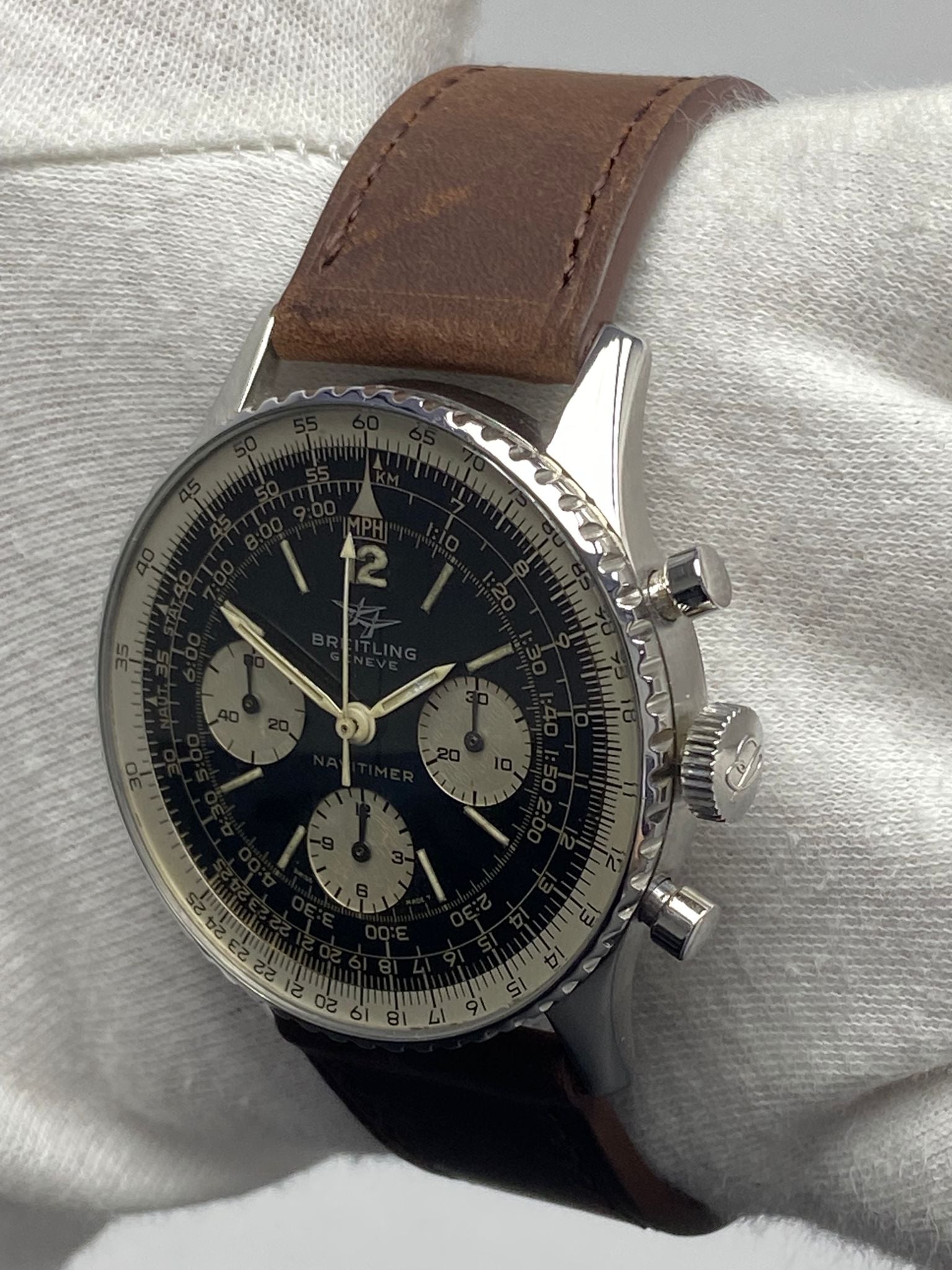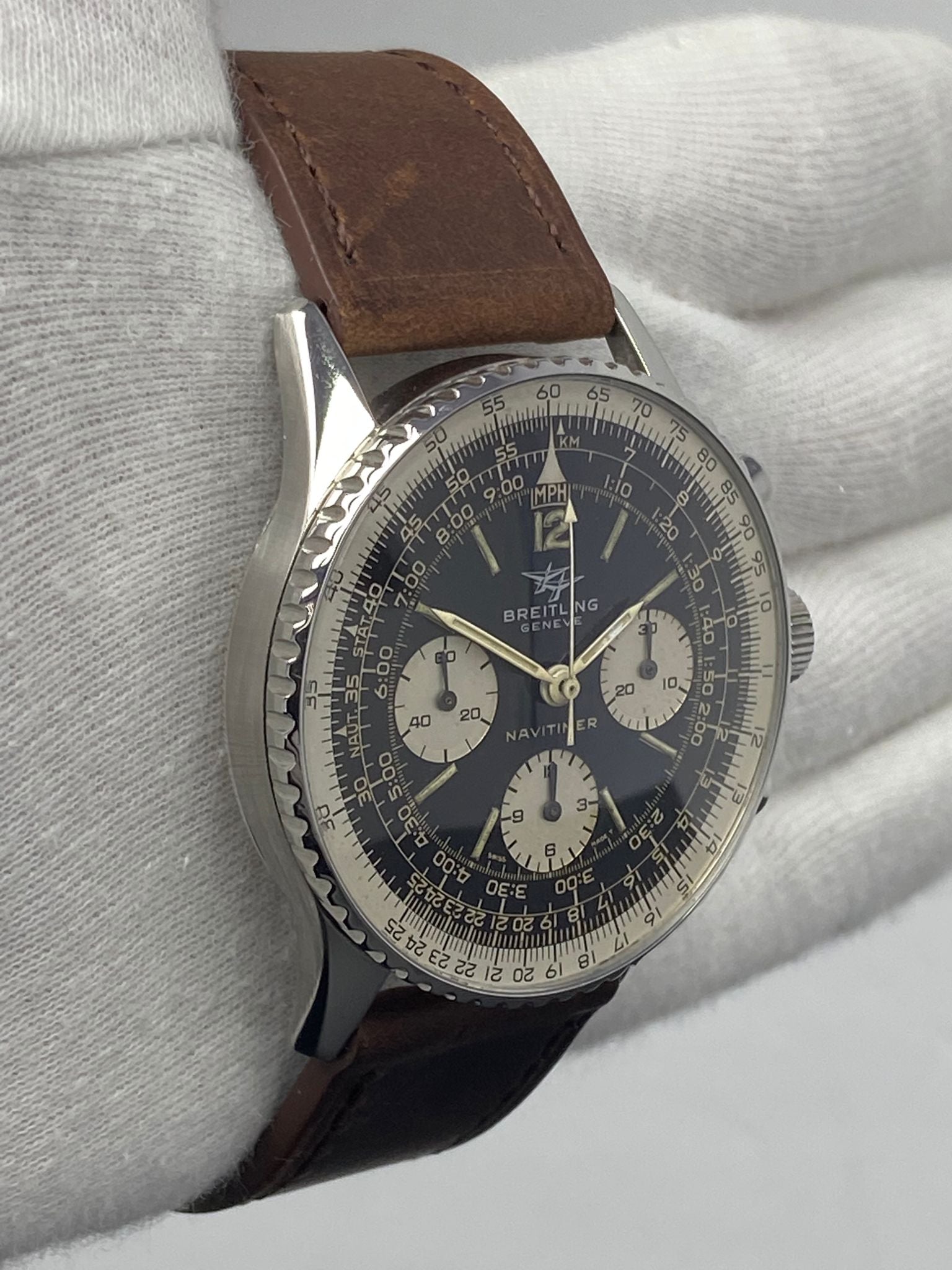 This pre-owned Breitling Navitimer 41mm Chronograph 806 is in very good condition and comes with: NO box or papers. The dial and hands have ageing signs on the lume and the watch comes on a custom brown strap and deployment buckle. Max wrist size: 8 in.