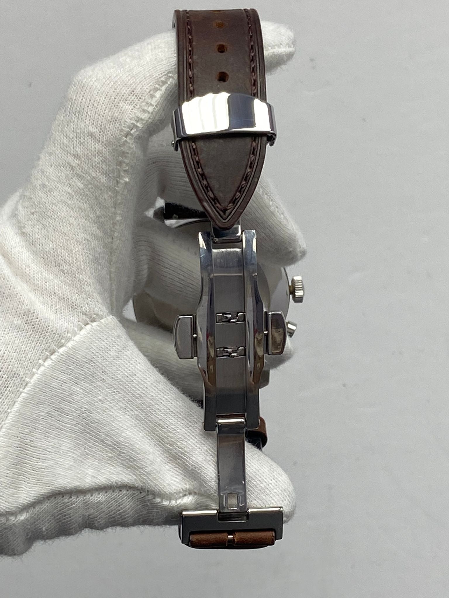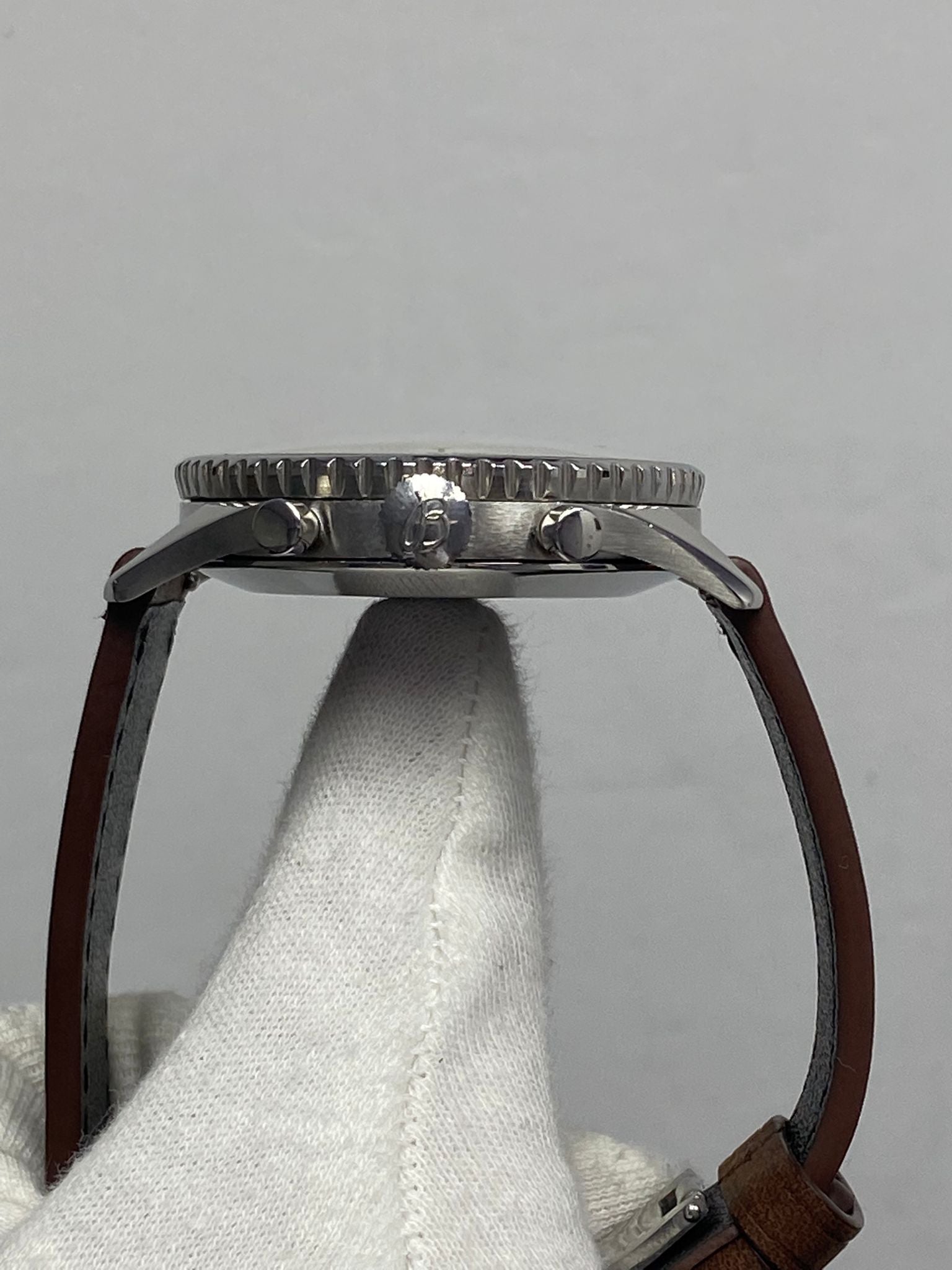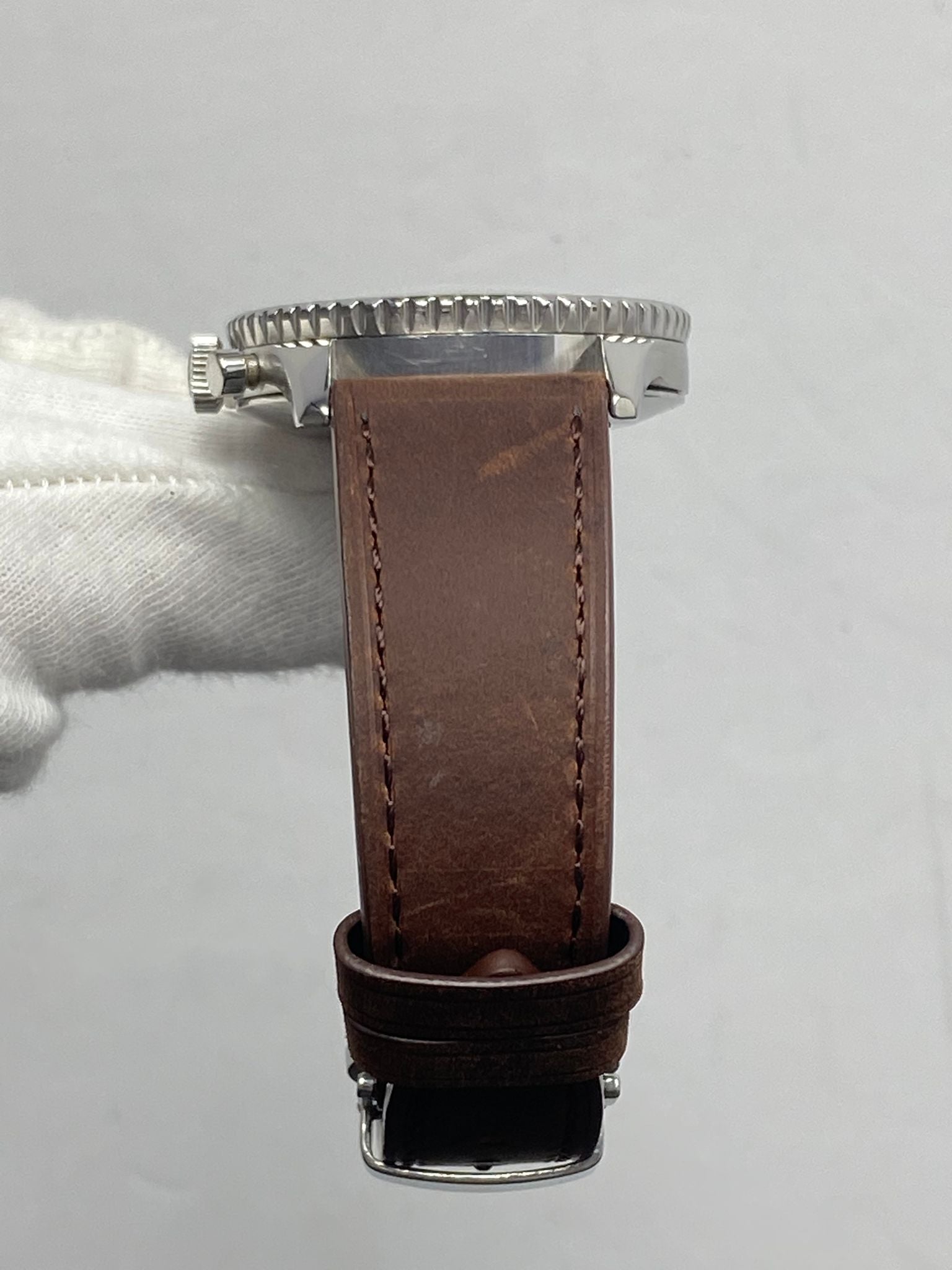 This pre-owned Breitling Navitimer 41mm Chronograph 806 is in very good condition and comes with: NO box or papers. The dial and hands have ageing signs on the lume and the watch comes on a custom brown strap and deployment buckle. Max wrist size: 8 in.
