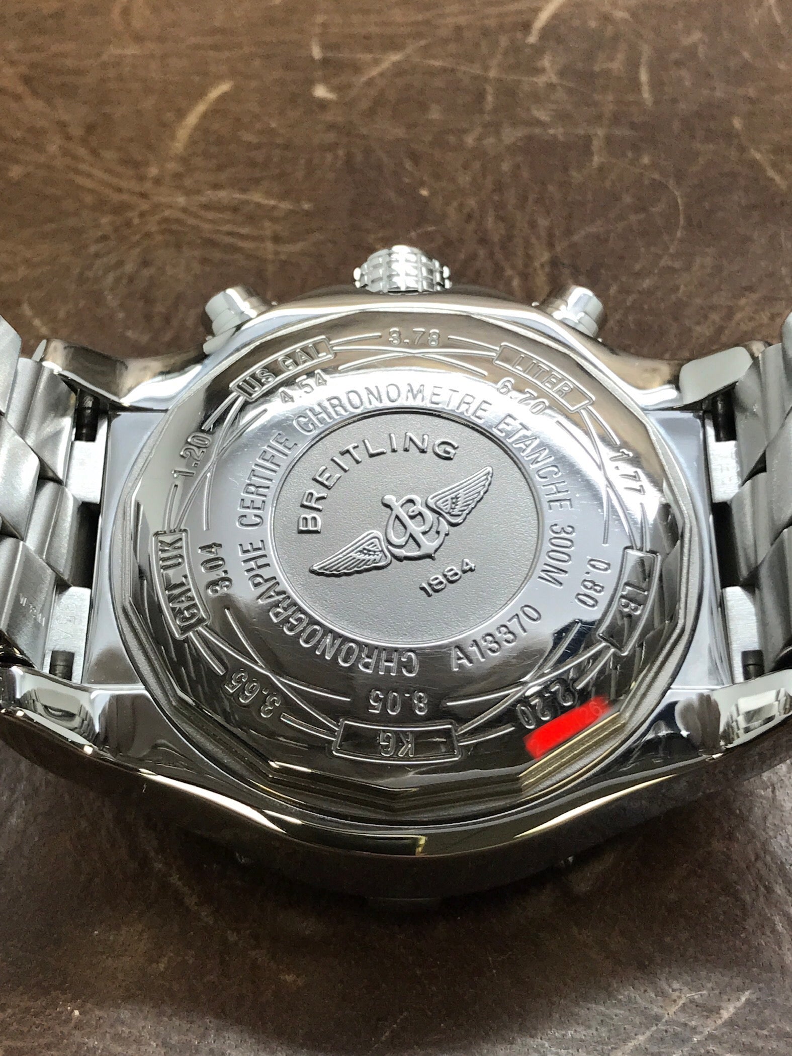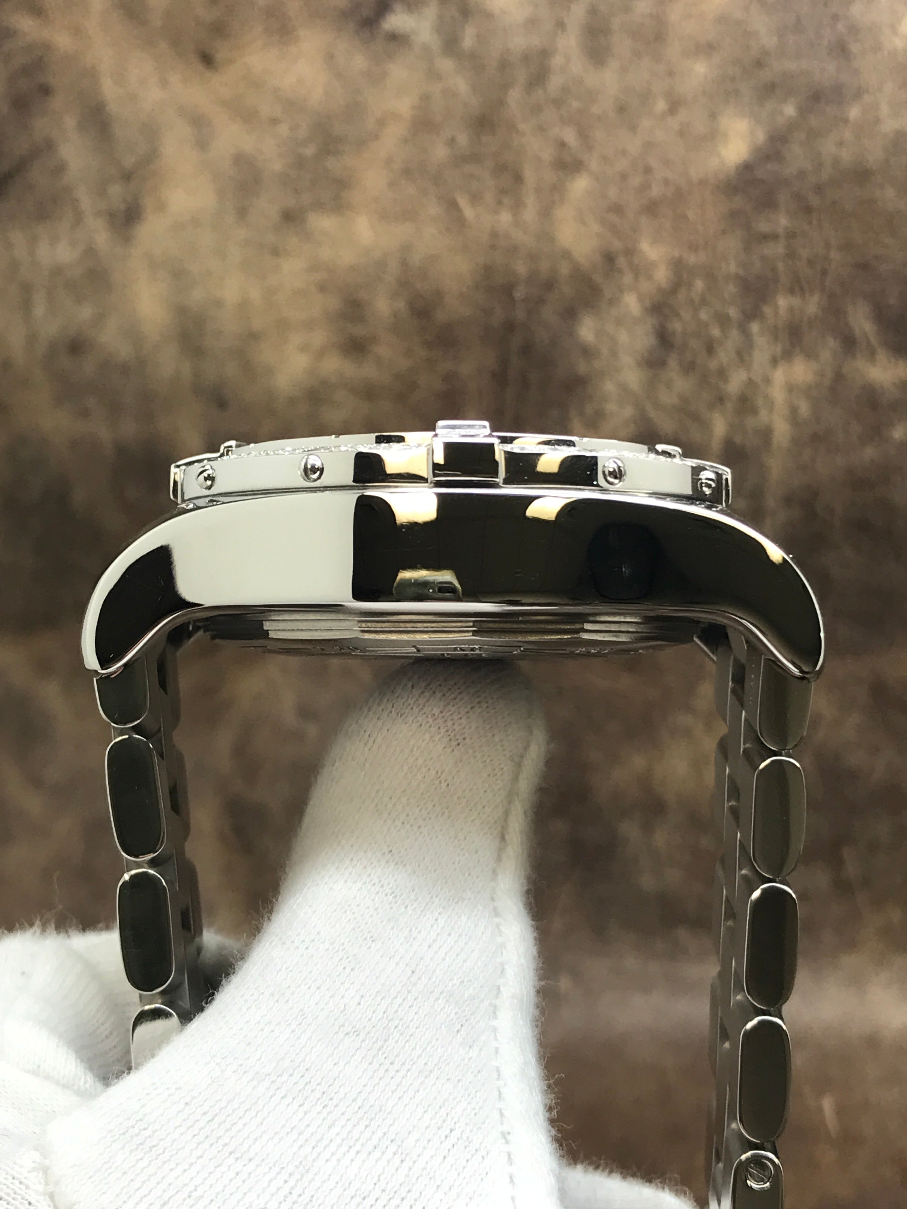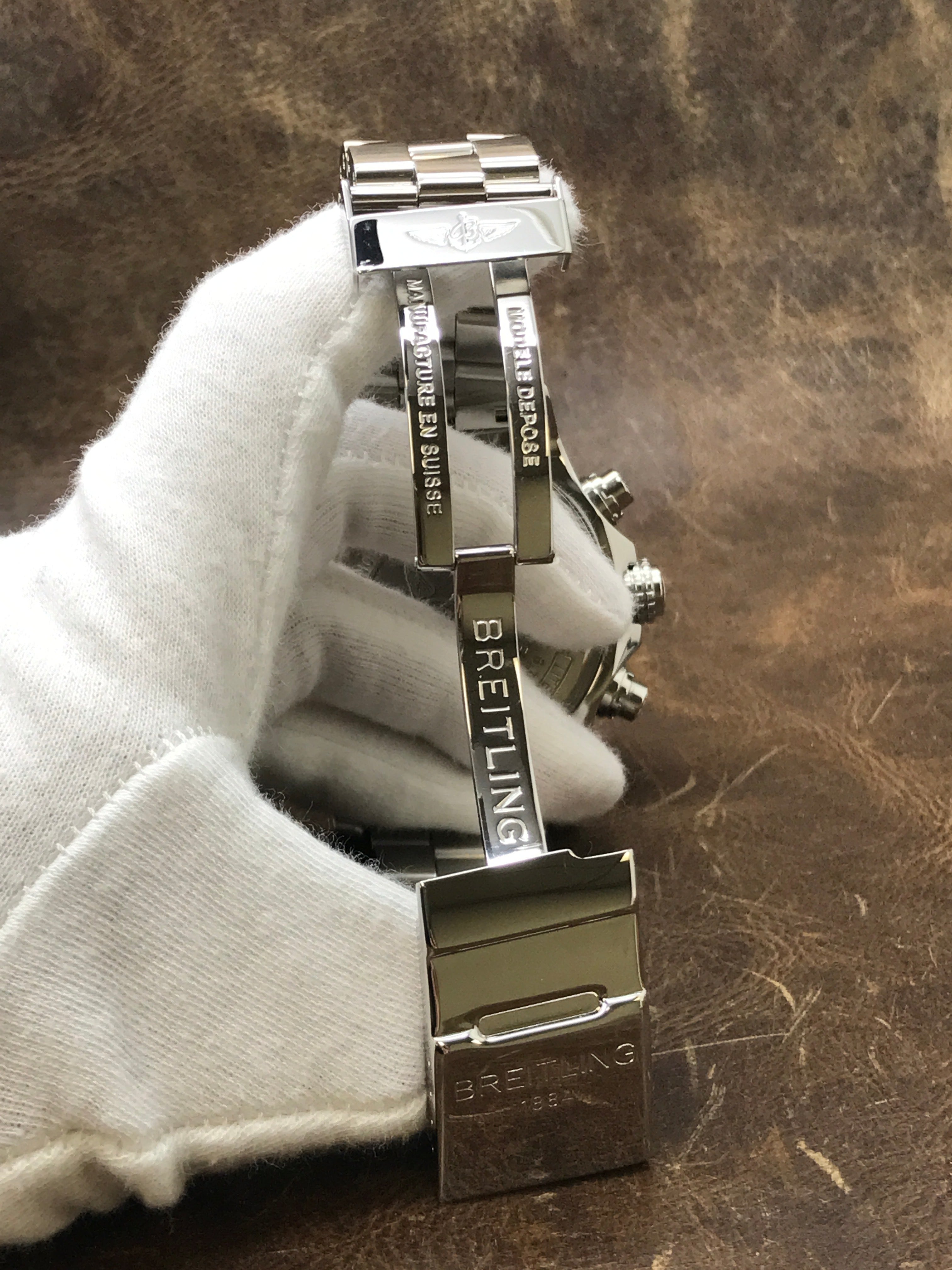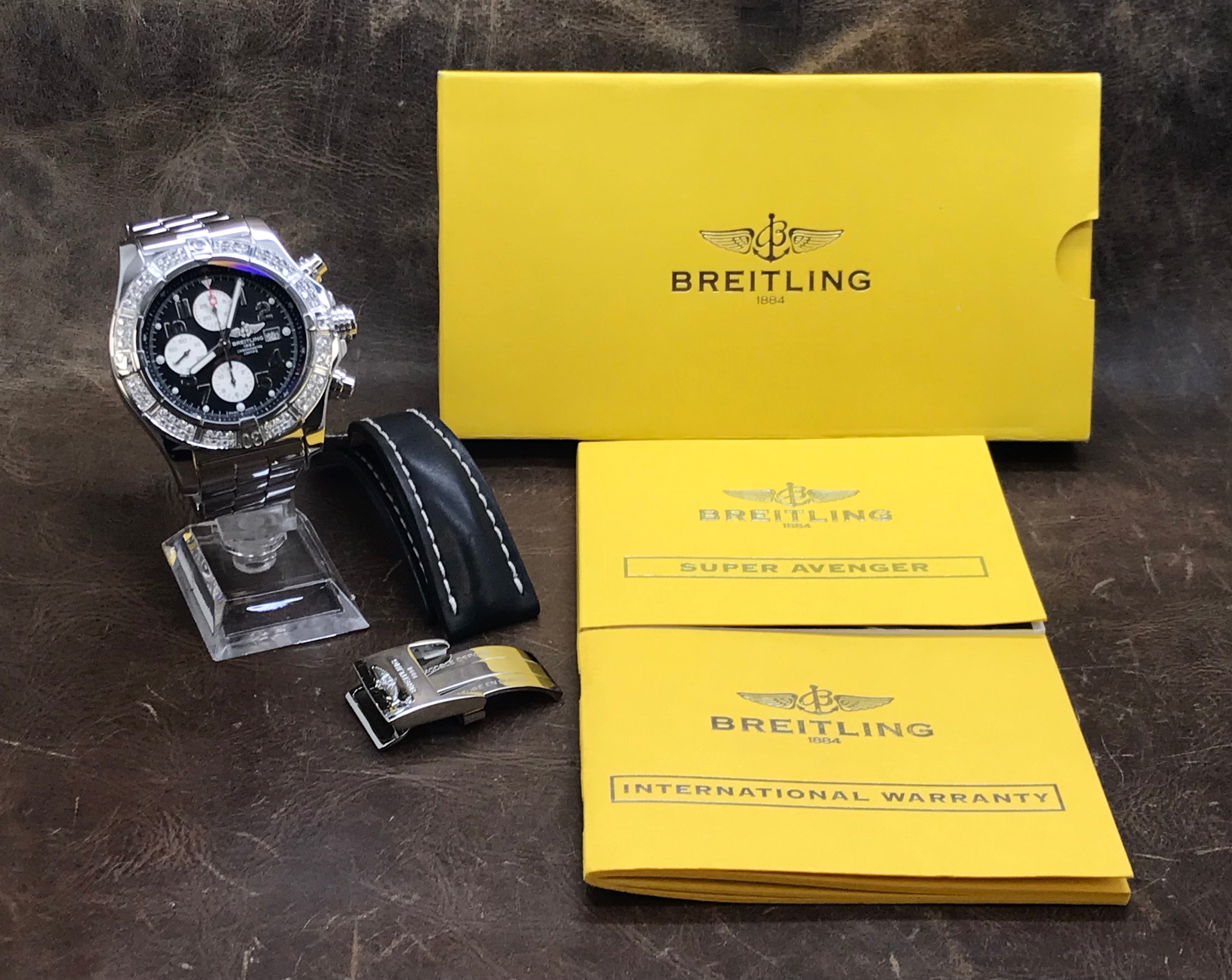 This pre-owned Breitling Super Avenger Custom Diamond Bezel A13370 is in mint condition and comes with: original extra leather strap & deployment buckle, booklets and matching warranty papers dated 2012. the watch comes with an extra leather strap & deployment buckle and with a custom added diamond bezel. Max wrist size: 7.75 in.