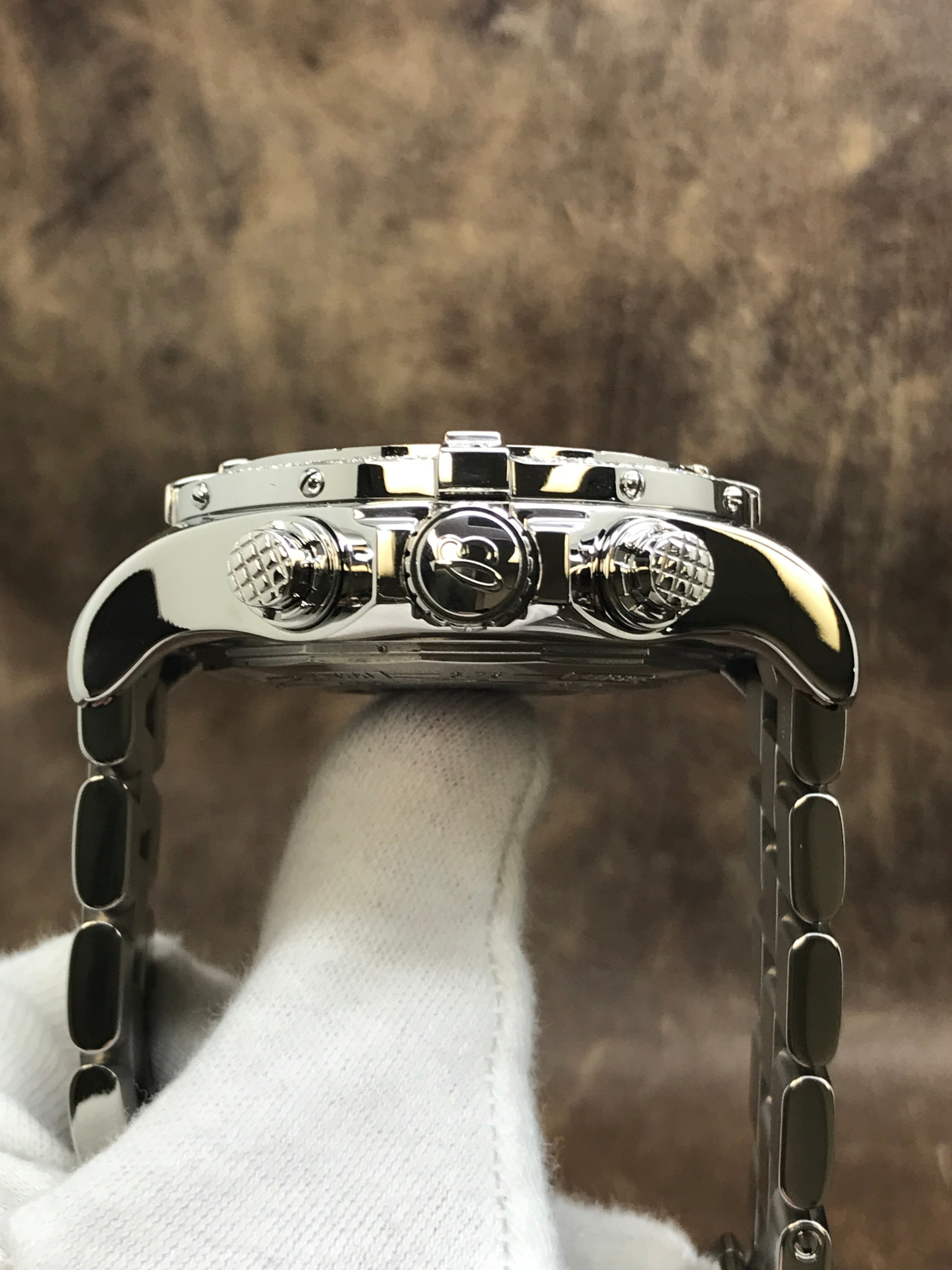 Stainless steel case with a stainless steel bracelet. Uni-directional rotating stainless steel diamond set bezel. Black panda dial with luminous silver-tone hands and Arabic numerals hour markers. Dial type: analog. Breitling calibre 13 automatic movement with about 42 of power reserve. Cambered sapphire, glareproofed both sides crystal. Screw locked - two gaskets crown. Solid case back. Case size: 48 mm. Case thickness: 18.6 mm. Round case shape. Band width: mm. Fold over clasp. Water resistant at 300 meters / 1000 feet. Functions: chronograph, date, hour, minute, second, chronometer. Breitling Super Avenger Custom Diamond Bezel A13370 Black Panda Dial Automatic Men's Watch.