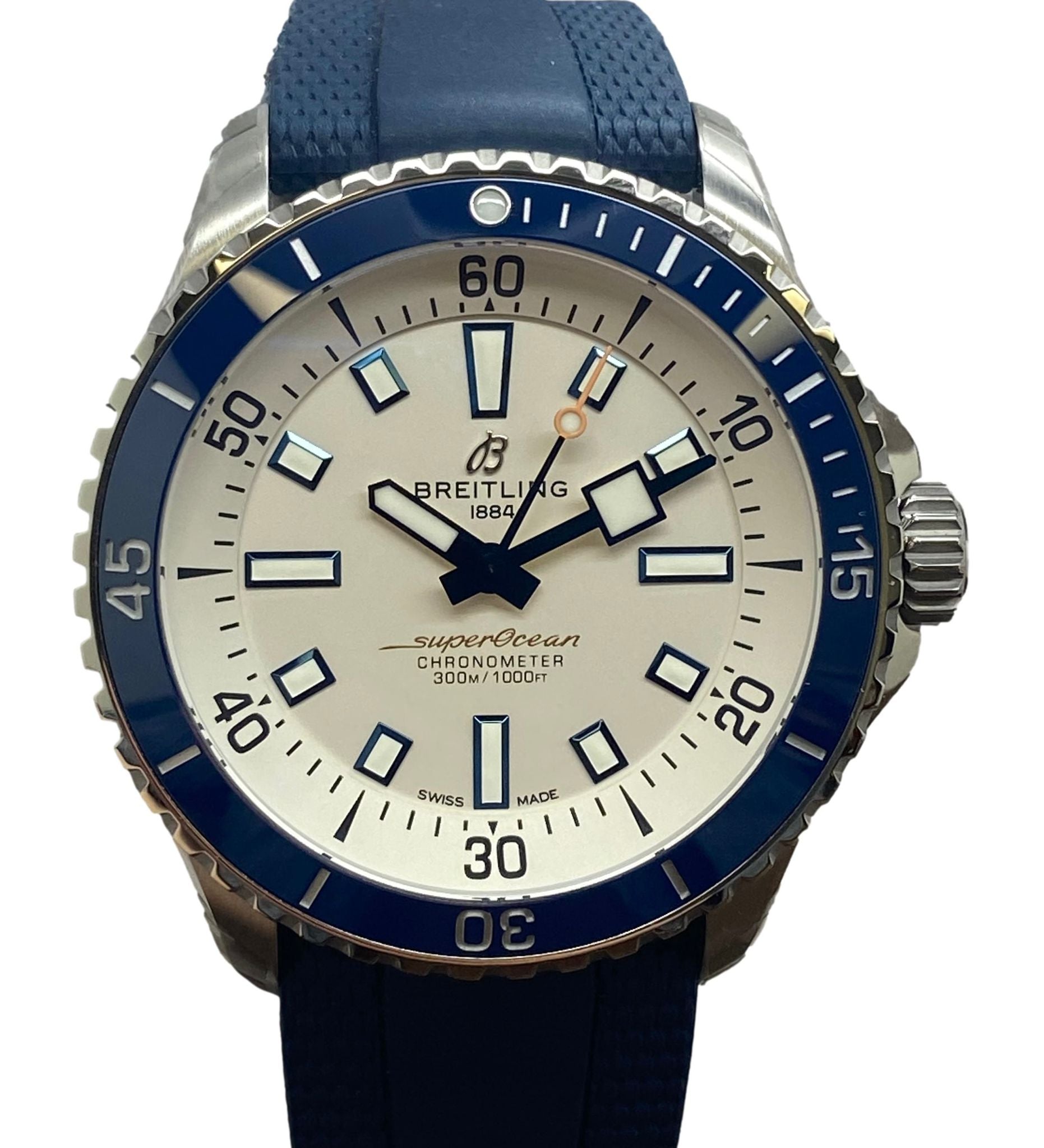 Stainless steel case with a rubber strap. Uni-directional rotating stainless steel with a ceramic top ring bezel. White dial with luminous blue hands and index hour markers. Dial type: analog. Breitling 17 automatic movement with about 38 hours of power reserve. Cambered sapphire, glareproofed both sides crystal. Screw-locked, two gaskets crown. Solid case back. Case size: 42 mm. Case thickness: 12.5 mm. Round case shape. Band width: mm. Fold over with push button release clasp. Water resistant at 300 meters / 1000 feet. Functions: hour, minute, seconds, chronometer. Breitling Superocean 42mm A17375E71G1S1 White Dial Automatic Men's Watch.