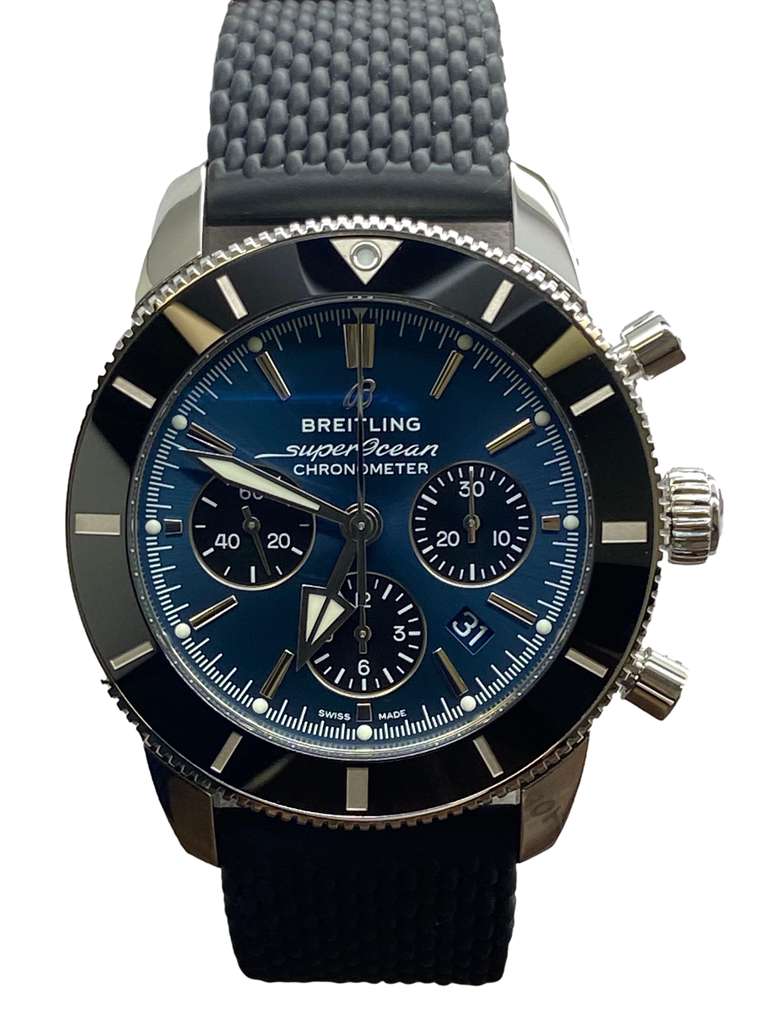 Stainless steel case with a rubber strap. Uni-directional rotating stainless steel with a ceramic top ring bezel. Blue panda dial with luminous silver-tone hands and index hour markers. Dial type: analog. Breitling caliber 01 automatic movement with about 70 hours of power reserve. Cambered sapphire, glareproofed on both sides crystal. Screw down crown. Transparent case back. Case size: 44 mm. Case thickness: 15.51 mm. Round case shape. Band width: mm. Fold over with safety release clasp. Water resistant at 200 meters / 660 feet. Functions: chronograph, date, hour, minute, seconds, cosc chronometer . Breitling Superocean Heritage B01 Chronograph AB0162 Blue Panda Dial Automatic Men's Watch.