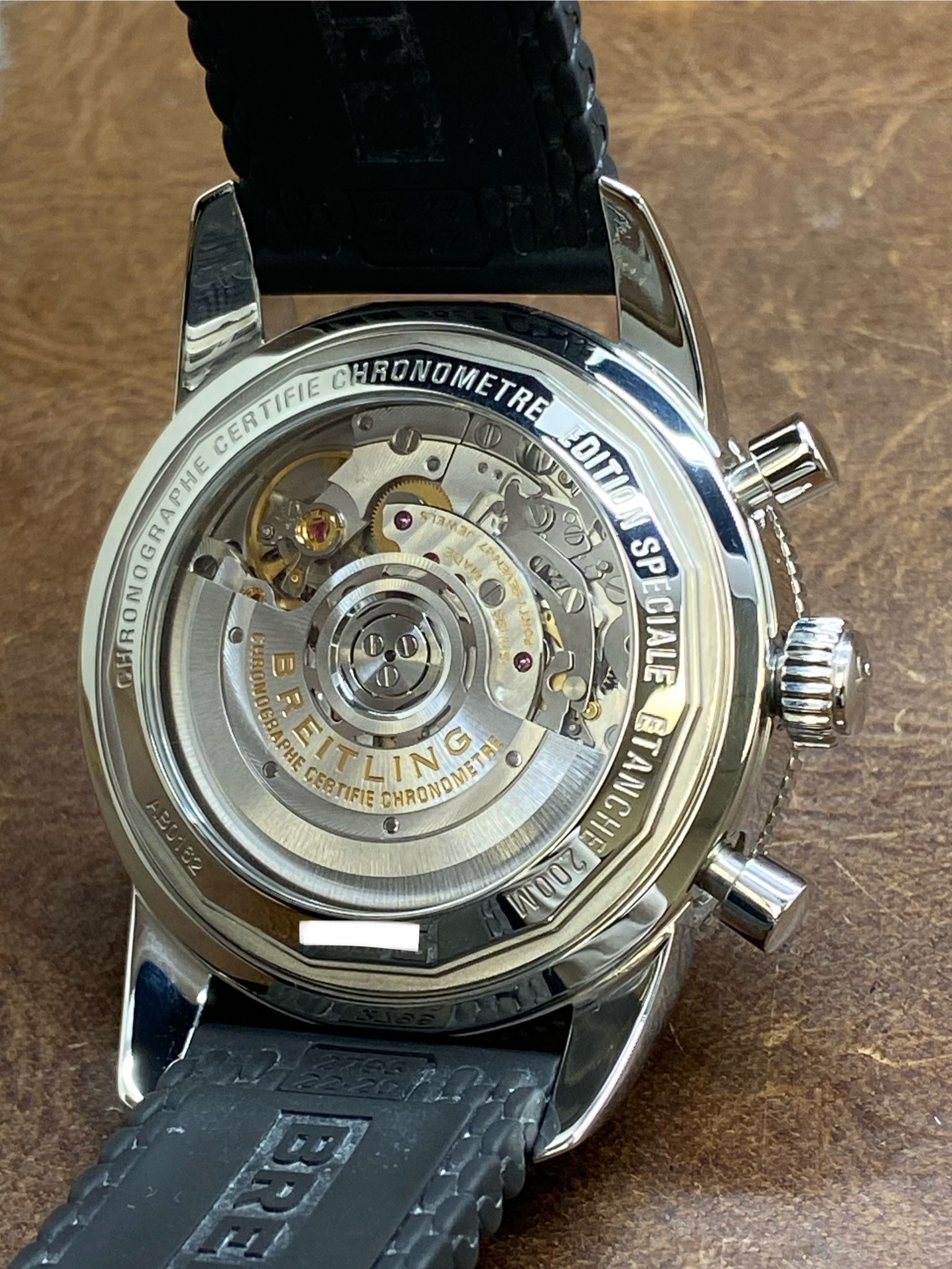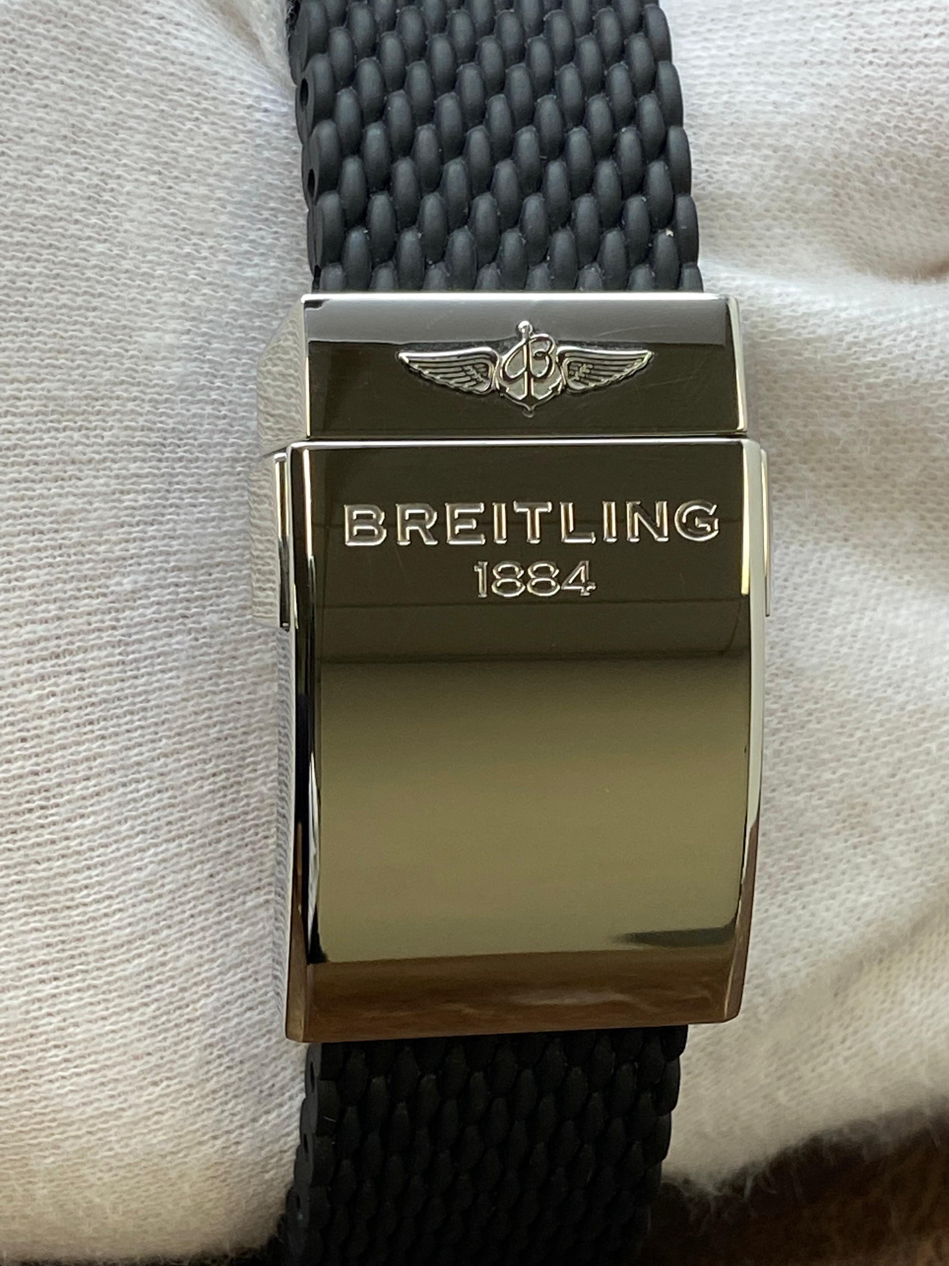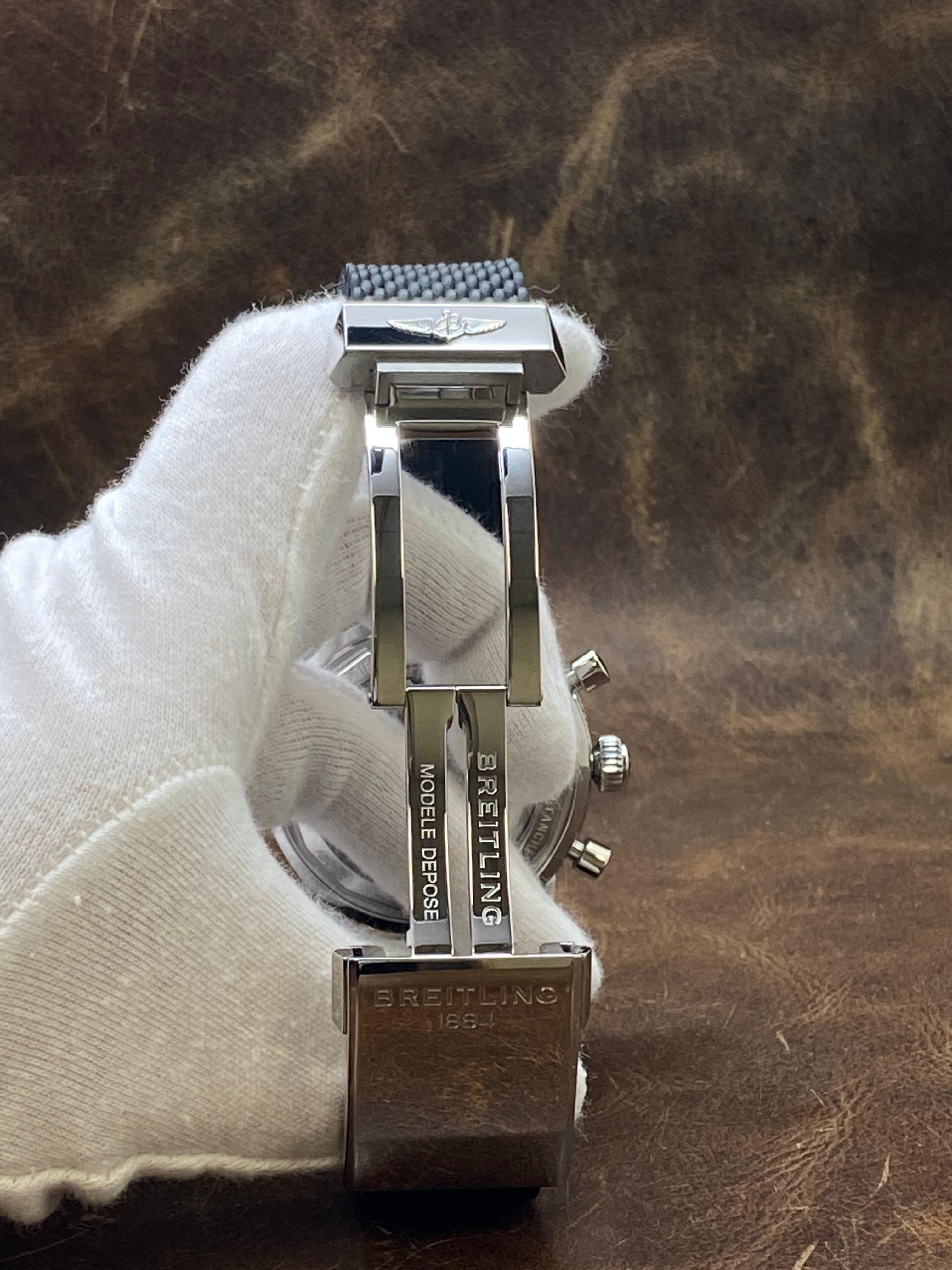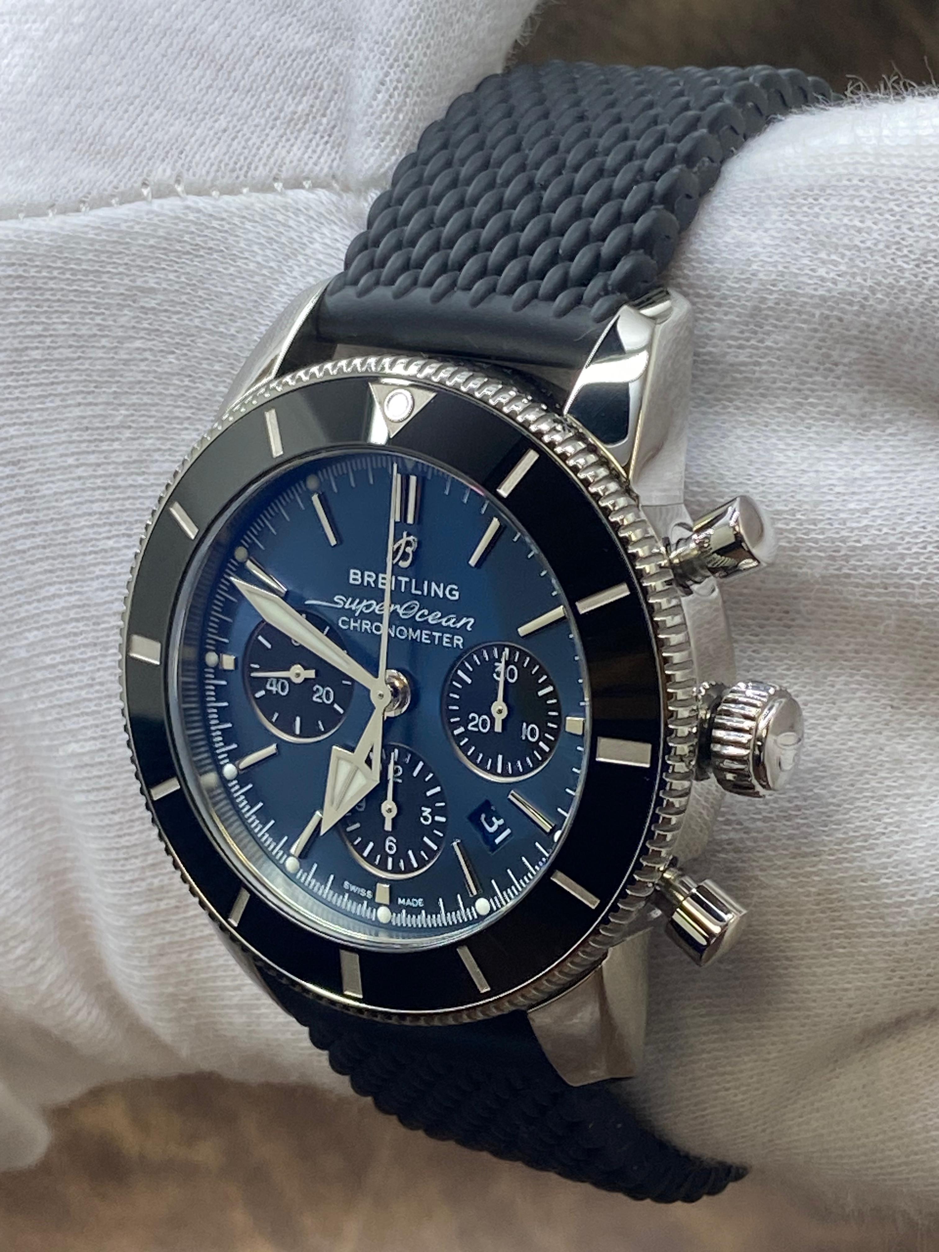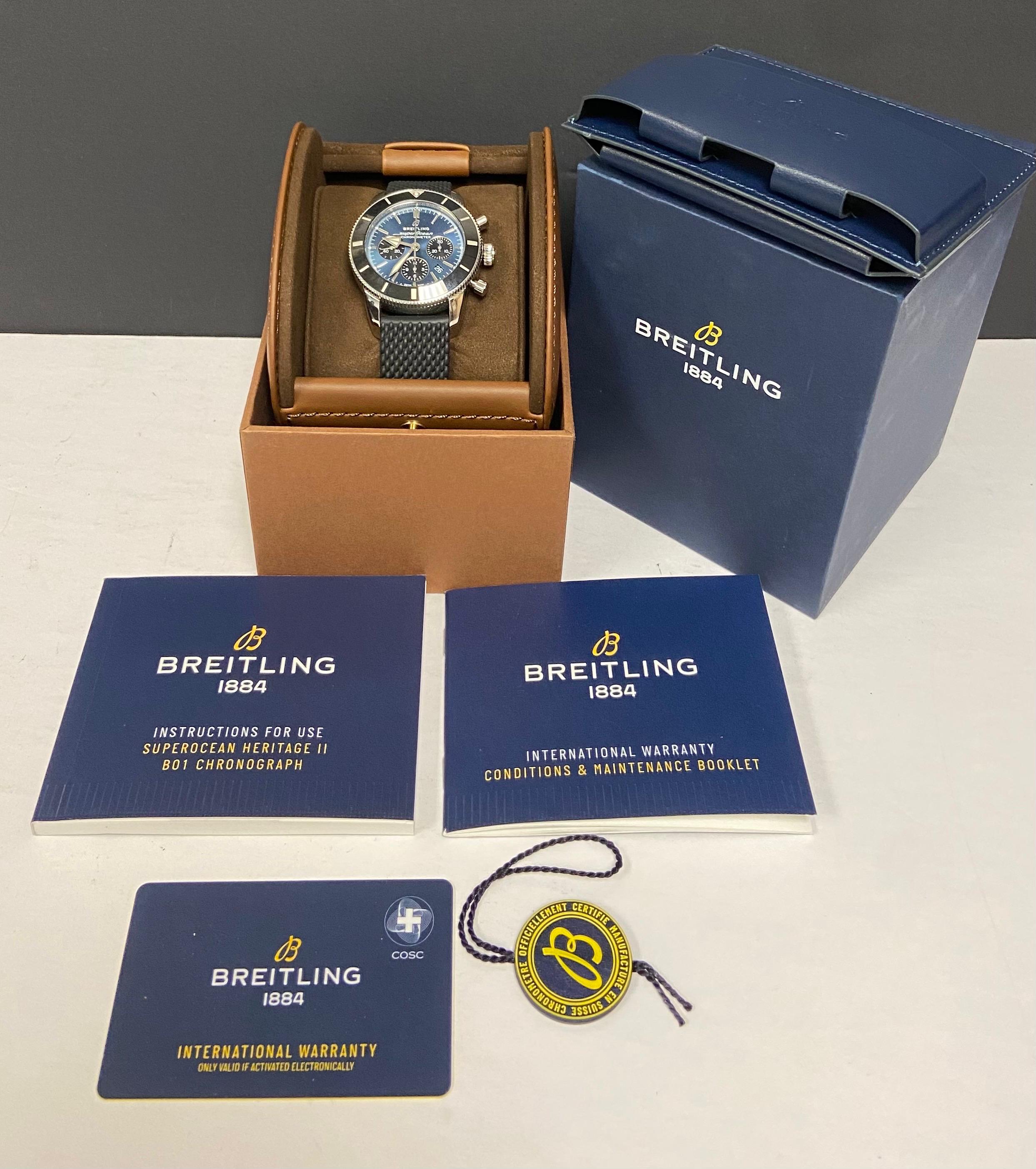This pre-owned Breitling Superocean Heritage B01 Chronograph AB0162 is in mint condition and comes with: original Breitling double box, booklets, tag and matching warranty card. Max wrist size: 7.75 in.