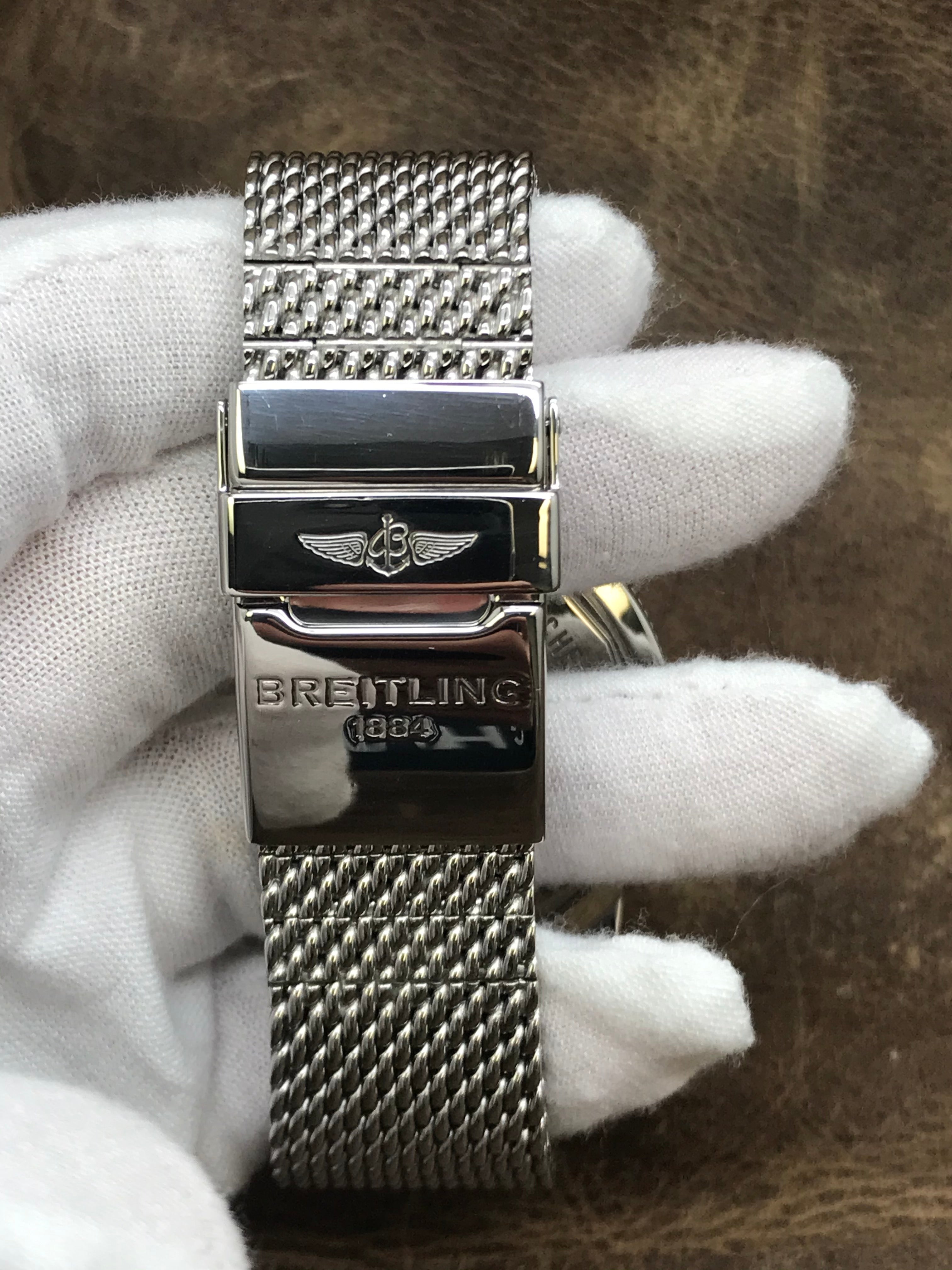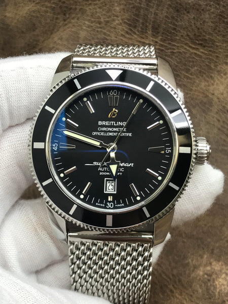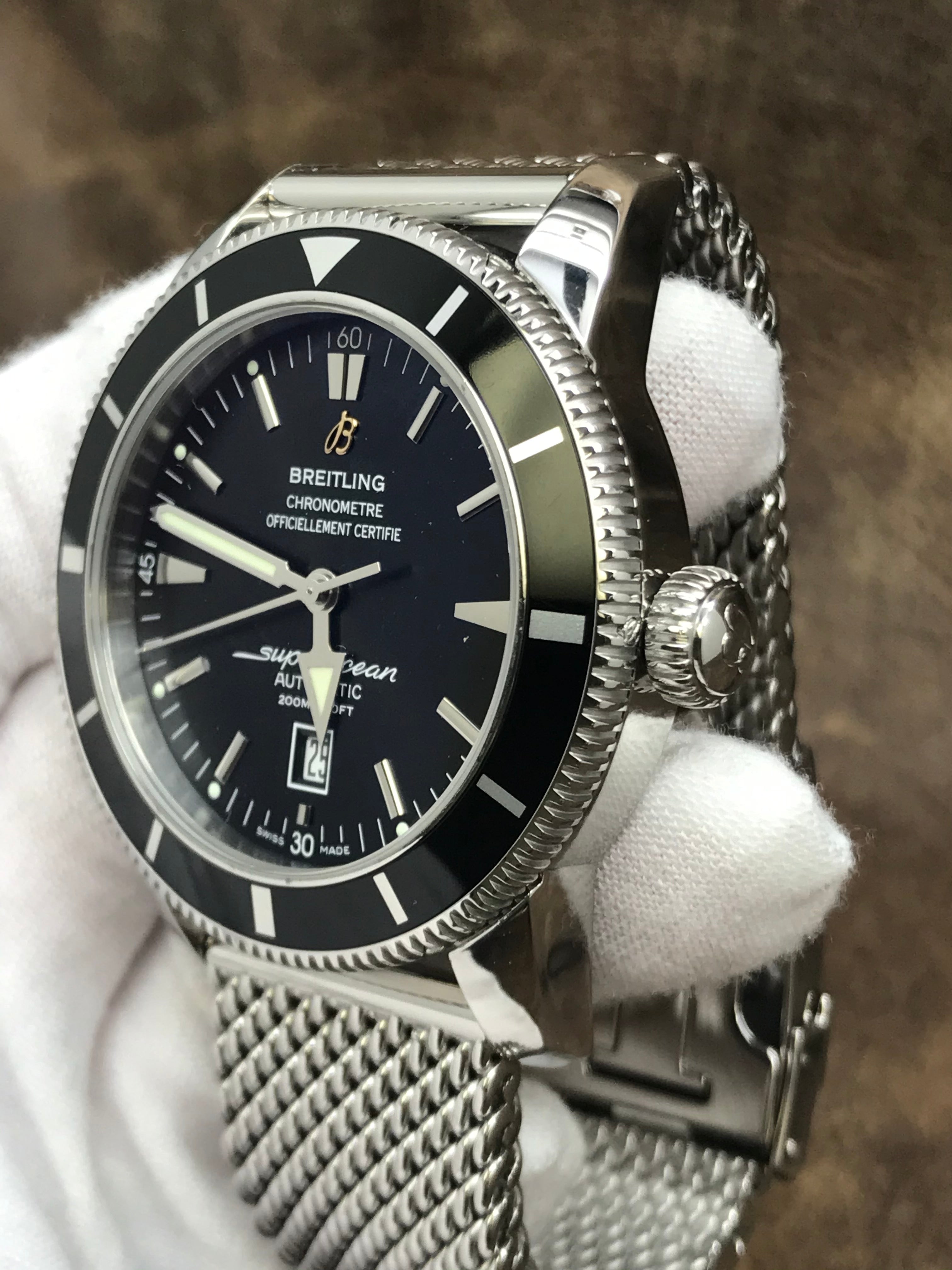 Stainless steel case with a stainless steel mesh bracelet. Bi-directional rotating stainless steel bezel. Black dial with silver tone luminous hands and index hour markers. Dial type: analog. Luminescent hands and markers. Breitling calibre 17 automatic movement with about 40 hours of power reserve. Scratch resistant sapphire crystal. Screw locked crown. Solid case back. Case size: 46 mm. Case thickness: 13.6 mm. Round case shape. Band width: 24 mm. Fliplock clasp. Water resistant at 200 meters / 660 feet. Functions: chronometer, date, hour, minute, second. Breitling Superocean Heritage A1732024 Black Dial Automatic Men's Watch.