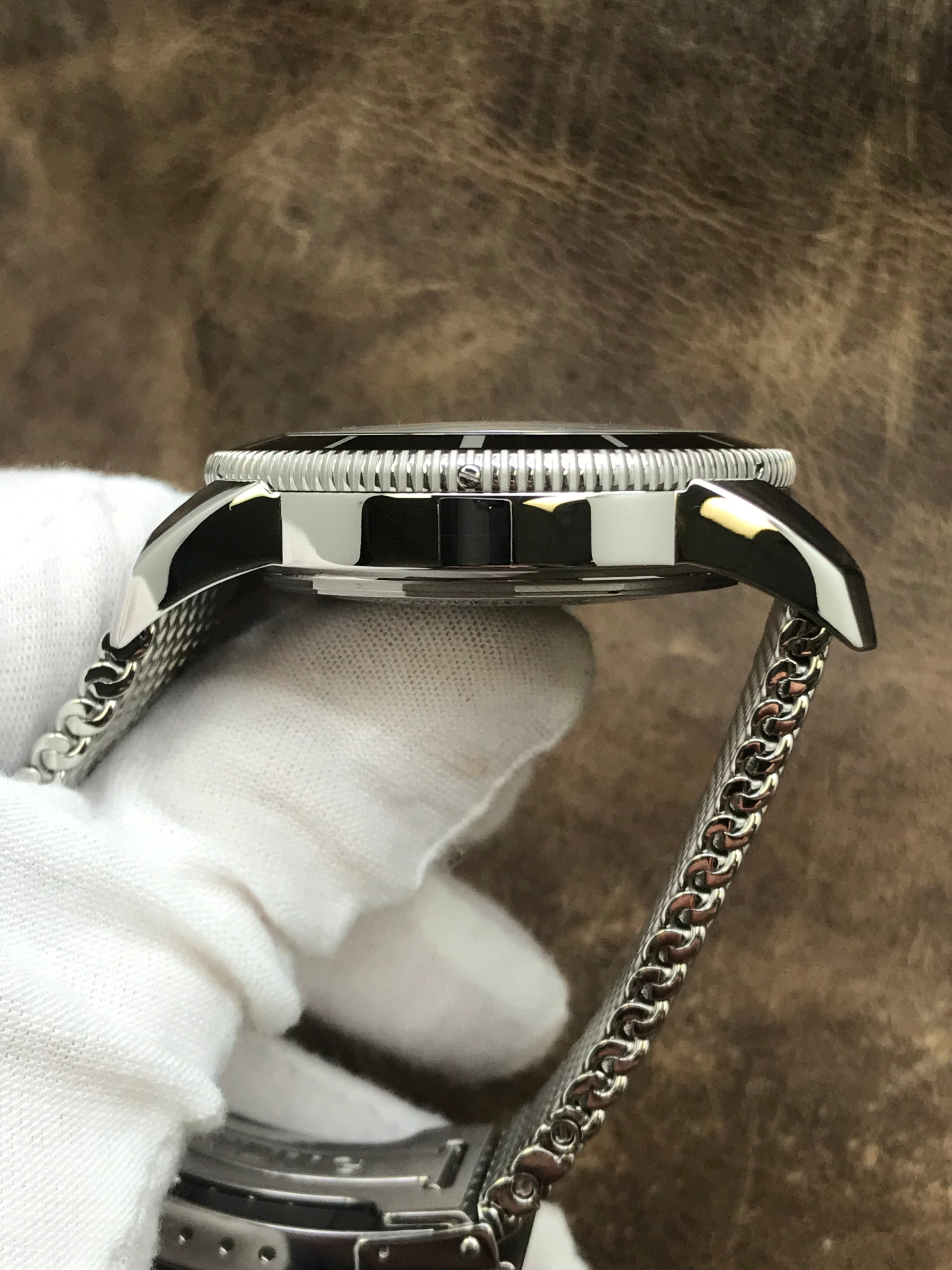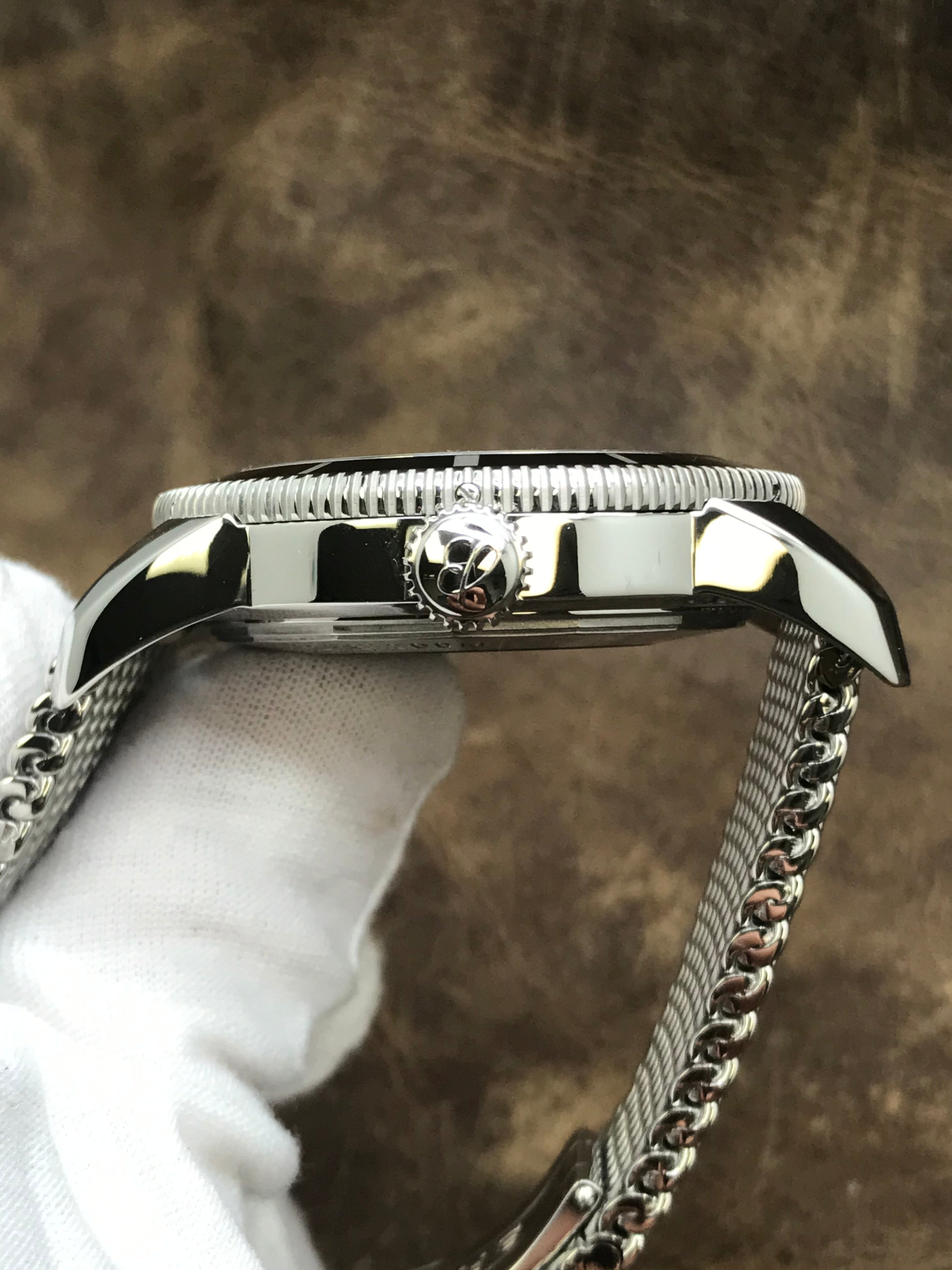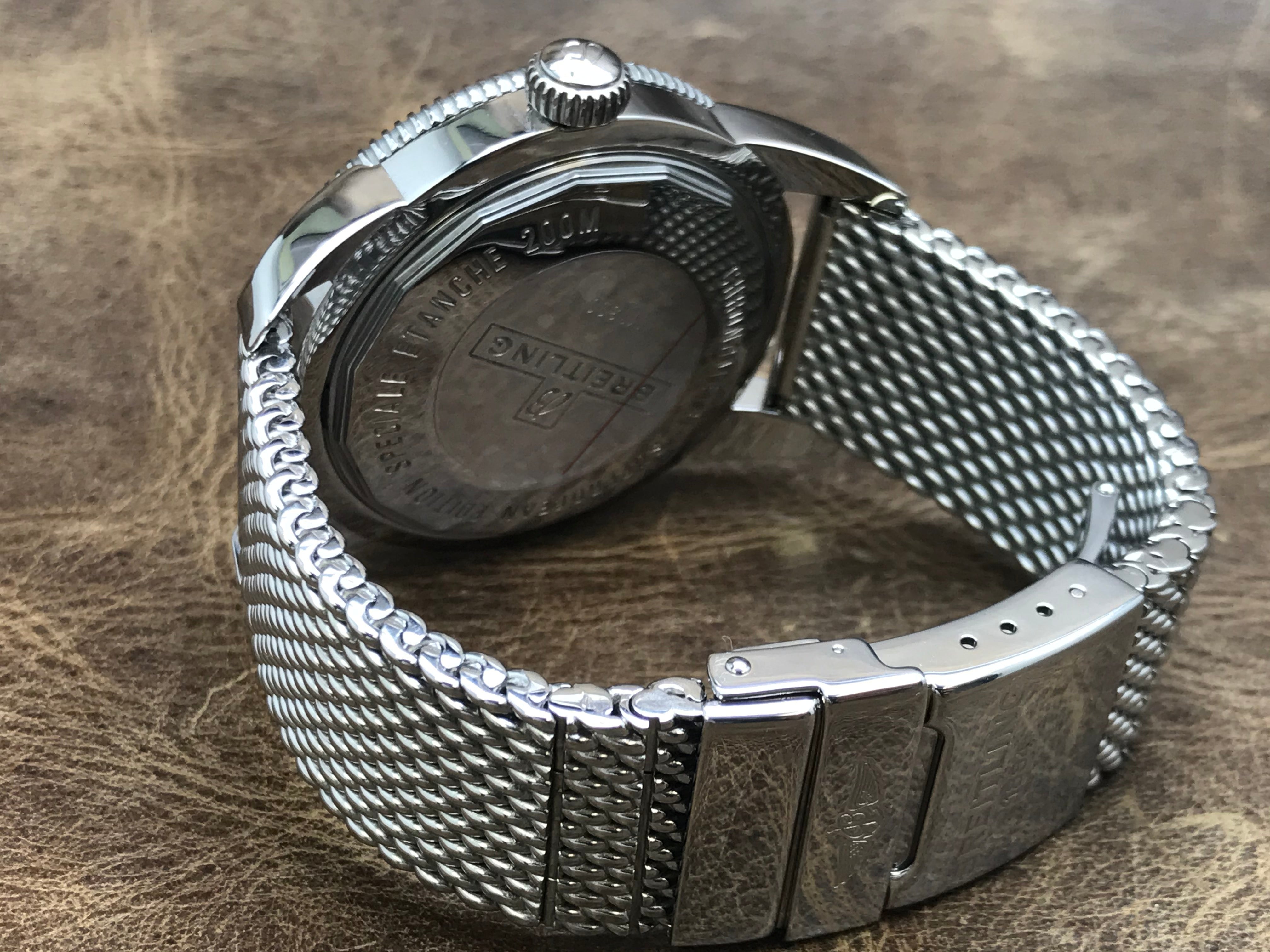 Stainless steel case with a stainless steel mesh bracelet. Bi-directional rotating stainless steel bezel. Black dial with silver tone luminous hands and index hour markers. Dial type: analog. Luminescent hands and markers. Breitling calibre 17 automatic movement with about 40 hours of power reserve. Scratch resistant sapphire crystal. Screw locked crown. Solid case back. Case size: 46 mm. Case thickness: 13.6 mm. Round case shape. Band width: 24 mm. Fliplock clasp. Water resistant at 200 meters / 660 feet. Functions: chronometer, date, hour, minute, second. Breitling Superocean Heritage A1732024 Black Dial Automatic Men's Watch.