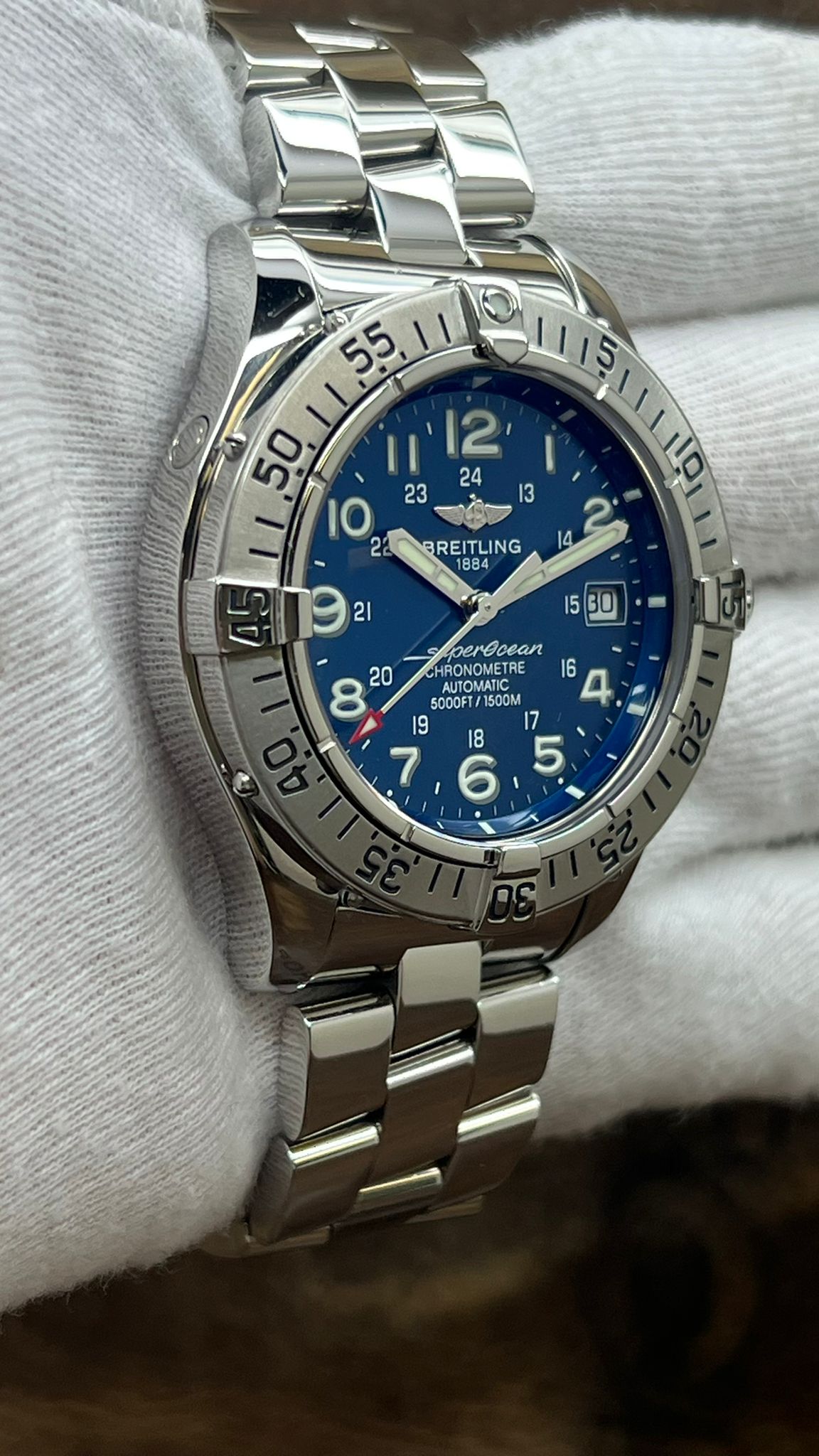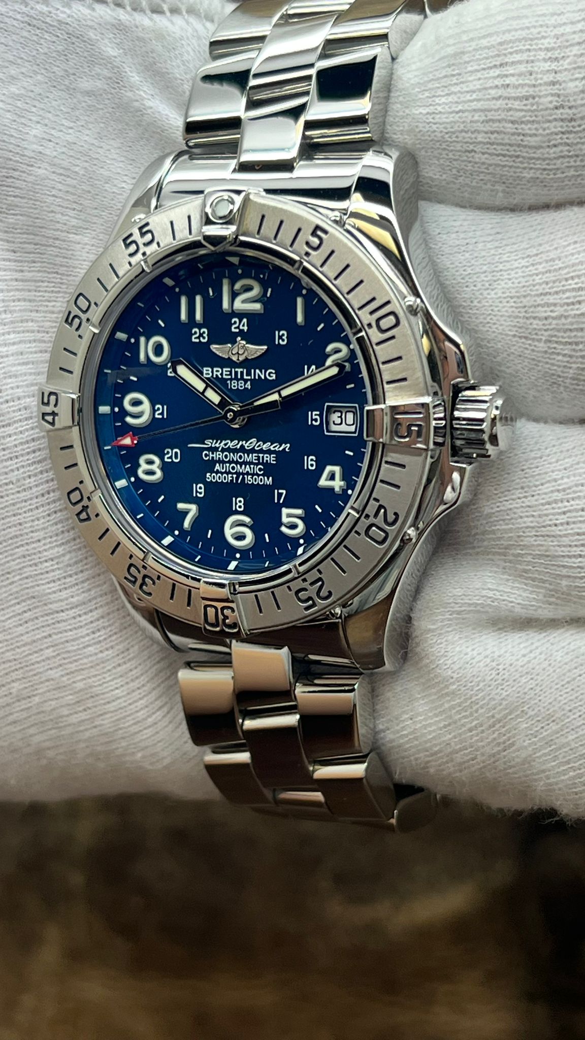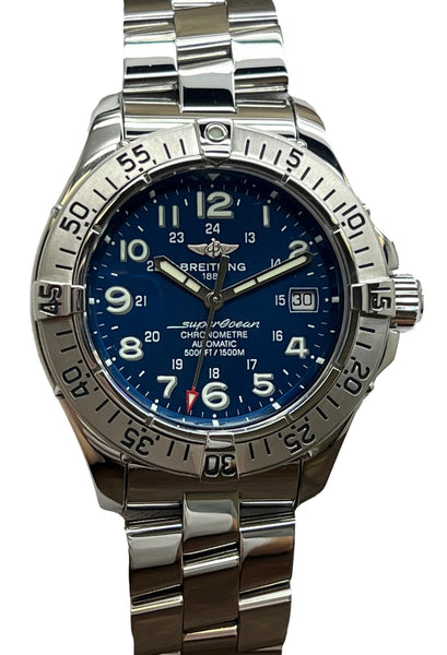 Stainless steel case with a stainless steel bracelet. Uni-directional rotating stainless steel bezel. Blue dial with luminous silver-tone hands and Arabic numerals hour markers. Dial type: analog. Breitling 17 automatic movement with about 42 hours of power reserve. Scratch resistant sapphire crystal. Screw down crown. Solid case back. Case size: 42 mm. Case thickness: 15 mm. Round case shape. Band width: mm. Fold over with safety release clasp. Water resistant at 1500 meters/5000 ft. Functions: date, hour, minute, seconds. Breitling Superocean 42mm A17360 Blue Dial Automatic Men's Watch.