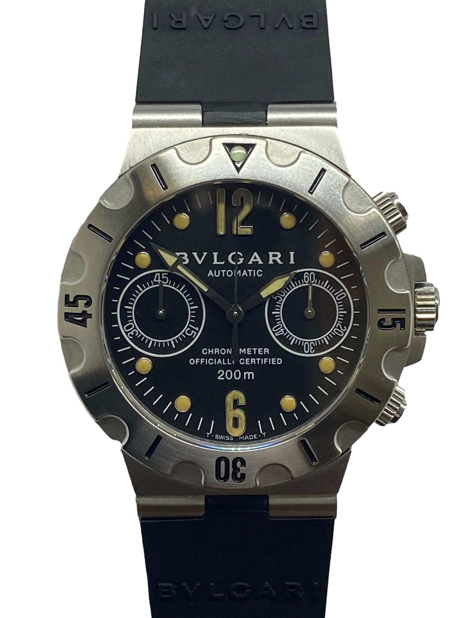 Stainless steel case with a rubber strap. Uni-directional rotating stainless steel bezel. Black dial with luminous silver-tone hands and luminous dot & 6 & 12 Arabic hour markers. Dial type: analog. Automatic movement with about of power reserve. Sapphire crystal. Screw down crown. Solid case back. Case size: 38 mm. Case thickness: mm. Round case shape. Band width: mm. Double fold-over with push button release clasp. Water resistant at 200 meters / 660 feet. Functions: chronograph, hour, minute, seconds, chronometer. Bulgari Diagono Scuba 38mm SCB38S Black Dial Automatic Men's Watch.