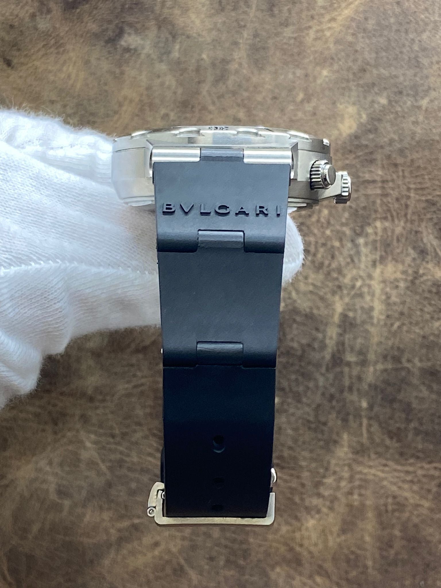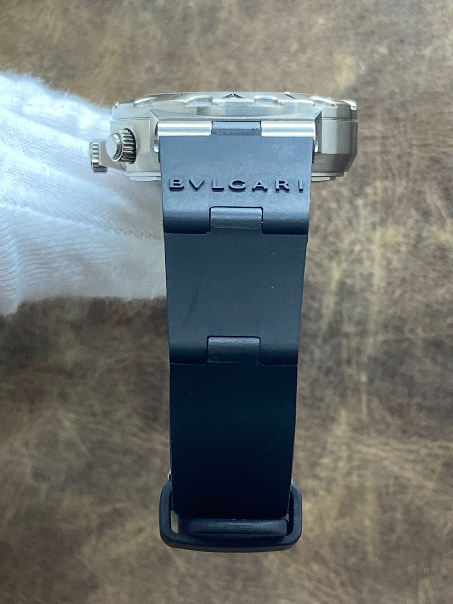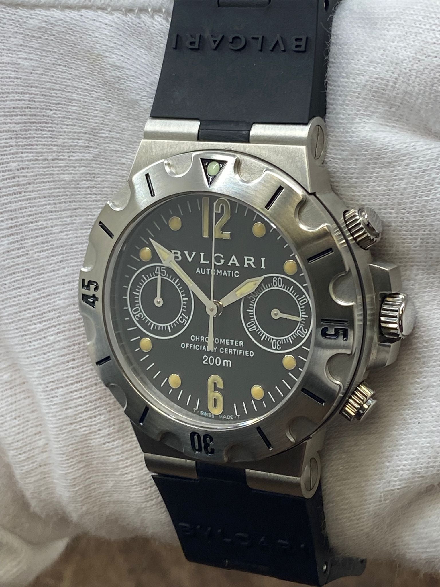 This pre-owned Bulgari Diagono Scuba 38mm SCB38S is in excellent condition and comes with: original Bulgari double box, booklets and warranty papers. The dial has some minor signs of wear on the lume parts - most significant at 6 o'clock hour marker and on the edge of the hour hand. Max wrist size: 6.5 in.