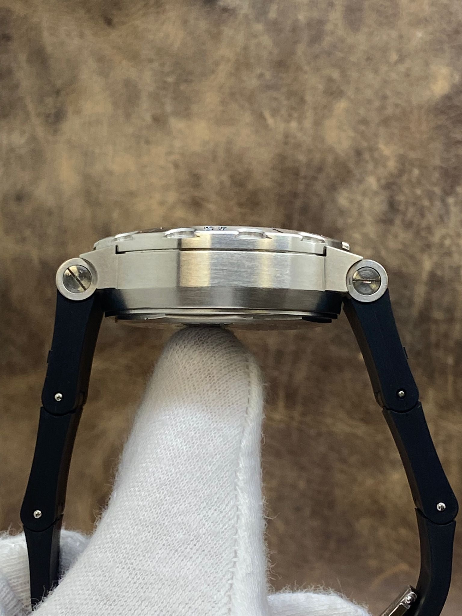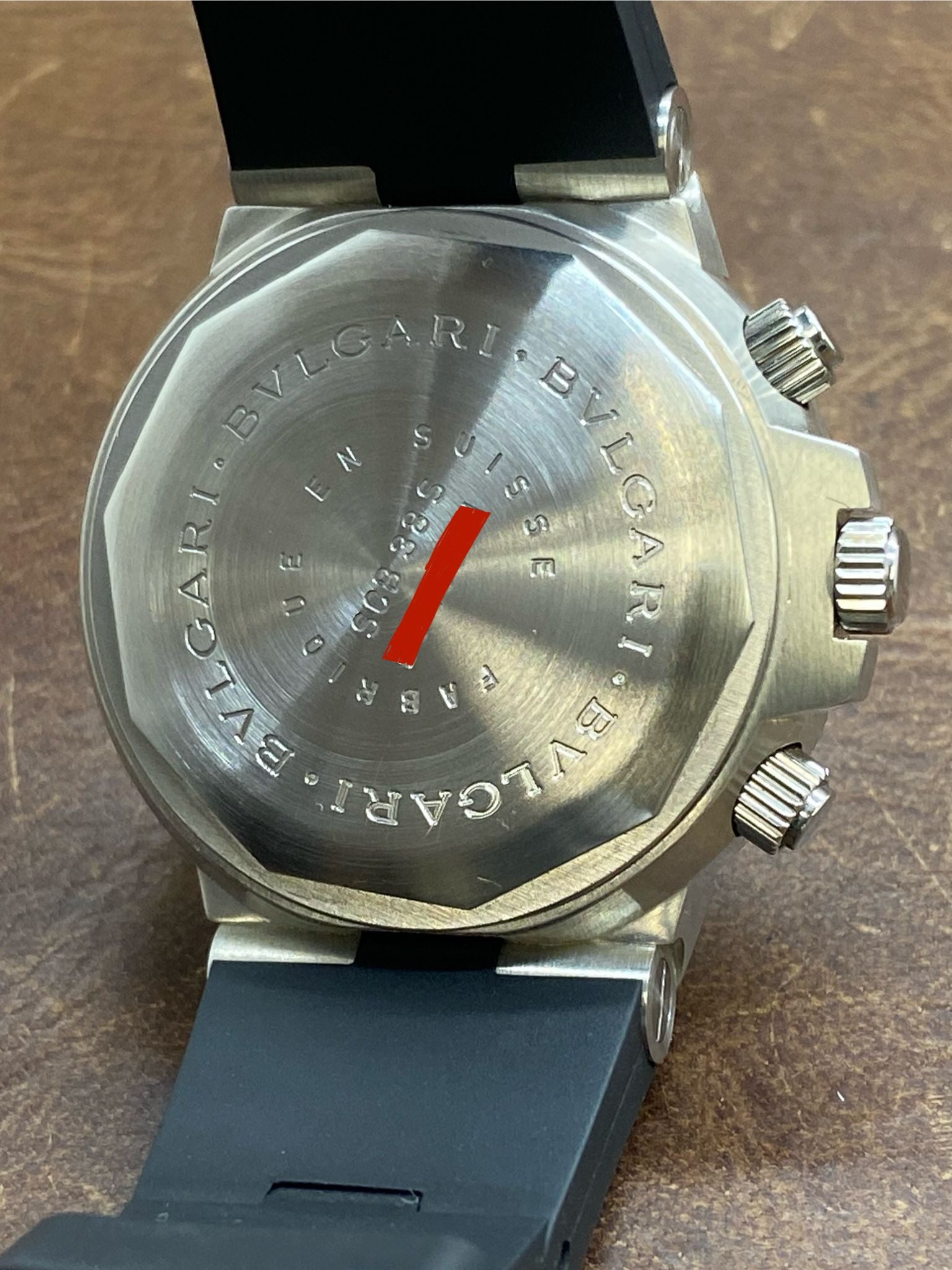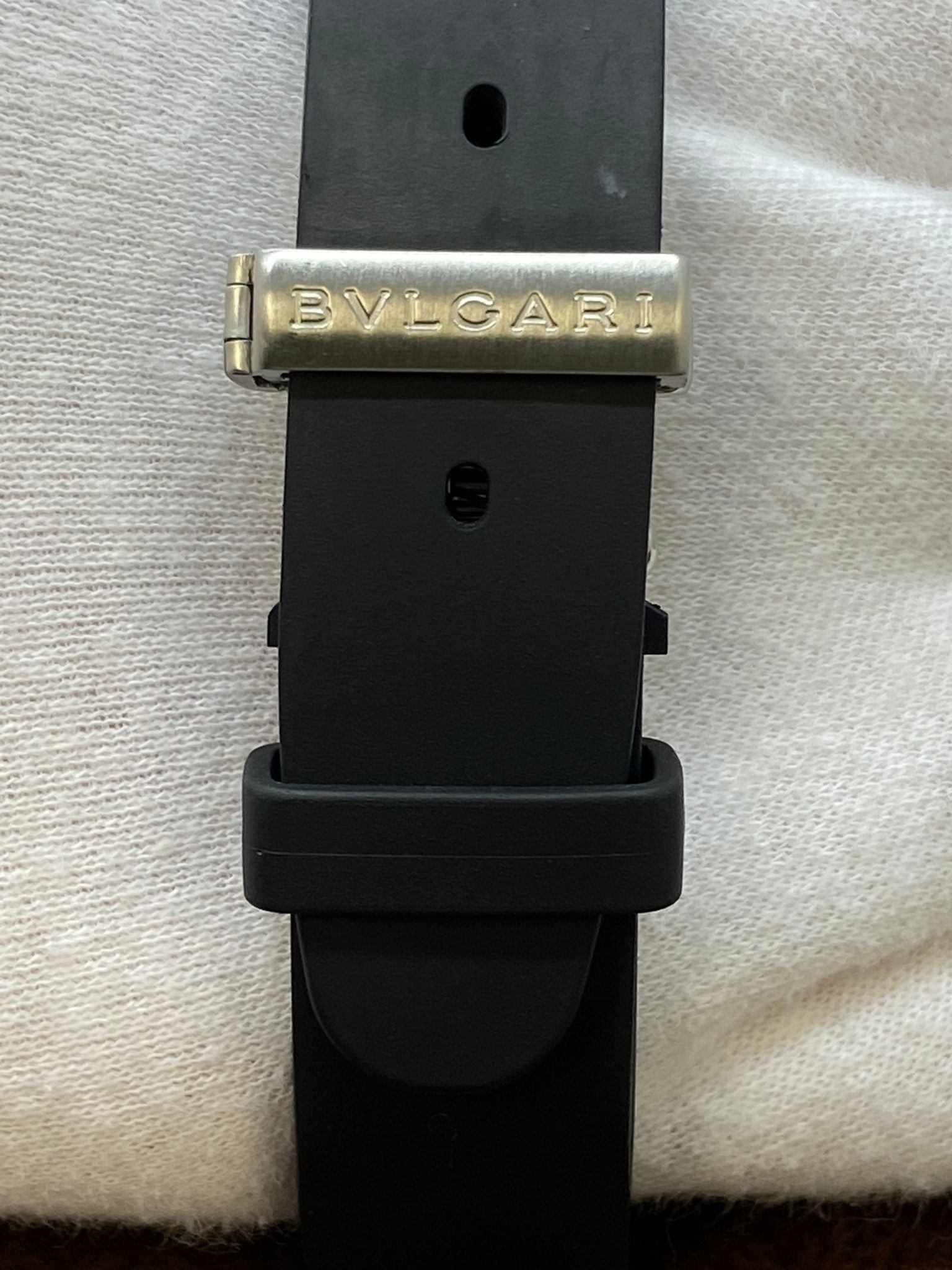 This pre-owned Bulgari Diagono Scuba 38mm SCB38S is in excellent condition and comes with: original Bulgari double box, booklets and warranty papers. The dial has some minor signs of wear on the lume parts - most significant at 6 o'clock hour marker and on the edge of the hour hand. Max wrist size: 6.5 in.
