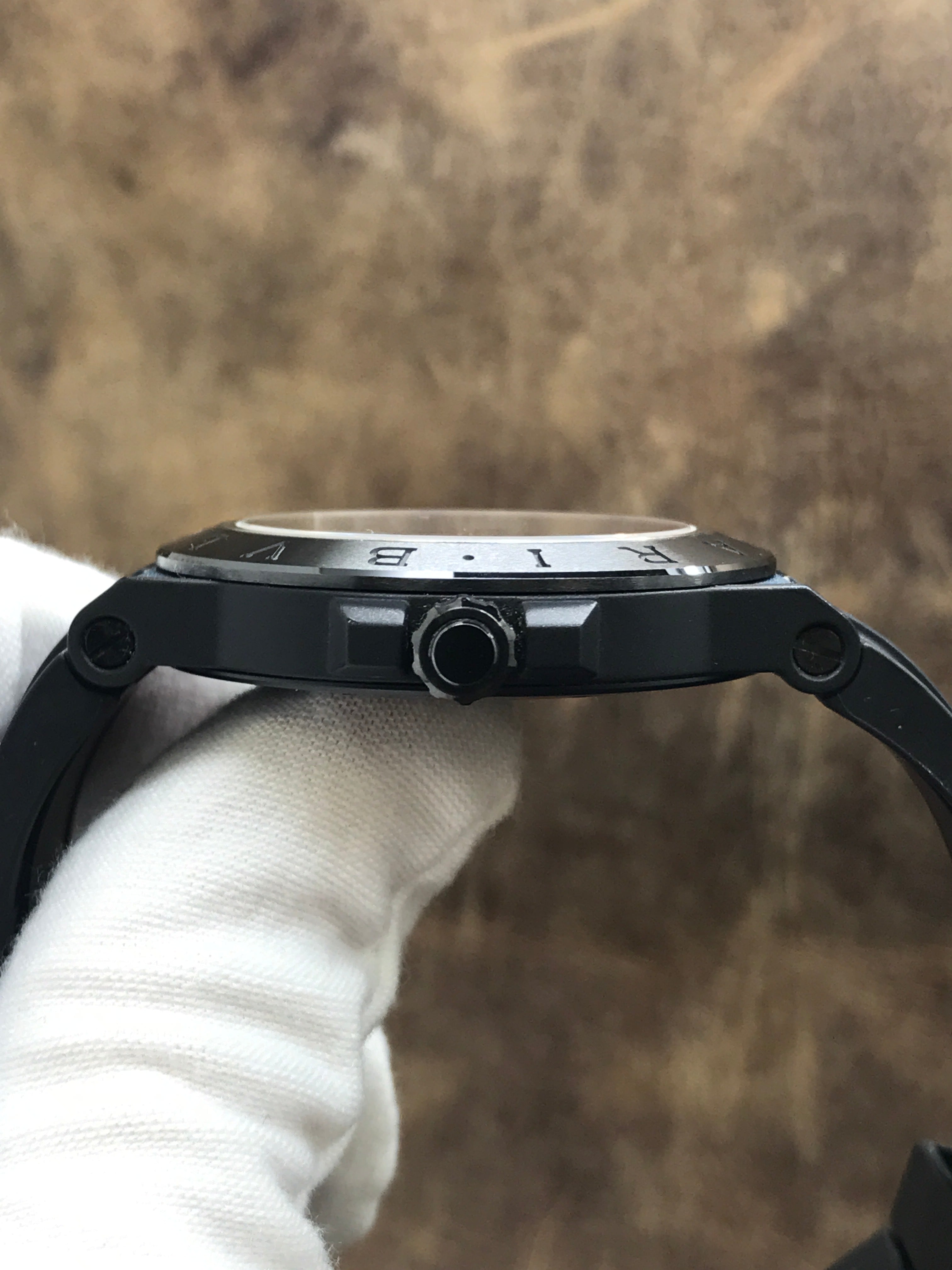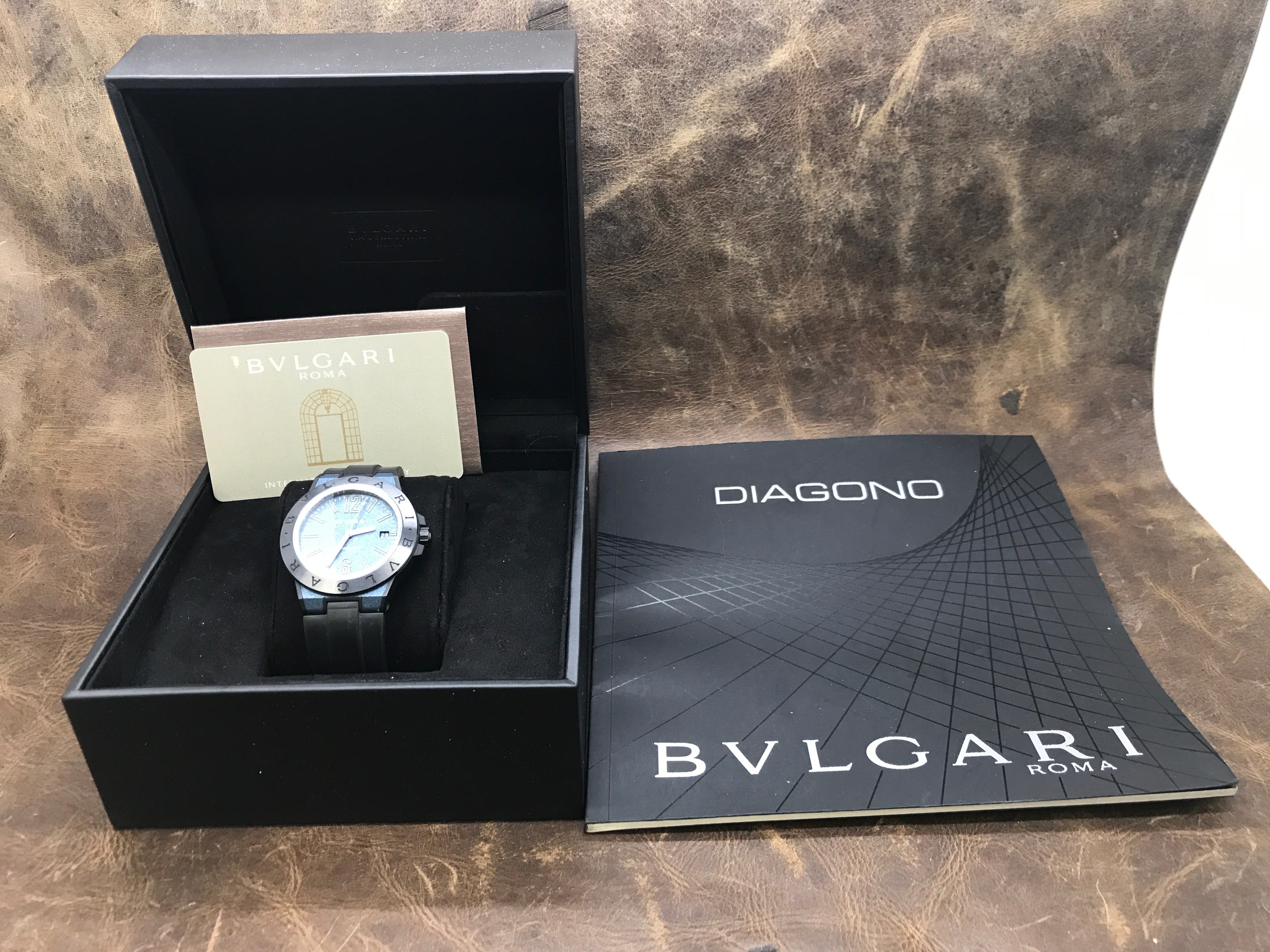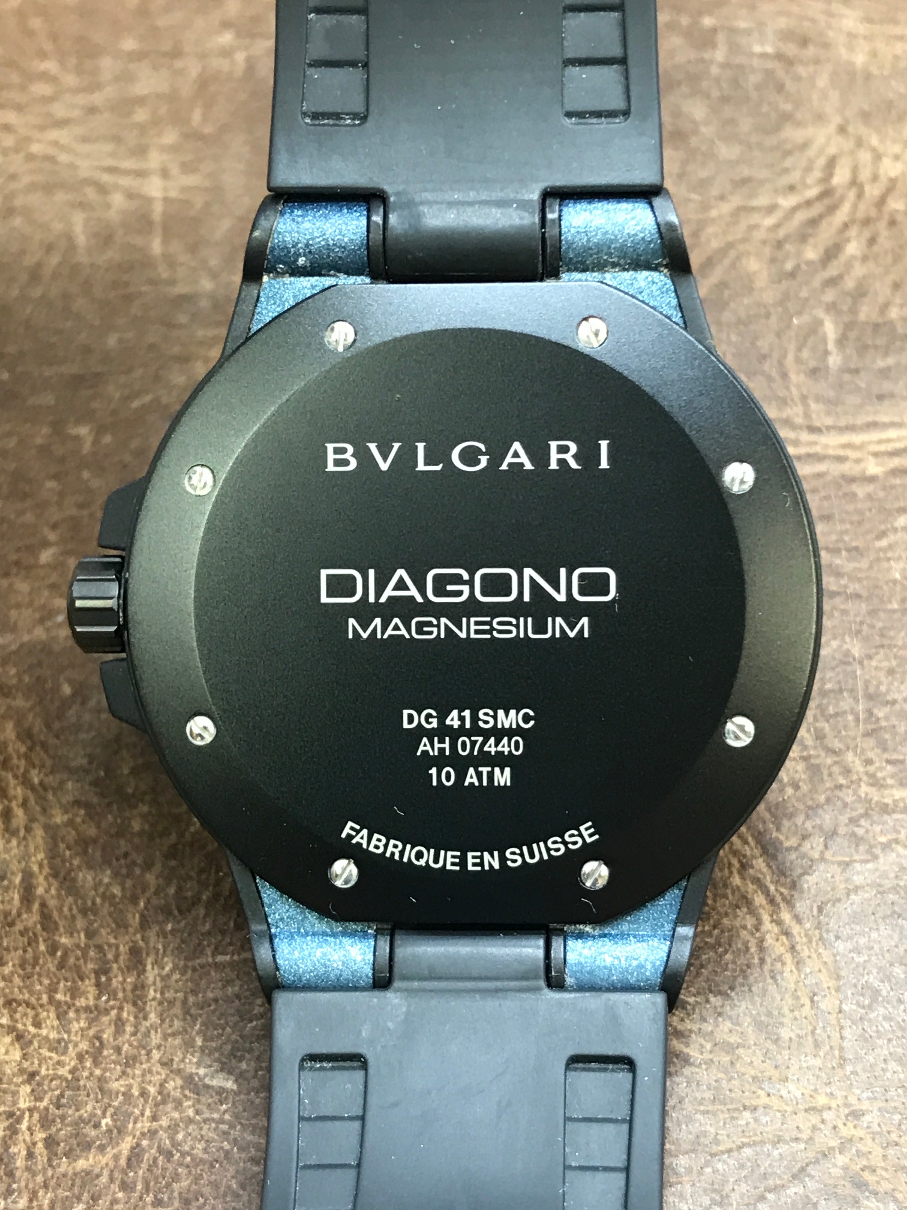 Magnesium and peek case with a rubber rubber strap. Fixed polyether ether ketone bezel. Blue dial with silver tone luminous hands and luminous index with Arabic 12 and 6 hour markers. Dial type: analog. BVLGARI calibre bvl 191 solotempo automatic movement with about 42 hours of power reserve. Scratch resistant sapphire crystal. Pull / push crown. Solid case back. Case size: 41 mm. Case thickness: 9.5 mm. Round case shape. Band width: mm. Tang buckle clasp. Water resistant at 30 meters / 100 feet. Functions: hours, minutes, seconds, date. BVLGARI Diagono Magnesium DG41SMC 102364 Blue Dial Automatic Men's Watch.