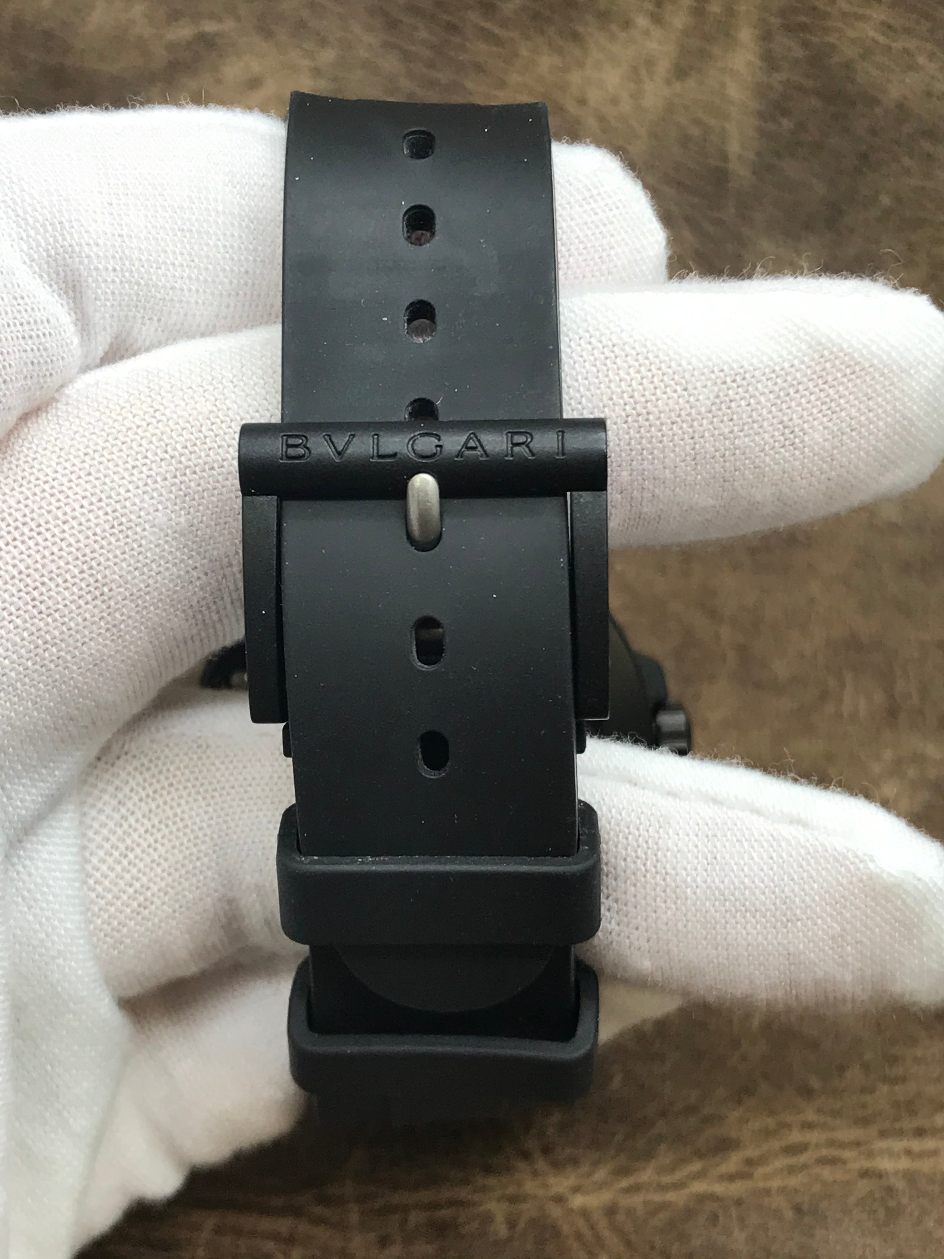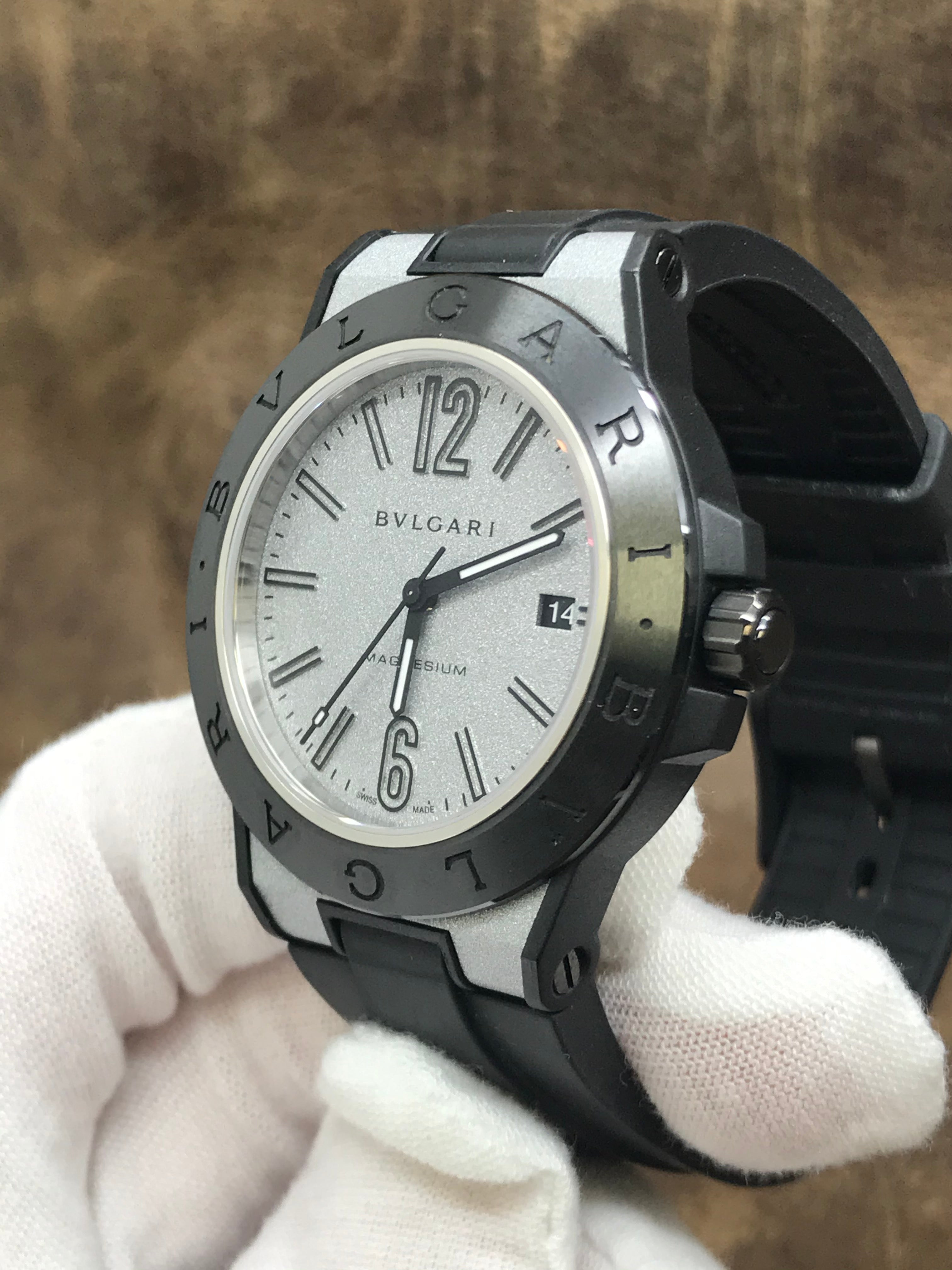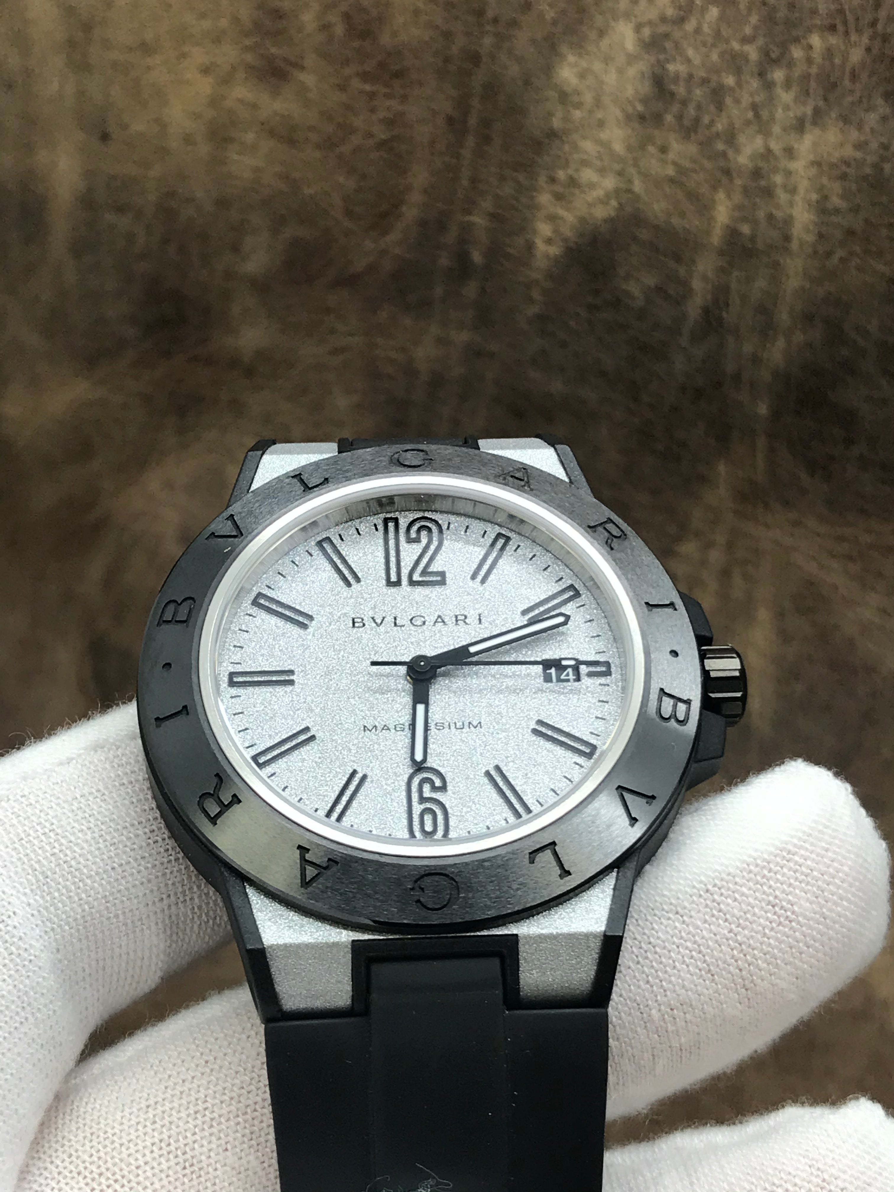 Magnesium & ceramic case with a rubber strap. Fixed ceramic bezel. Silver dial with black, luminescent hands and Arabic and luminous index hour markers. Dial type: silver. Bvl 191 automatic movement with about 42 of power reserve. Scratch resistant sapphire crystal. Screw-down crown. Solid case back. Case size: 41 mm. Case thickness: 9.5 mm. Round case shape. Band width: mm. Tang clasp. Water resistant at 100m. Functions: hours, minutes, seconds, date . BVLGARI Diagono DG41C6SMCVD Silver Dial Automatic Men's Watch.