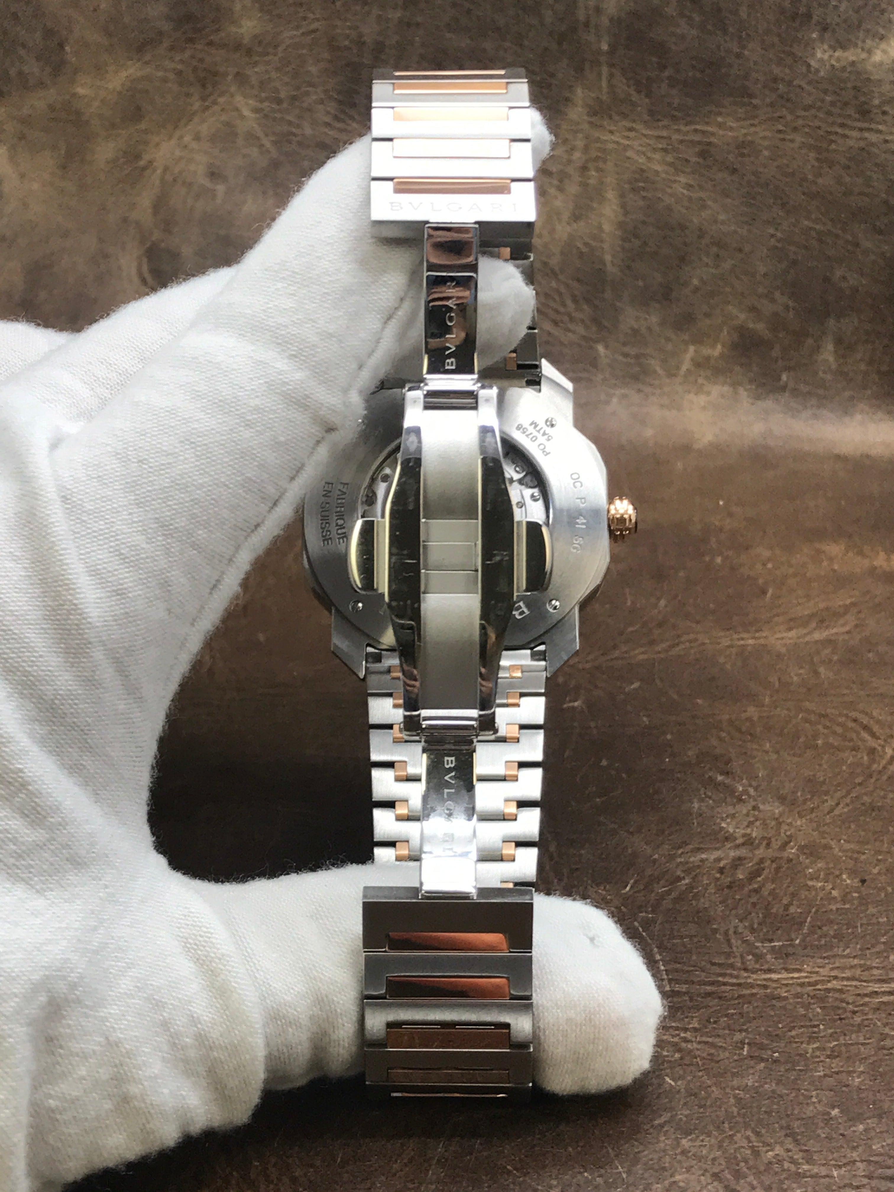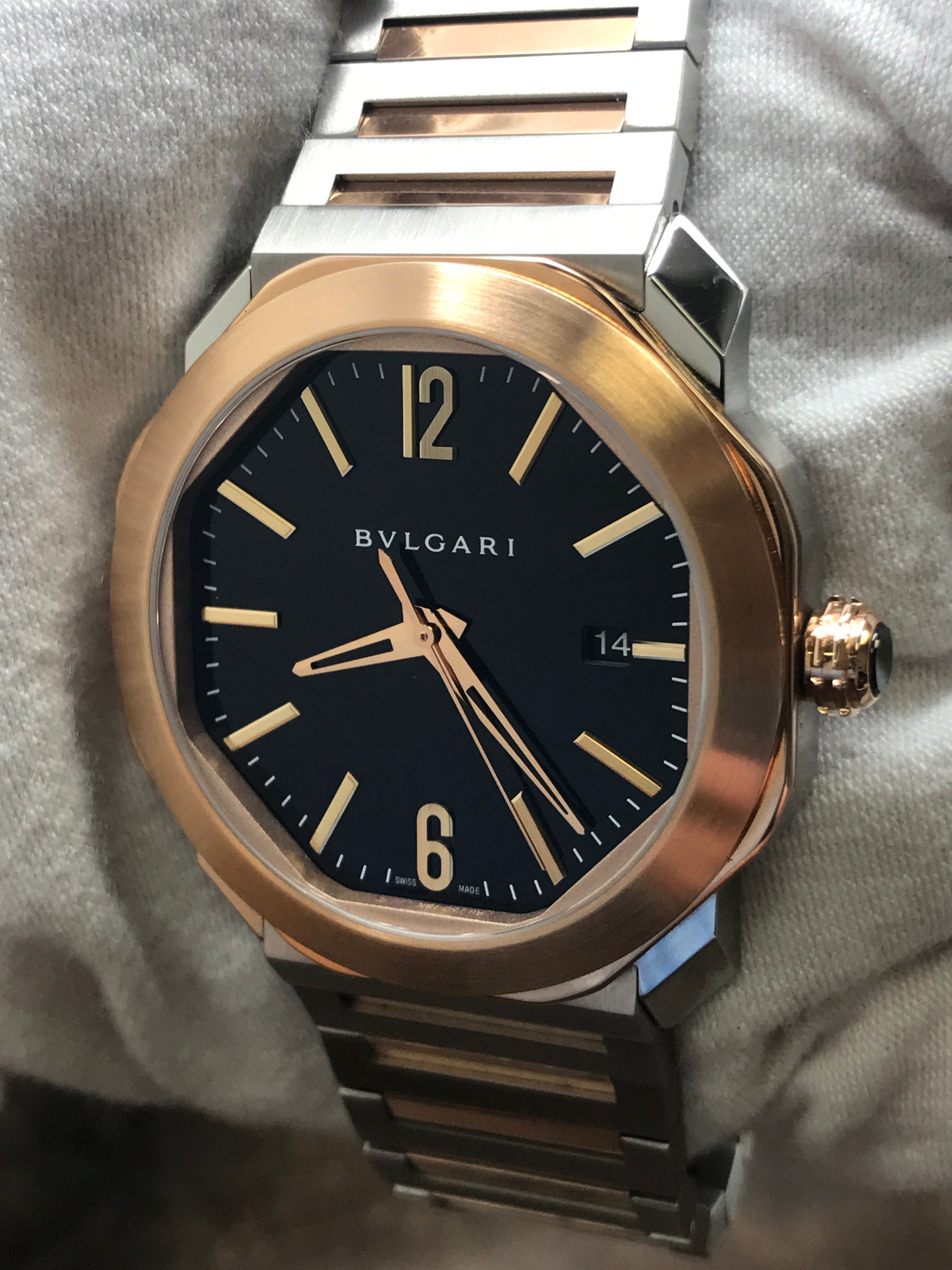 Stainless steel and 18k rose gold case with a steel & 18k rose gold bracelet. Fixed 18k rose gold bezel. Brown dial with rose gold hands and index hour markers. Dial type: analog. BVLGARI calibre bvl 191 automatic movement with about 42 of power reserve. Scratch resistant sapphire crystal. Pull/push crown. Transparent case back. Case size: 41 mm. Case thickness: 10 mm. Octagonal case shape. Band width: mm. Double folded deployment clasp. Water resistant at 50 meters / 165 feet. Functions: date, hour, minute, second. BVLGARI Octo Roma OC P 41 SG 102854 Brown Dial Automatic Men's Watch.