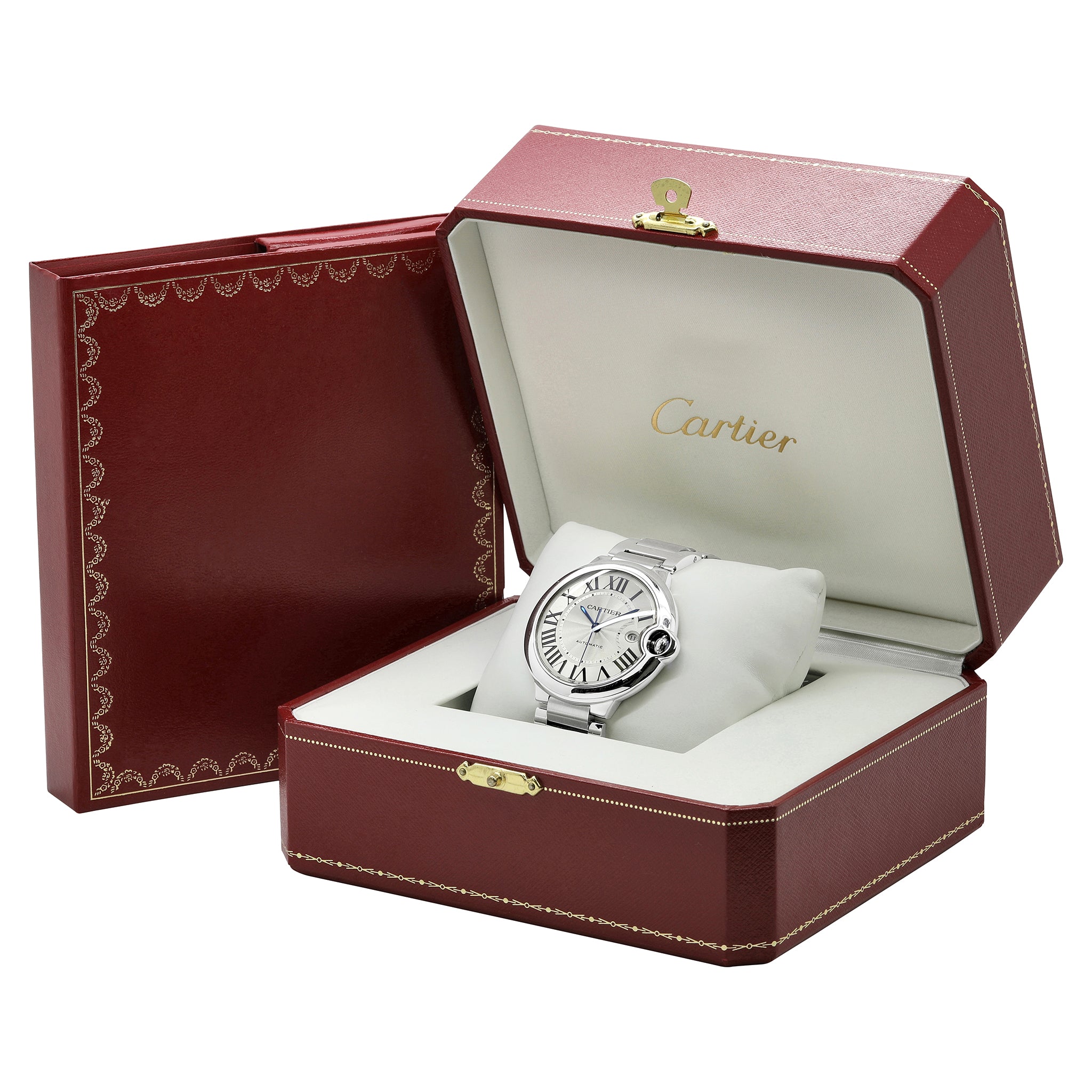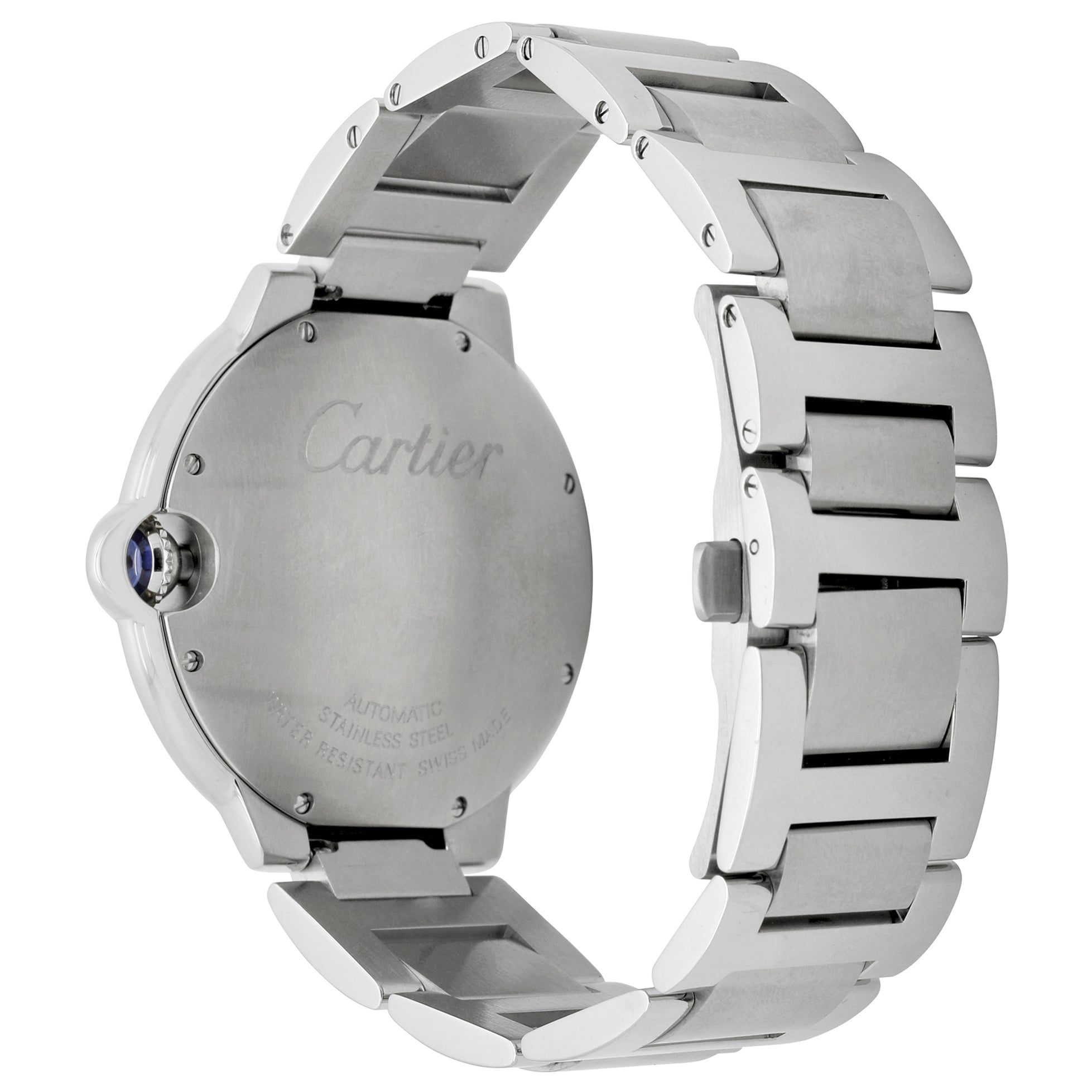 Stainless steel case with a stainless steel bracelet. Fixed stainless steel bezel. Silver-tone dial with blue hands and Roman numerals hour markers. Dial type: analog. Cartier caliber 049 automatic movement with about 42 hours of power reserve. Scratch resistant sapphire crystal. Pull / push crown. Solid case back. Case size: 42 mm. Case thickness: 13 mm. Round case shape. Band width: 20 mm. Hidden clasp. Water resistant at 30 meters / 100 feet. Functions: hour, minute, second, date, water resistant. Cartier Ballon Bleu 3001 W69012Z4 Silver-tone Dial Automatic Men's Watch.