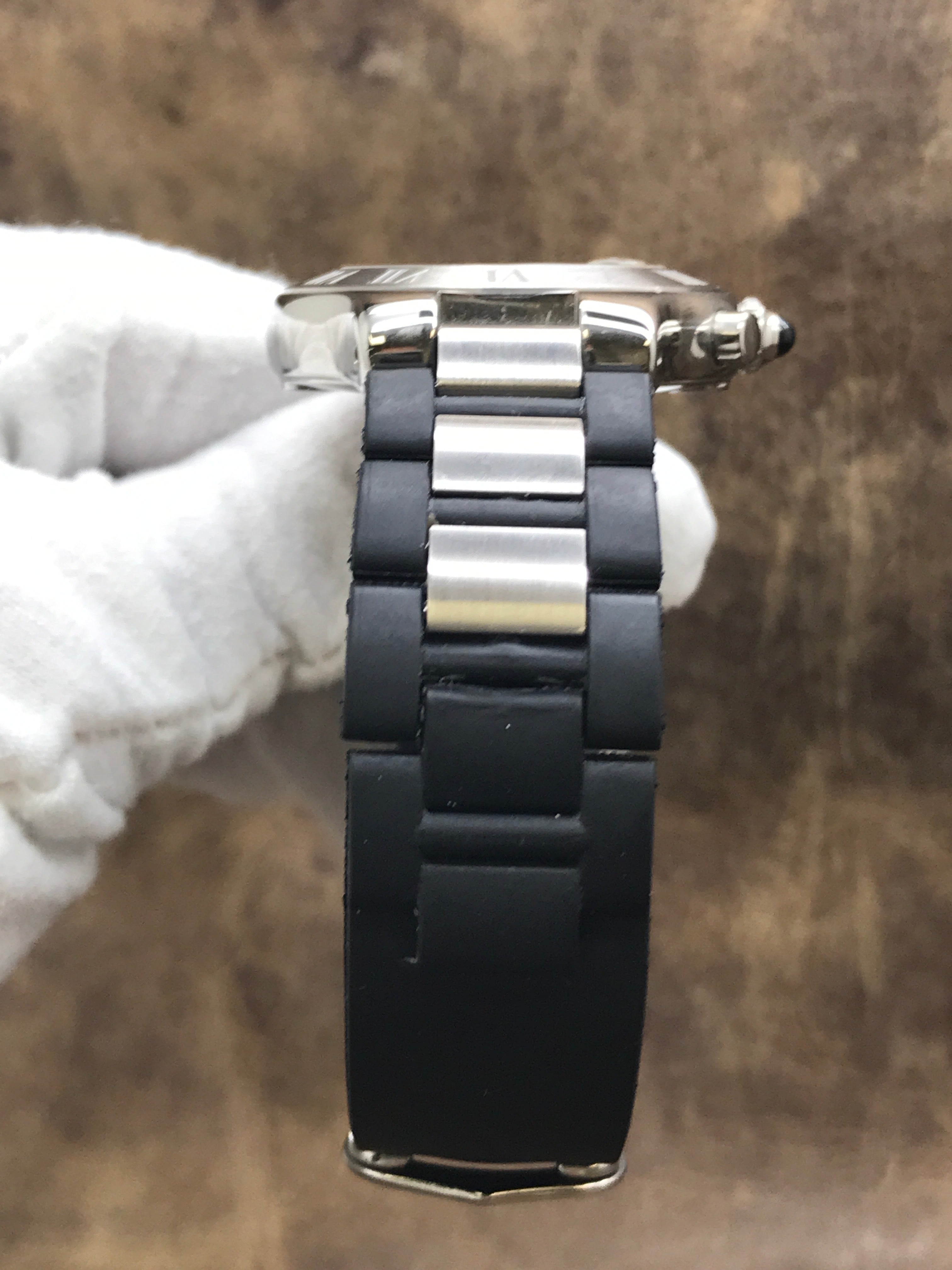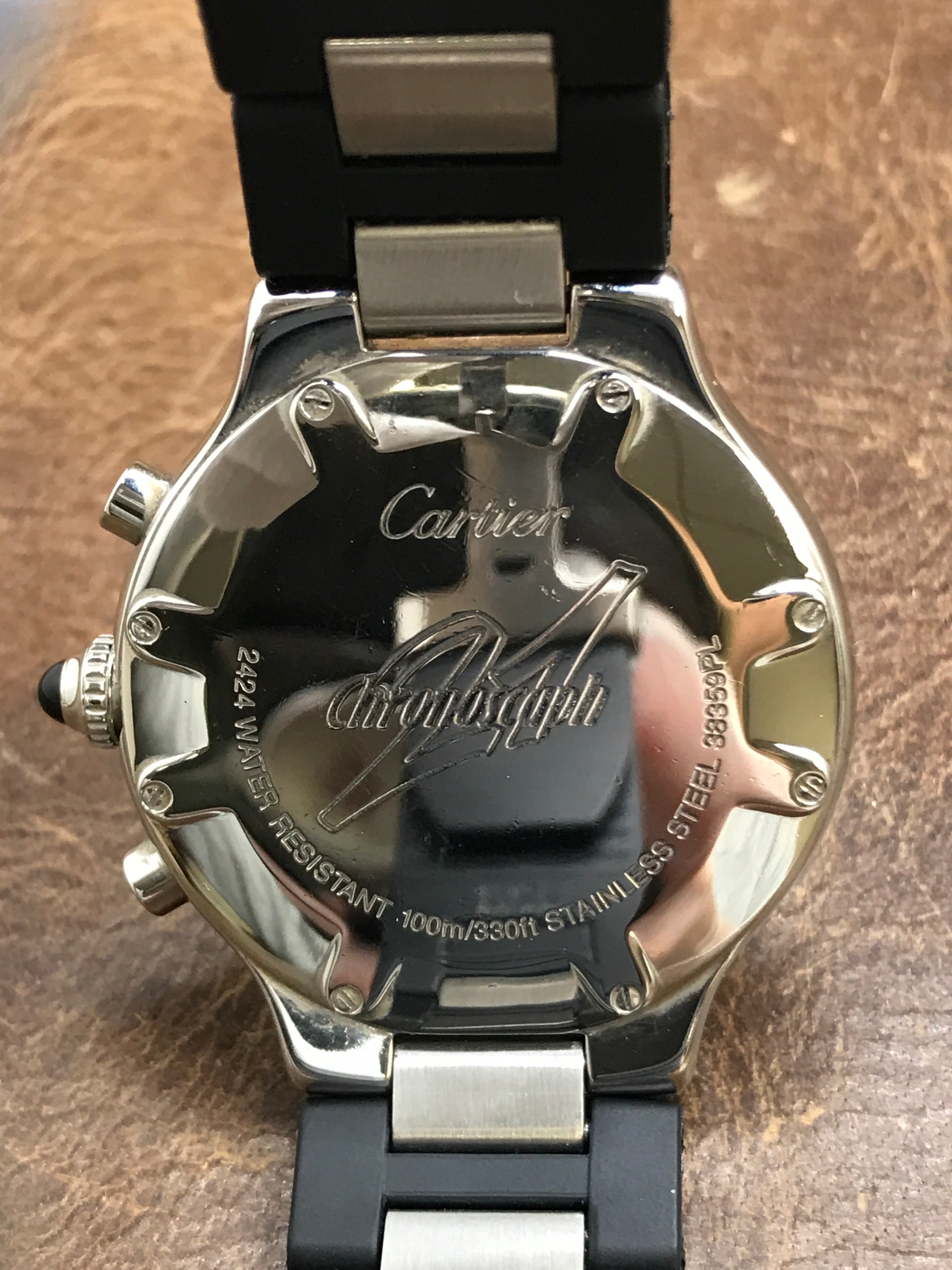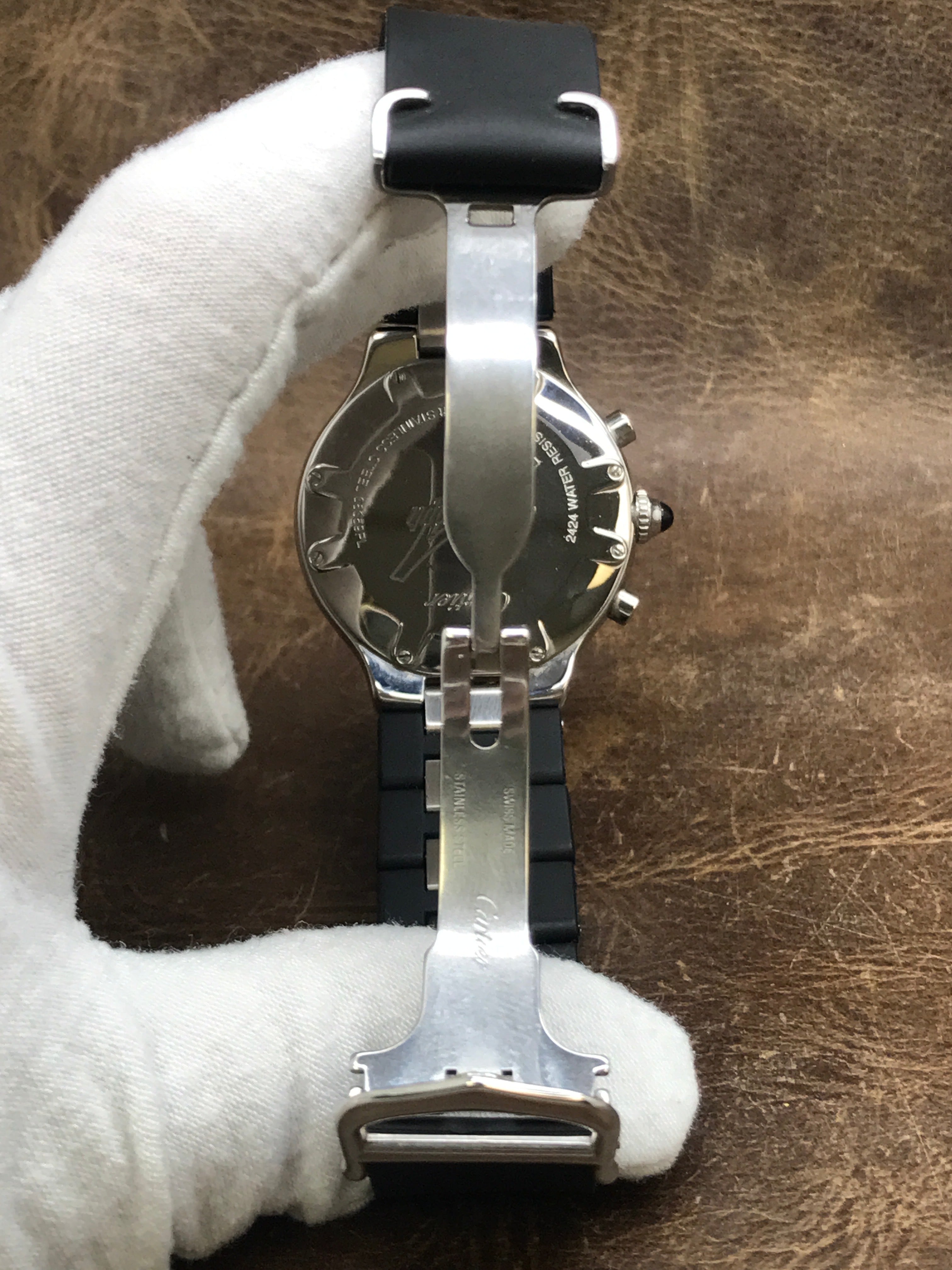 Stainless steel case with a stainless steel & rubber bracelet. Fixed Roman numeral stainless steel bezel. Black dial with silver tone luminous hands and luminous index hour markers. Dial type: analog. Luminescent hands and markers. Cartier cal. 372 quartz movement with about of power reserve. Scratch resistant sapphire crystal. Push/pull crown. Solid case back. Case size: 38 mm. Case thickness: 10 mm. Round case shape. Band width: mm. Fold over deployant clasp. Water resistant at 100m. Functions: chronograph, date, hour, minute, second. Cartier Chronoscaph 21 2424 Black Dial Quartz Men's Watch.