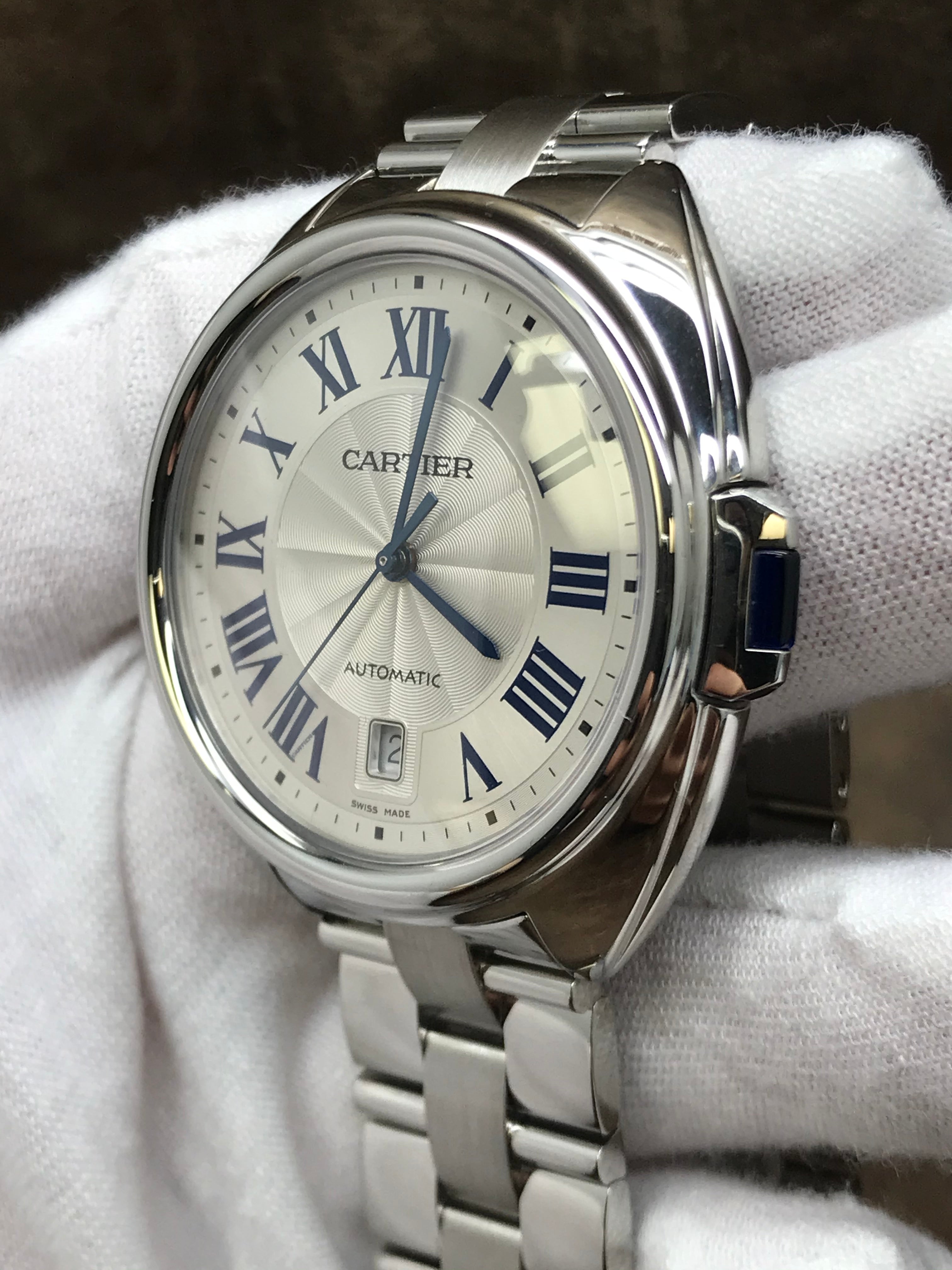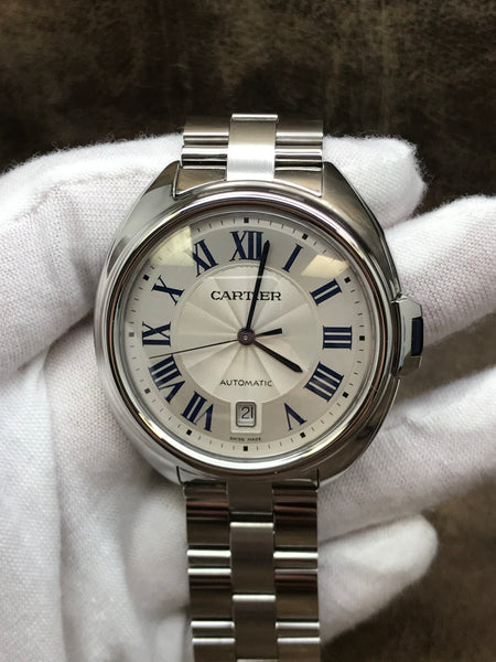 Stainless steel case with a stainless steel bracelet. Fixed stainless steel bezel. Silver dial with blued steel hands and Roman numerals hour markers. Dial type: silver gillouche Roman numerals. Caliber 1847 mc. Automatic movement with about 42 hours of power reserve. Scratch resistant sapphire crystal. Push/pull crown. Display case back. Case size: 40 mm. Case thickness: 11.76 mm. Tonneau case shape. Band width: 19 mm. Hidden butterfly clasp. Water resistant at 30m. Functions: hours, minutes, seconds, date. Cartier Cle de Cartier WSCL0007 Silver Dial Automatic Men's Watch.