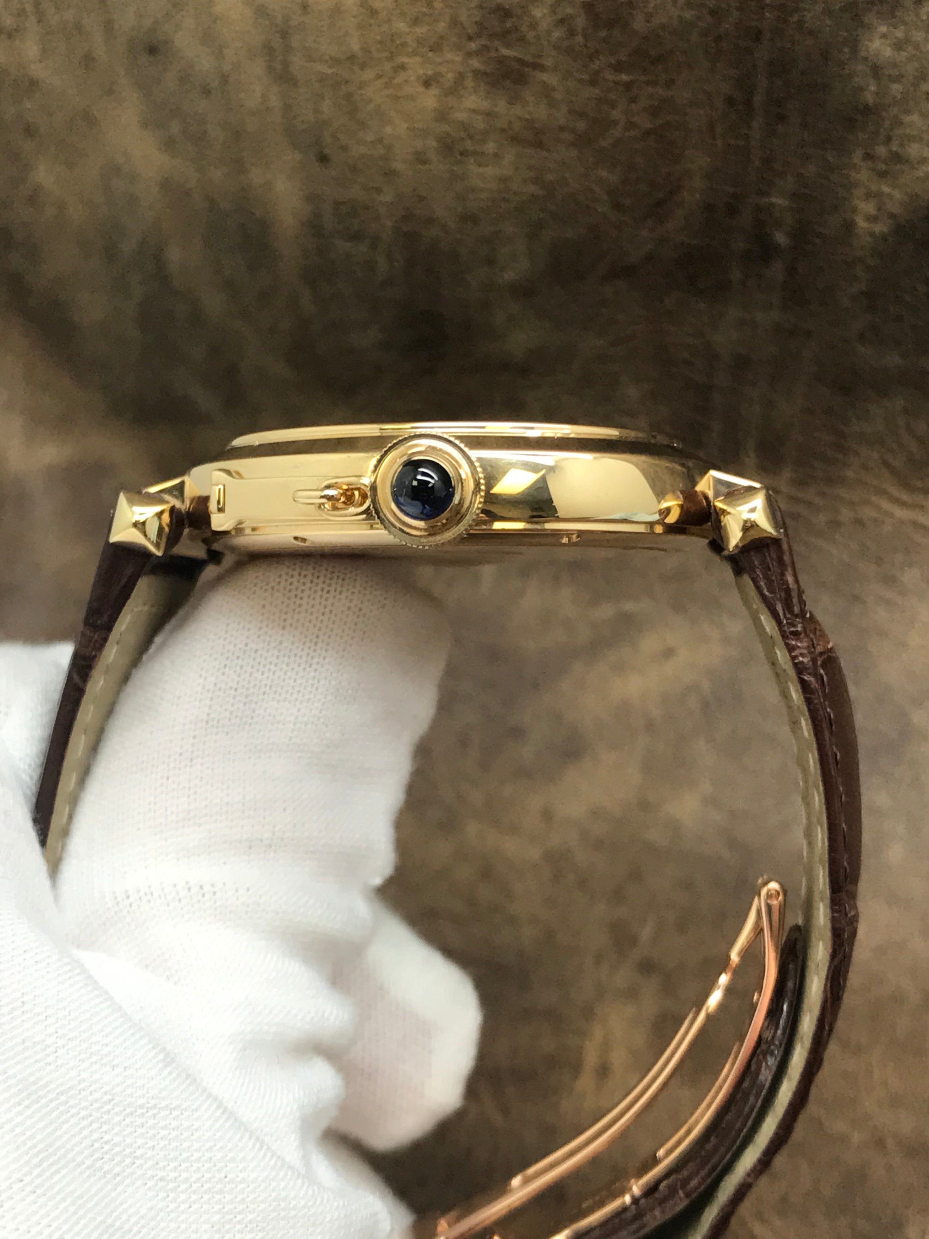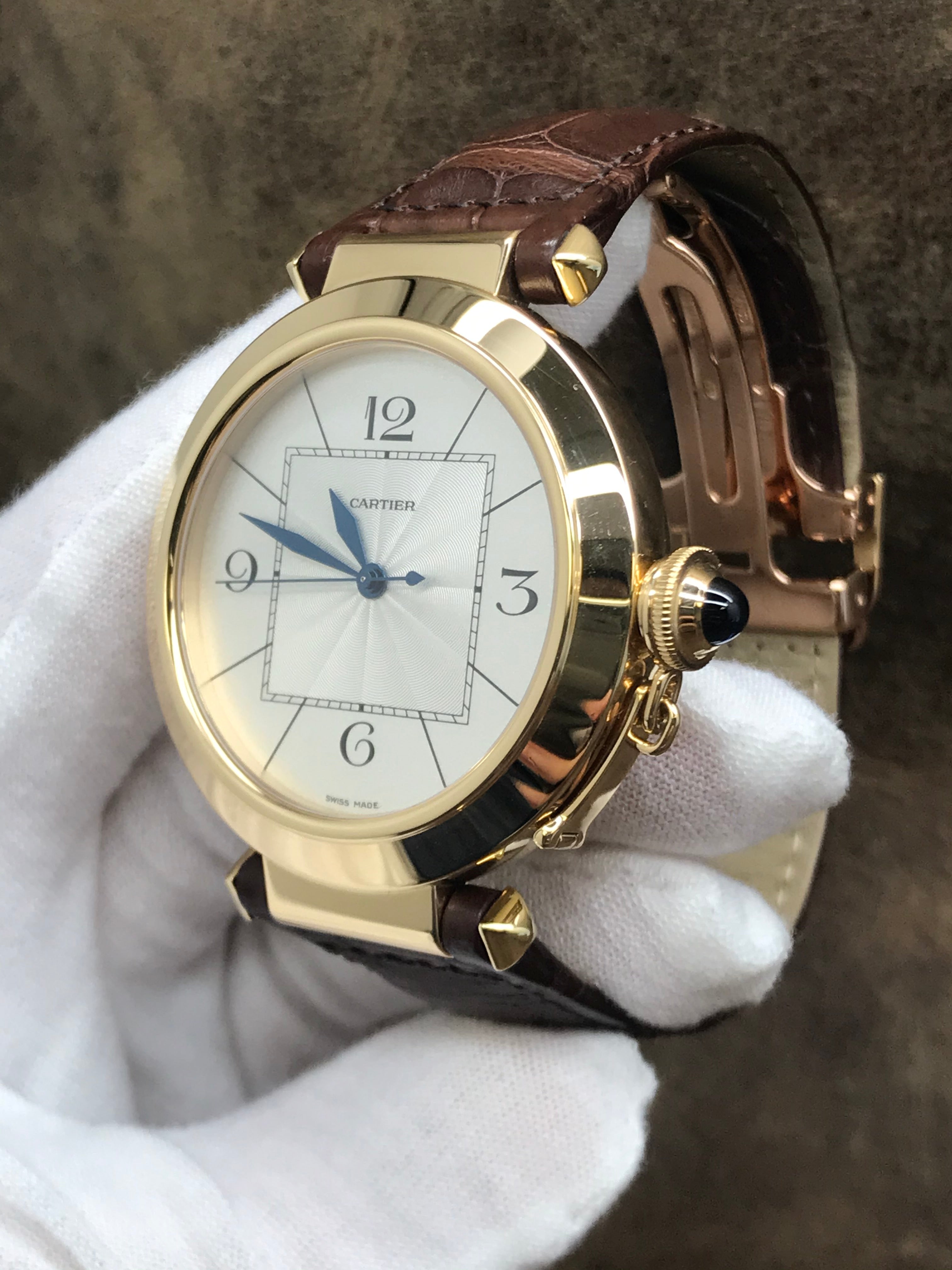 18kt yellow gold case with a leather strap. Fixed 18k yellow gold bezel. Silver dial with blued steel hands and Arabic numeral and index hour markers. Dial type: analog sector dial. Cartier caliber 8000 mc automatic movement with about 52 hours of power reserve. Scratch resistant sapphire crystal. Push/pull with screw-down guard crown. Solid case back. Case size: 42 mm. Case thickness: 8 mm. Round case shape. Band width: 24.5 mm. Hidden fold over clasp. Water resistant at 30m. Functions: hours, minutes, seconds . Cartier Pasha W3019551 Silver Dial Automatic Men's Watch.