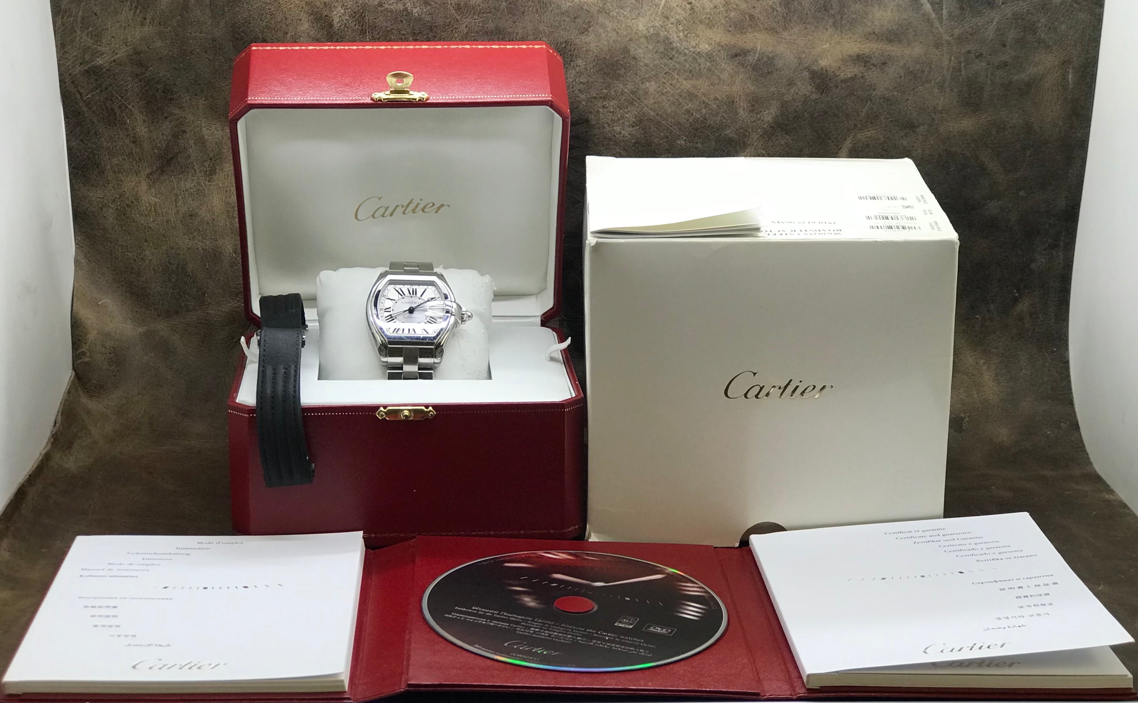 - original Cartier double box, booklets, extra strap & buckle and matching warranty papers dated 2008
