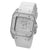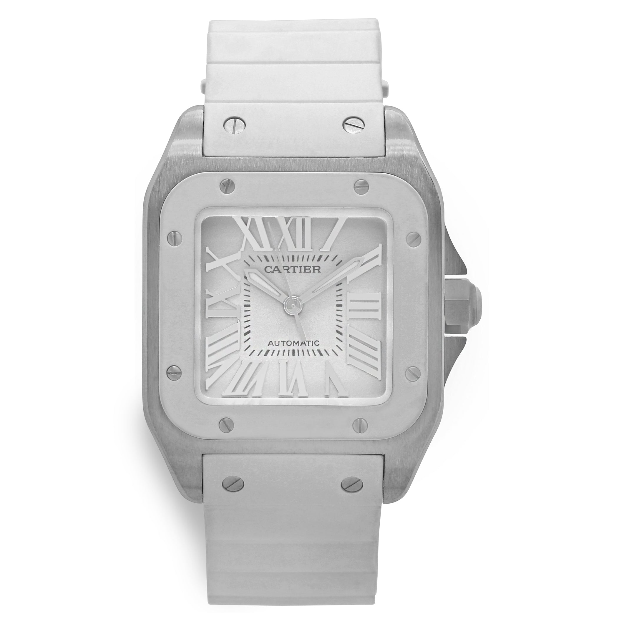 Stainless steel case with a rubber strap. White rubber rubber bezel. White dial with silver tone luminous hands and Roman hour markers. Dial type: analog. Automatic movement with about of power reserve. Sapphire crystal. Push/pull crown. Solid case back. Case size: 33mm mm. Case thickness: mm. Square case shape. Band width: mm. Tang clasp. Functions: hour, minute. Cartier Santos 100 Midsize W20122U2 White Dial Automatic Watch.