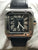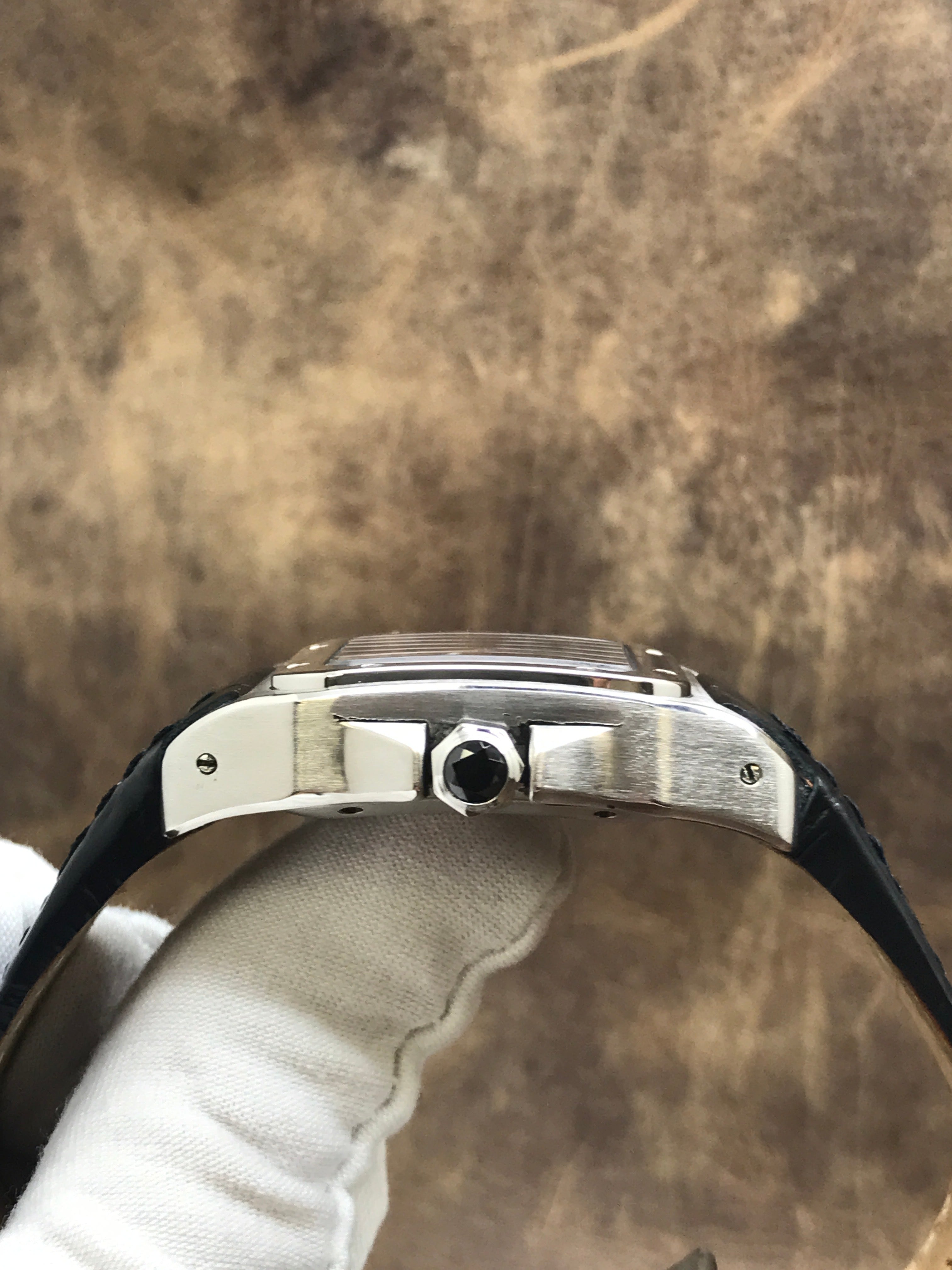 Stainless steel case with a custom leather strap custom leather. Fixed stainless steel bezel. Black dial with luminous silver-tone hands and Roman numerals hour markers. Dial type: analog. 049 automatic movement with about 42 of power reserve. Sapphire crystal. Pull/push crown. Solid case back. Case size: 33 x 44 mm. Case thickness: 11 mm. Square case shape. Band width: mm. Double folded deployment clasp. Functions: hour, minutes, seconds. Cartier Santos 100 Midsize 2878 Black Dial Automatic Watch.