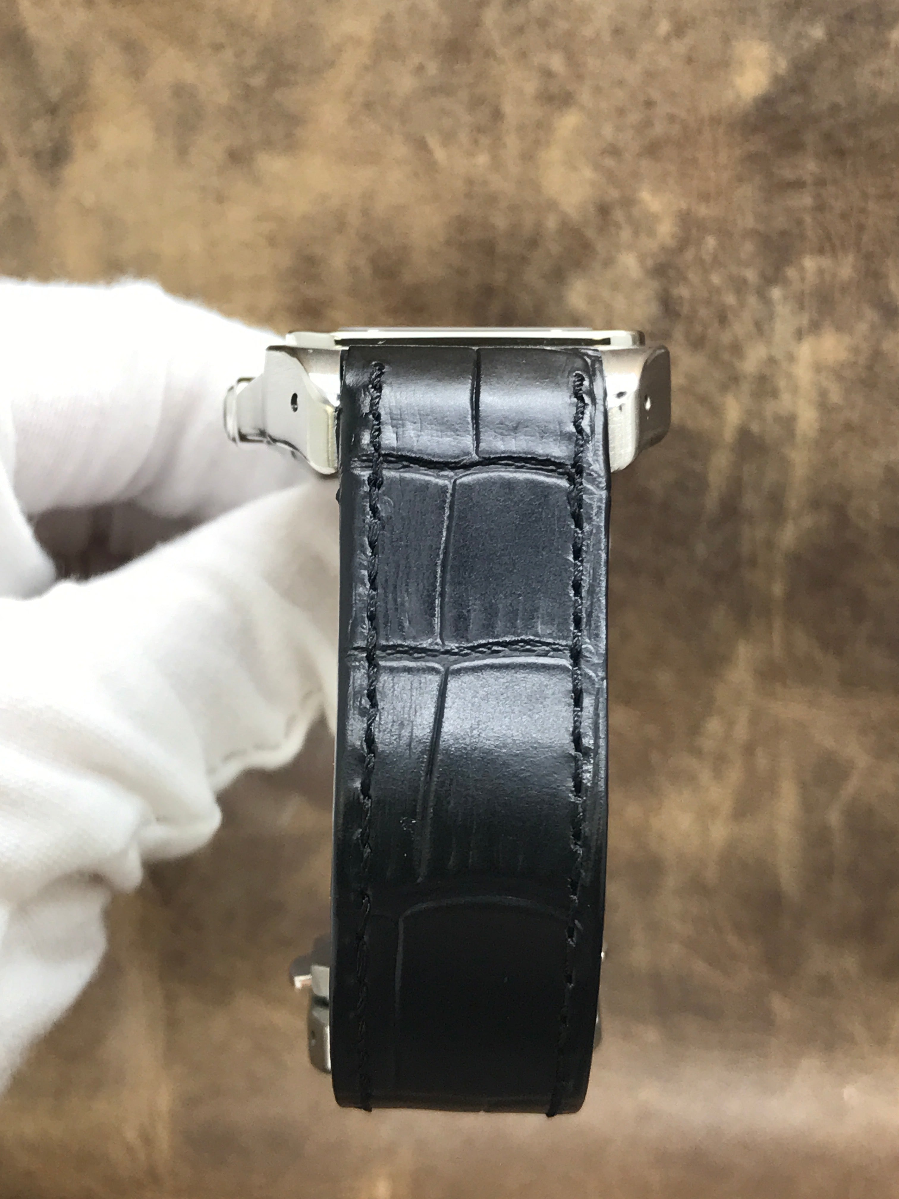 Stainless steel case with a custom leather strap custom leather. Fixed stainless steel bezel. Black dial with luminous silver-tone hands and Roman numerals hour markers. Dial type: analog. 049 automatic movement with about 42 of power reserve. Sapphire crystal. Pull/push crown. Solid case back. Case size: 33 x 44 mm. Case thickness: 11 mm. Square case shape. Band width: mm. Double fold-over with push button release clasp. Functions: hour, minutes, seconds. Cartier Santos 100 Midsize 2878 Black Dial Automatic Watch.