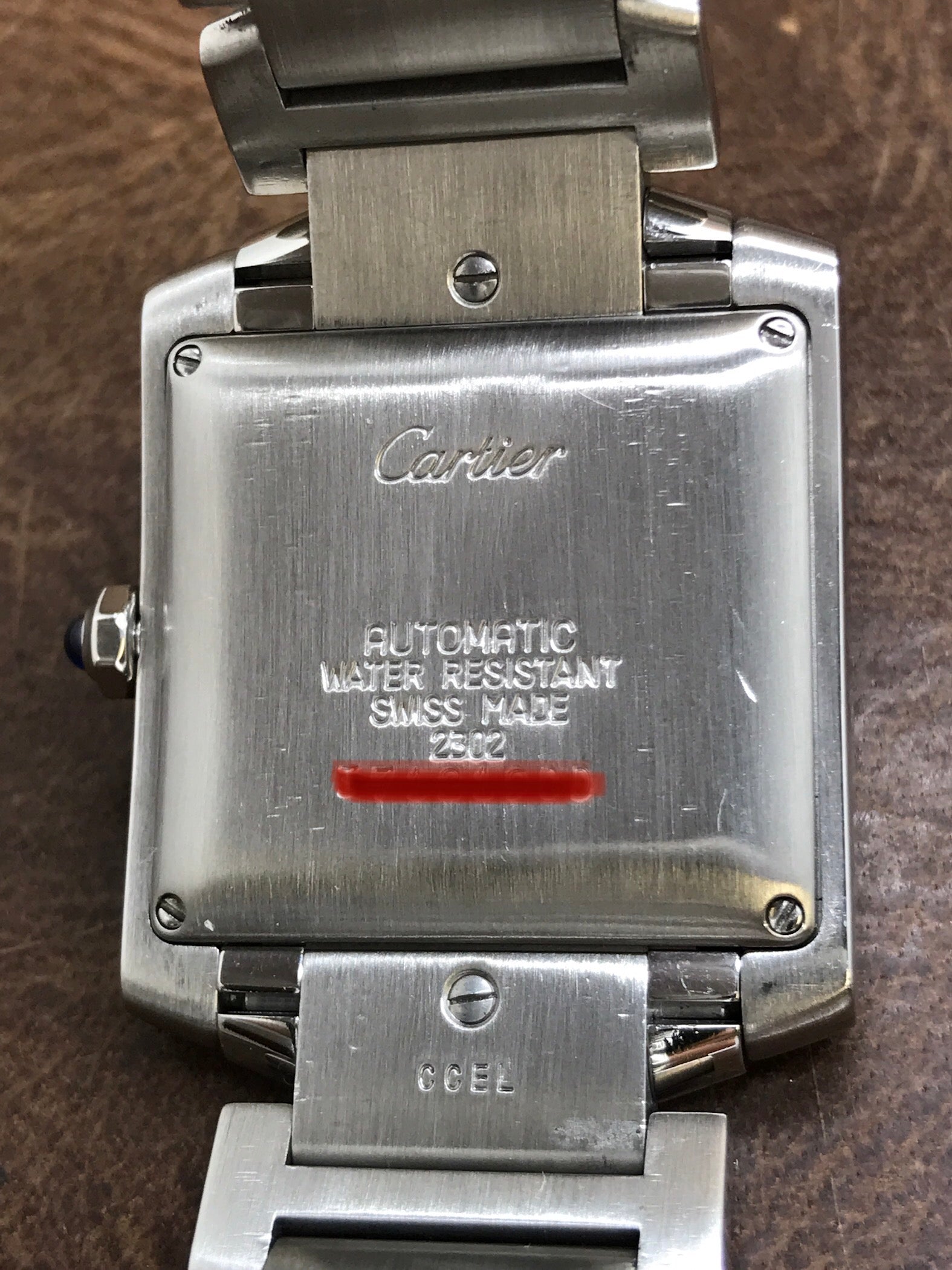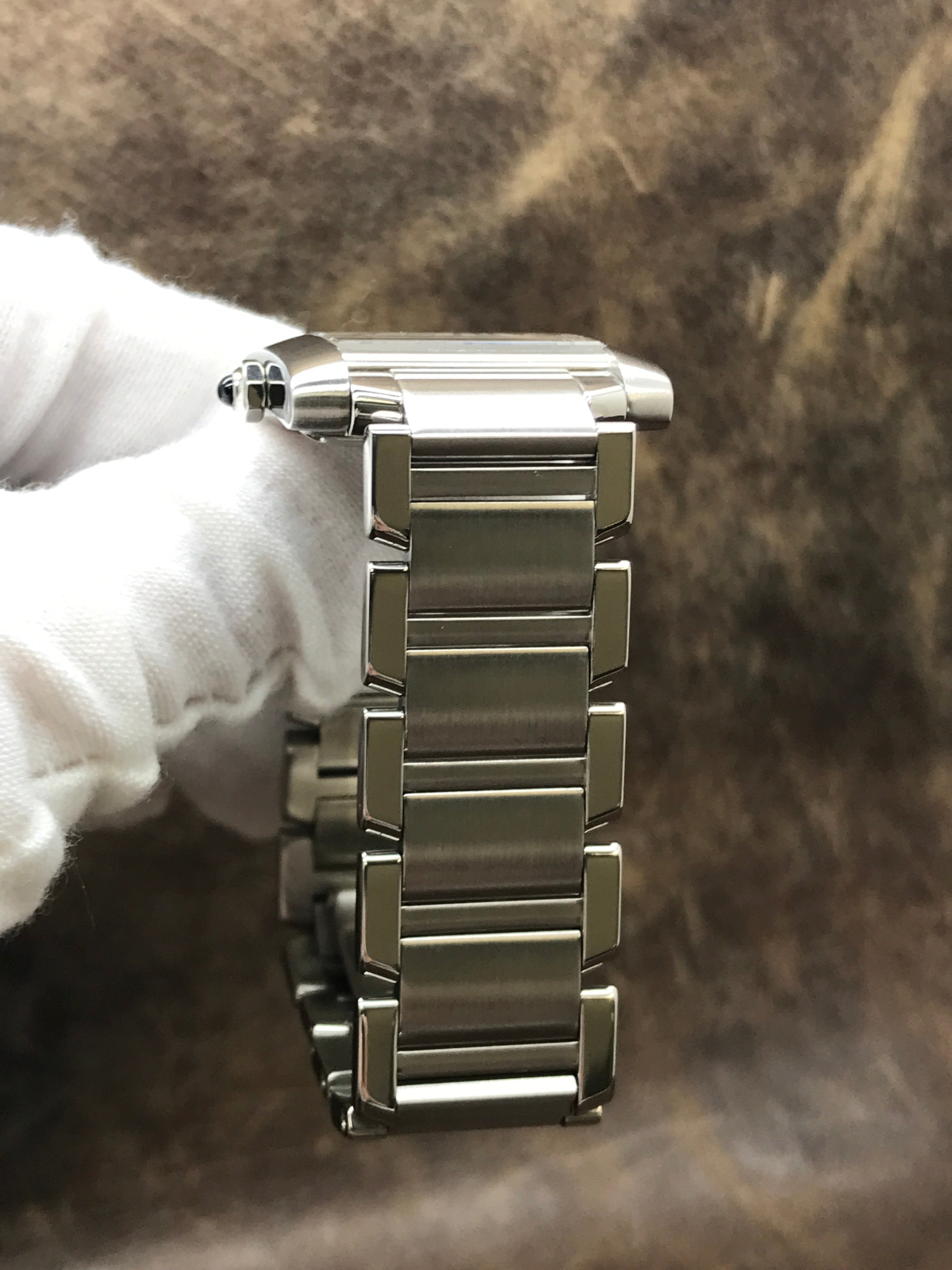 Stainless steel case with a stainless steel bracelet. Fixed stainless steel bezel. White dial with dark blue sword-shaped hands and Roman numerals hour markers. Dial type: analog. Cartier 120 automatic movement with about of power reserve. Scratch resistant sapphire crystal. Push / pull crown. Solid case back. Case size: 28 x 32 mm. Case thickness: 6.5 mm. Rectangle case shape. Band width: mm. Hidden butterfly clasp. Water resistant at 30 meters / 100 feet. Functions: hour, minute, second. Cartier Tank Francaise 2302 White Dial Automatic Men's Watch.