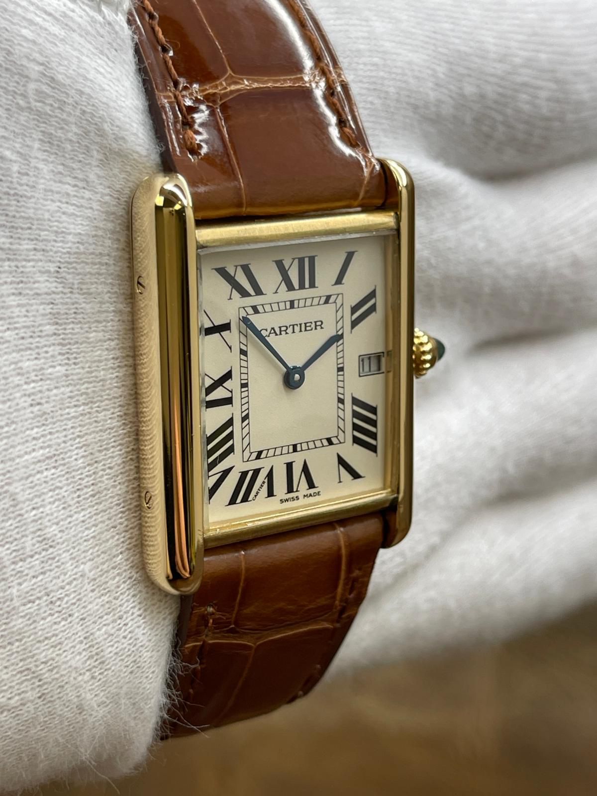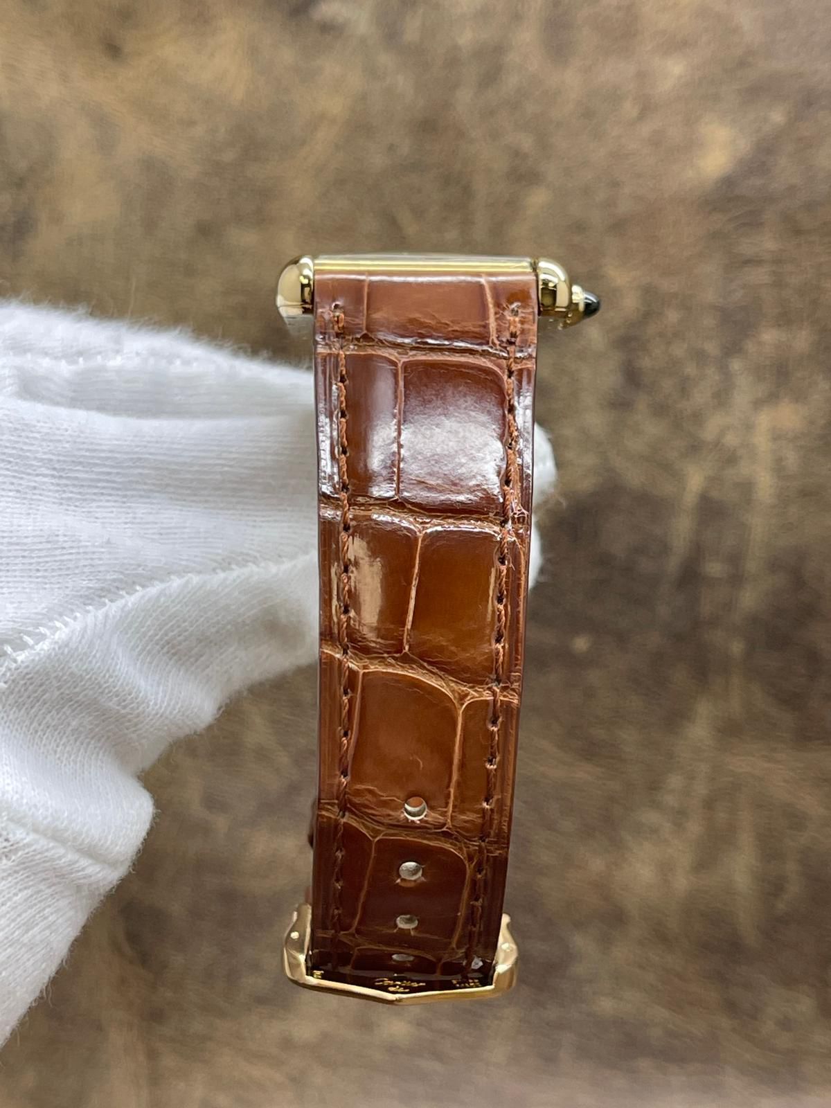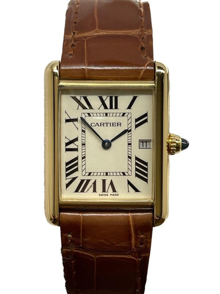 18k yellow gold case with a alligator leather aligator leather. Smooth - fixed 18k yellow gold bezel. Silver Roman dial with sword-shaped blued steel hands hands and Roman hour markers. Dial type: analog. Quartz movement with about of power reserve. Mineral glass crystal. Pull / push crown. Solid case back. Case size: 25.5 x 33.7 mm. Case thickness: 6.35 mm. Rectangular case shape. Band width: mm. Original 18k yellow gold tang buckle clasp. Water resistant at none. Functions: hour, minute, date. Cartier Tank Louis Large W1529756 Silver Roman Dial Quartz Men's Watch.