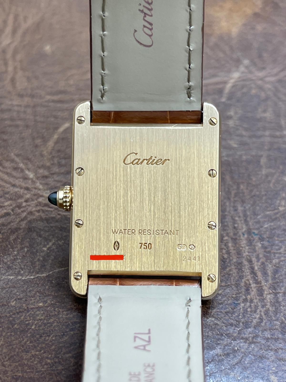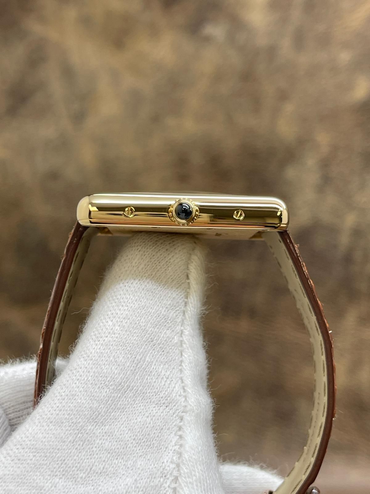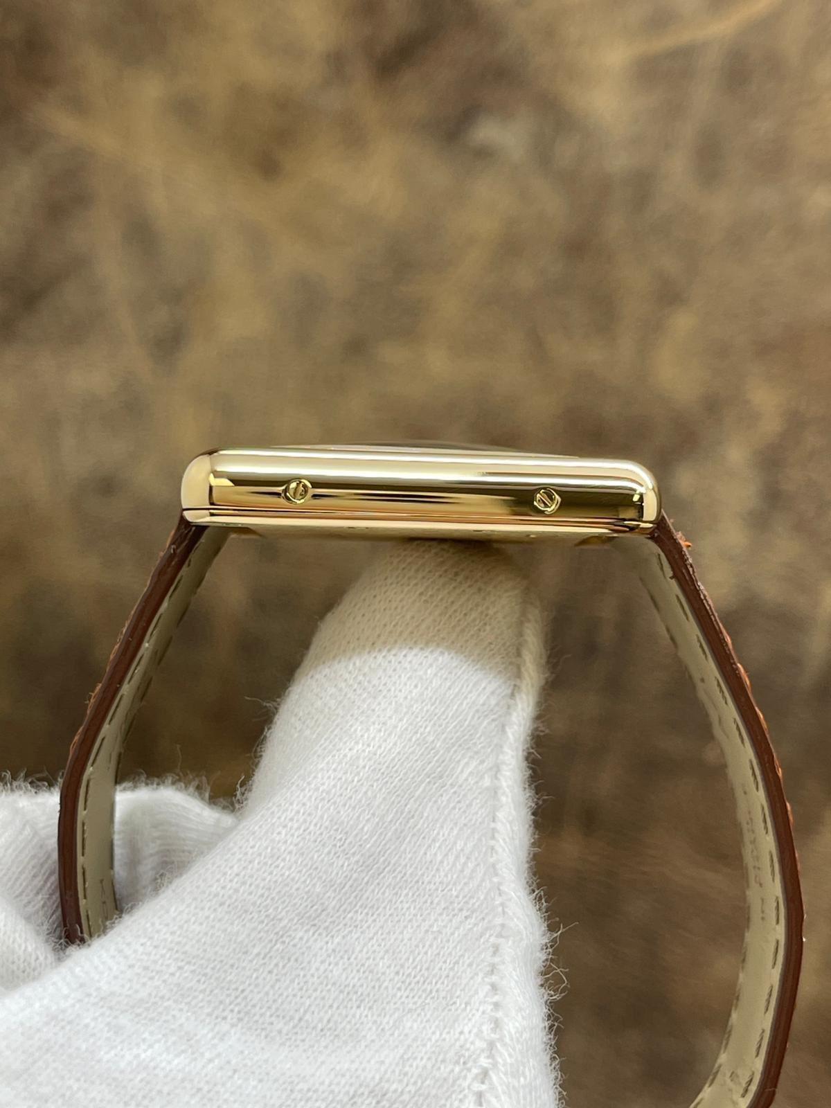 18k yellow gold case with a alligator leather aligator leather. Smooth - fixed 18k yellow gold bezel. Silver Roman dial with sword-shaped blued steel hands hands and Roman hour markers. Dial type: analog. Quartz movement with about of power reserve. Mineral glass crystal. Pull / push crown. Solid case back. Case size: 25.5 x 33.7 mm. Case thickness: 6.35 mm. Rectangular case shape. Band width: mm. Original 18k yellow gold tang buckle clasp. Water resistant at none. Functions: hour, minute, date. Cartier Tank Louis Large W1529756 Silver Roman Dial Quartz Men's Watch.