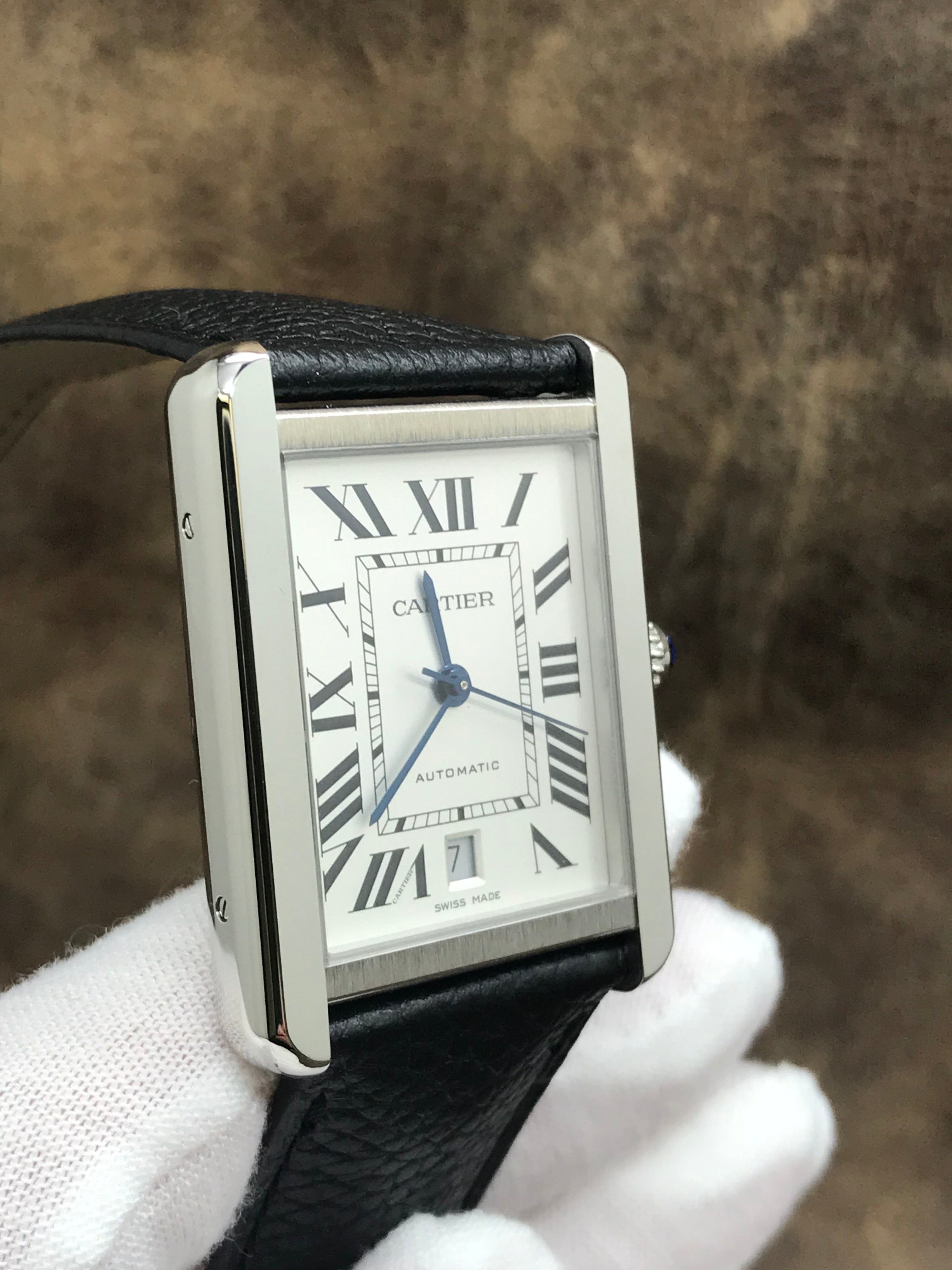 Stainless steel case with a leather strap. Fixed stainless steel bezel. Silver dial with blued steel hands and Roman numerals hour markers. Dial type: Roman numeral analogue. 1847mc automatic movement with about 42hrs of power reserve. Scratch resistant sapphire crystal. Push/pull crown. Solid case back. Case size: 31 x 41 mm. Case thickness: 7.65 mm. Rectangular case shape. Band width: 22 mm. Deployment clasp. Water resistant at 30m/100ft. Functions: hours, minutes, seconds, date . Cartier Tank Solo XL WSTA0029 Silver Dial Automatic Men's Watch.