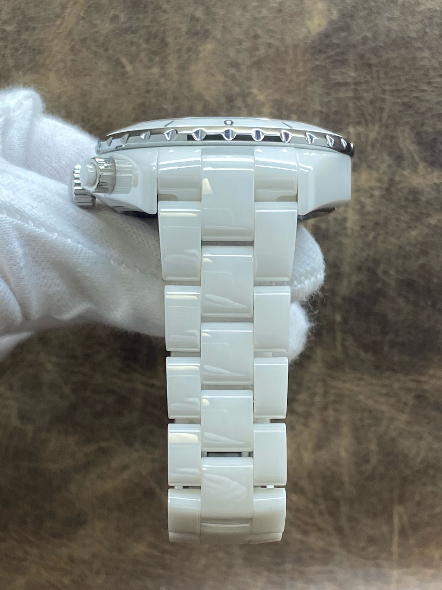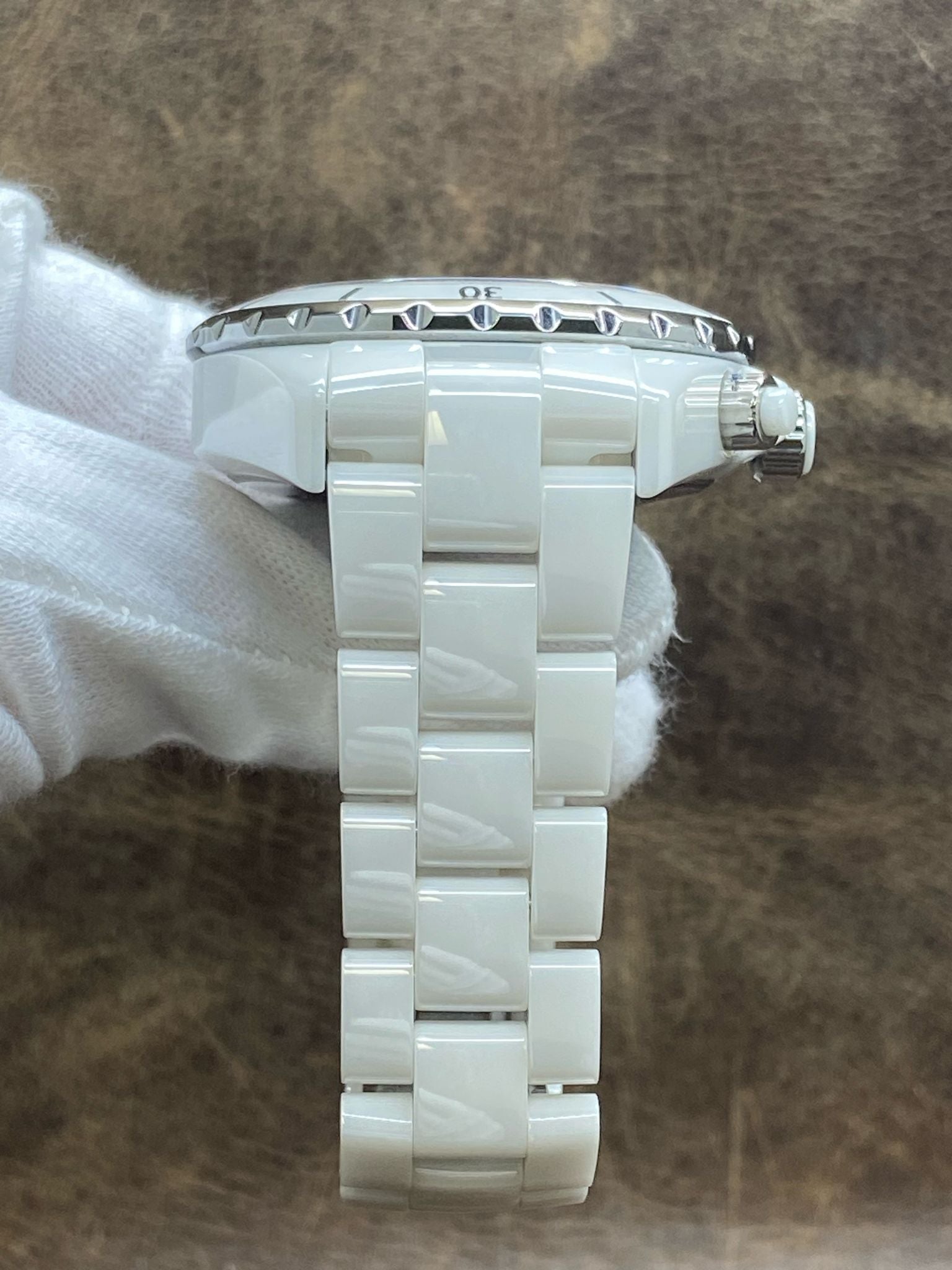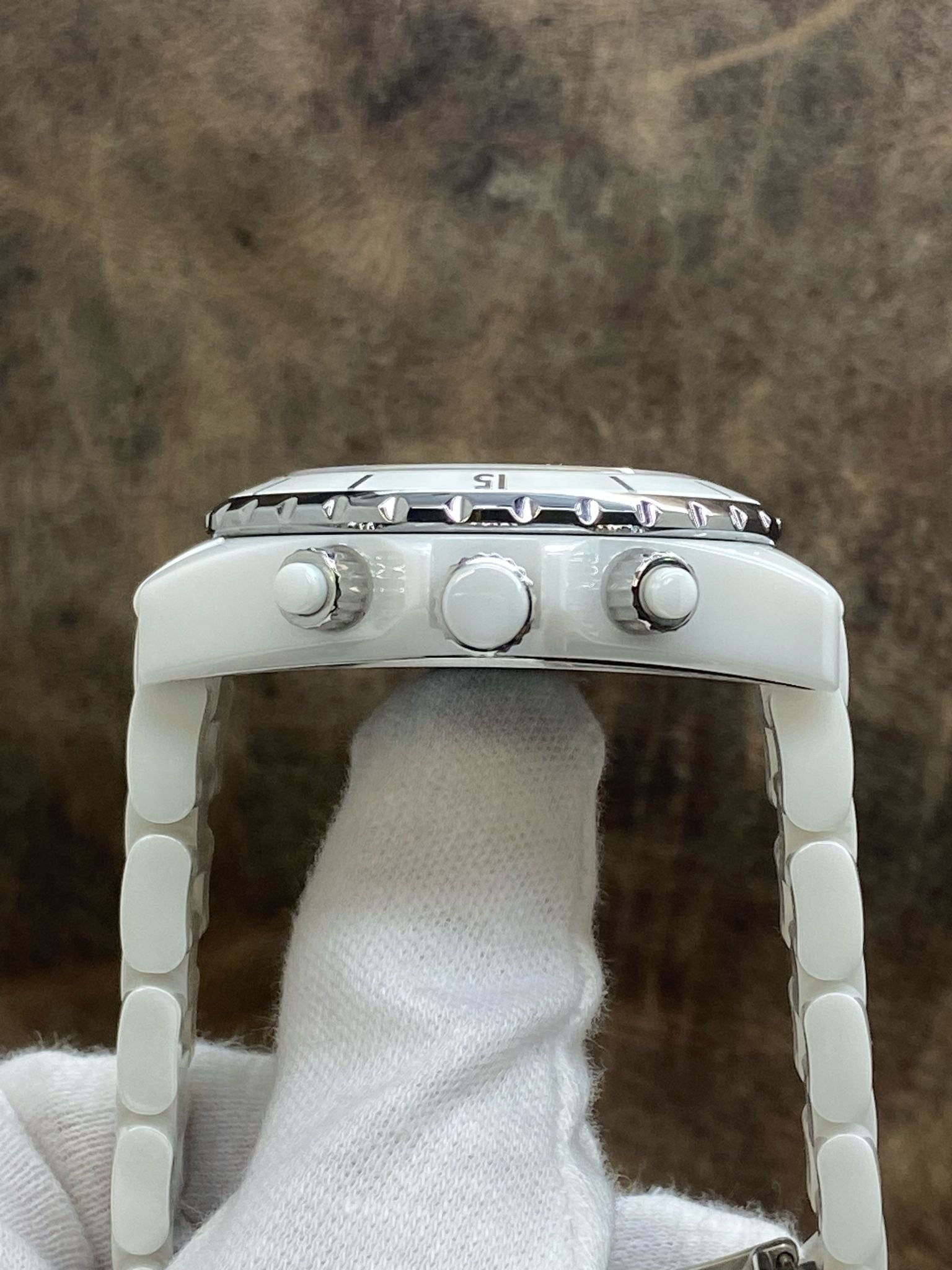 Ceramic & stainless steel case with a ceramic bracelet. Uni-directional rotating steel rimmed & white ceramic bezel bezel. White dial with luminous black hands and Arabic numerals hour markers. Dial type: analog. Automatic movement with about 42 of power reserve. Scratch resistant sapphire crystal. Screw down crown. Solid case back. Case size: 41 mm. Case thickness: 14 mm. Round case shape. Band width: mm. Double fold-over clasp. Water resistant at 200 meters / 660 feet. Functions: chronograph, chronometer, date, hour, minute, seconds. Chanel J12 Chronograph 41mm H1007 White Dial Automatic Men's Watch.
