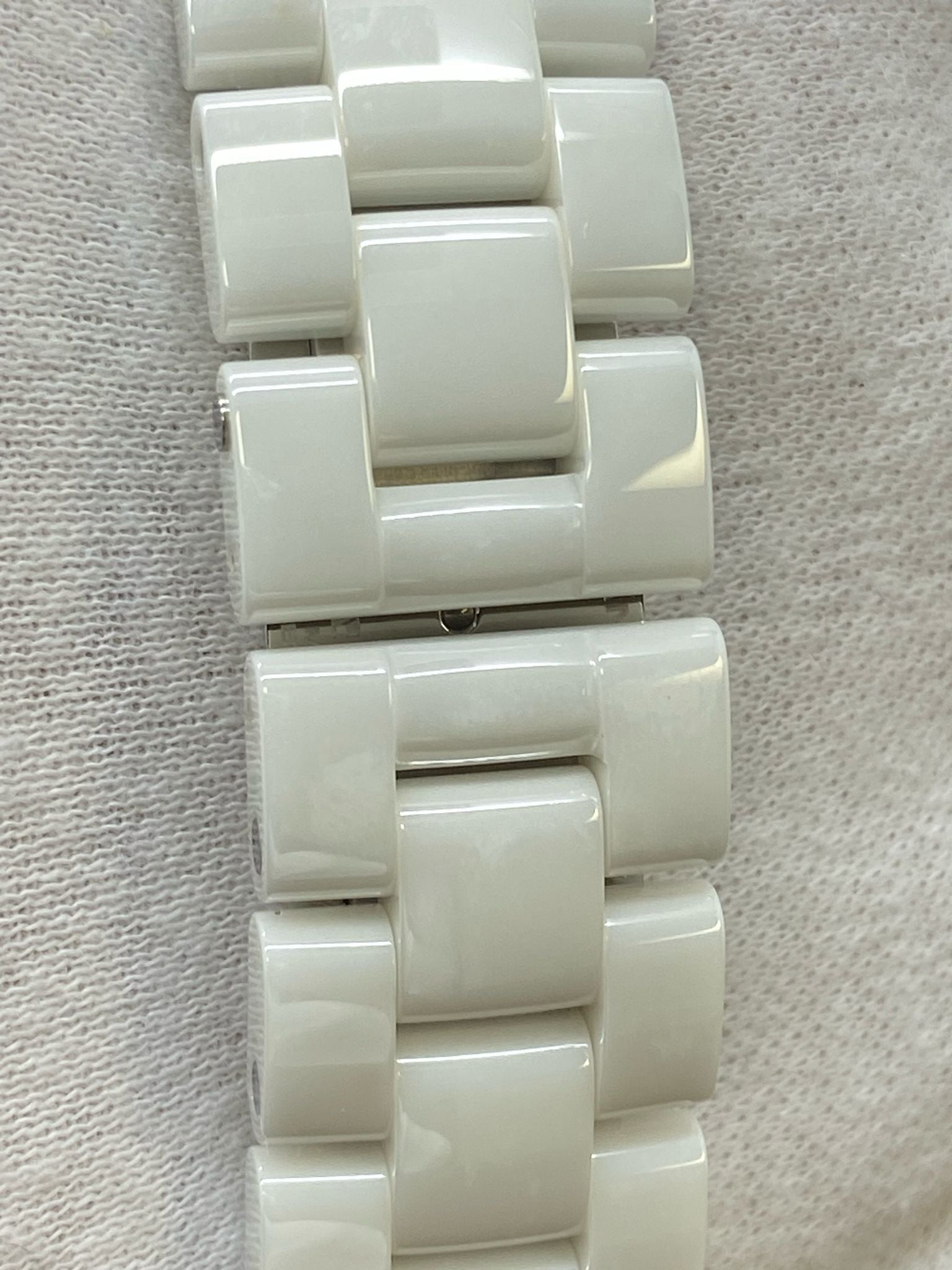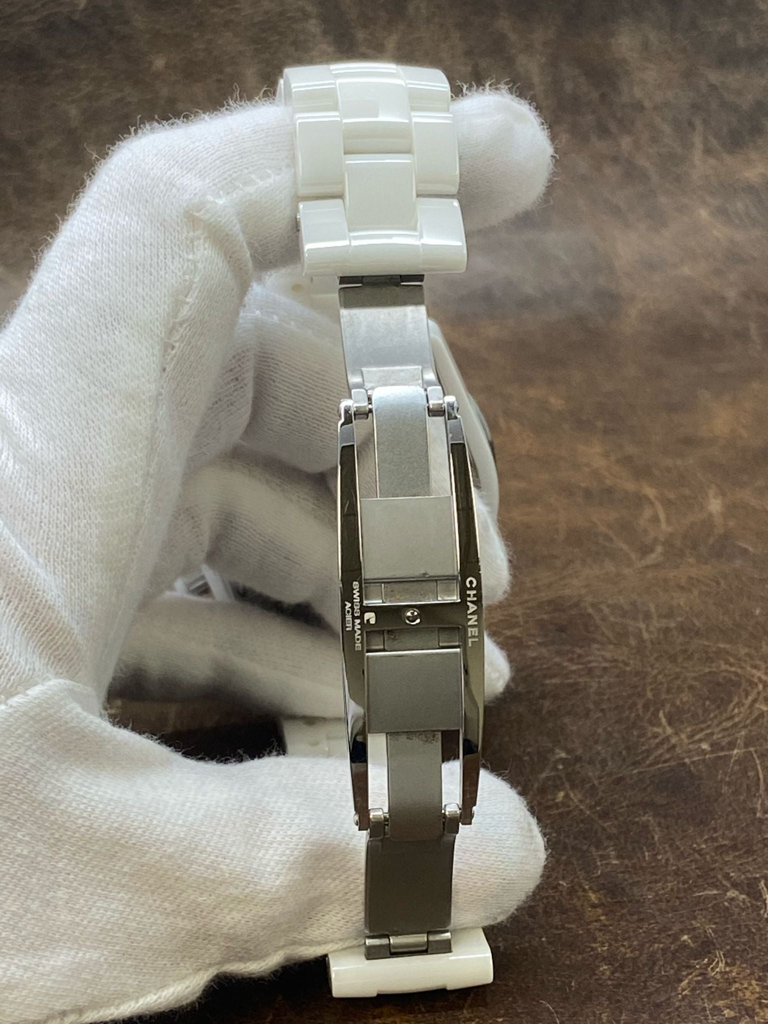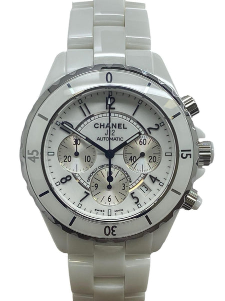Ceramic & stainless steel case with a ceramic bracelet. Uni-directional rotating steel rimmed & white ceramic bezel bezel. White dial with luminous black hands and Arabic numerals hour markers. Dial type: analog. Automatic movement with about 42 of power reserve. Scratch resistant sapphire crystal. Screw down crown. Solid case back. Case size: 41 mm. Case thickness: 14 mm. Round case shape. Band width: mm. Double fold-over clasp. Water resistant at 200 meters / 660 feet. Functions: chronograph, chronometer, date, hour, minute, seconds. Chanel J12 Chronograph 41mm H1007 White Dial Automatic Men's Watch.