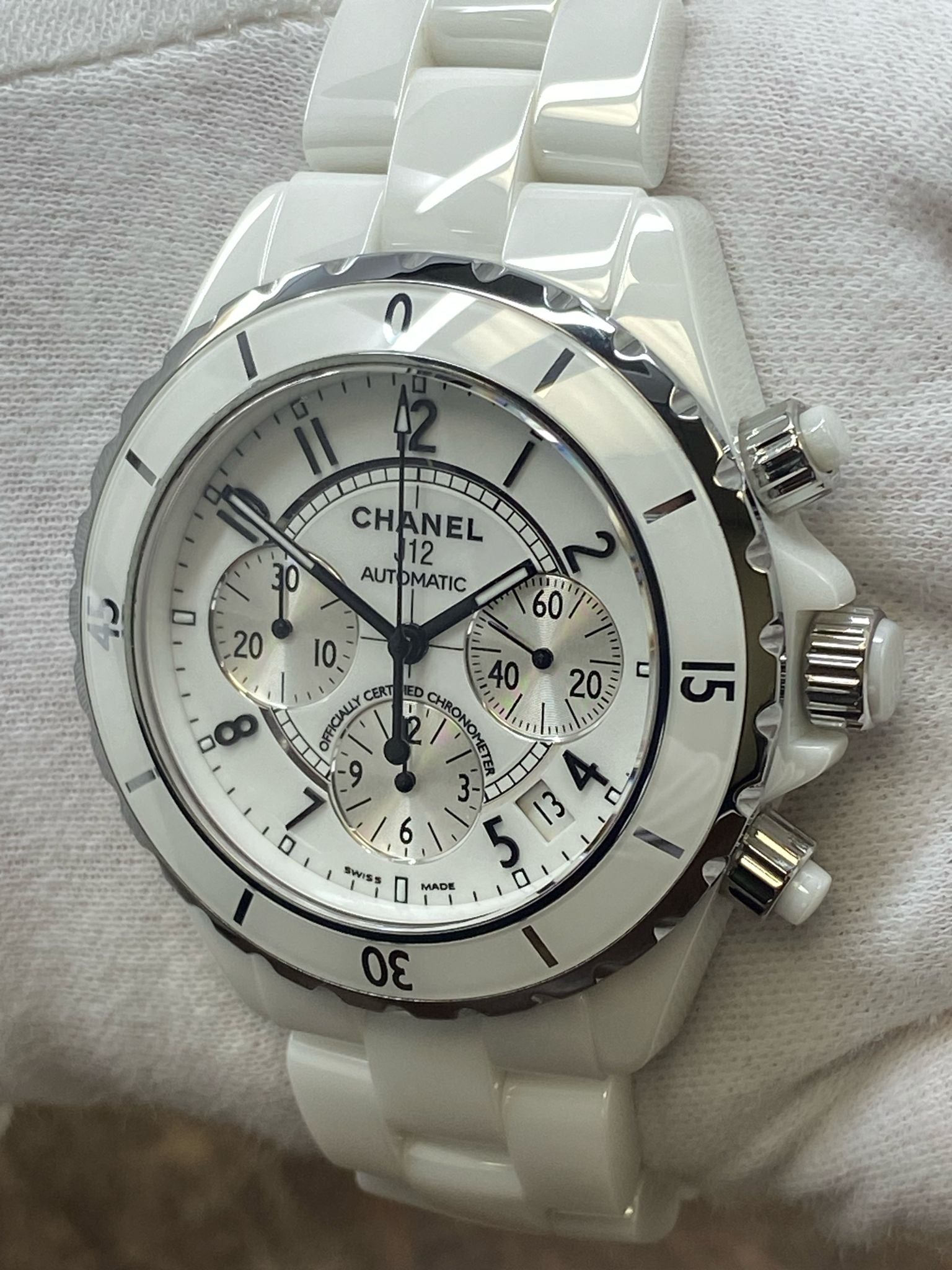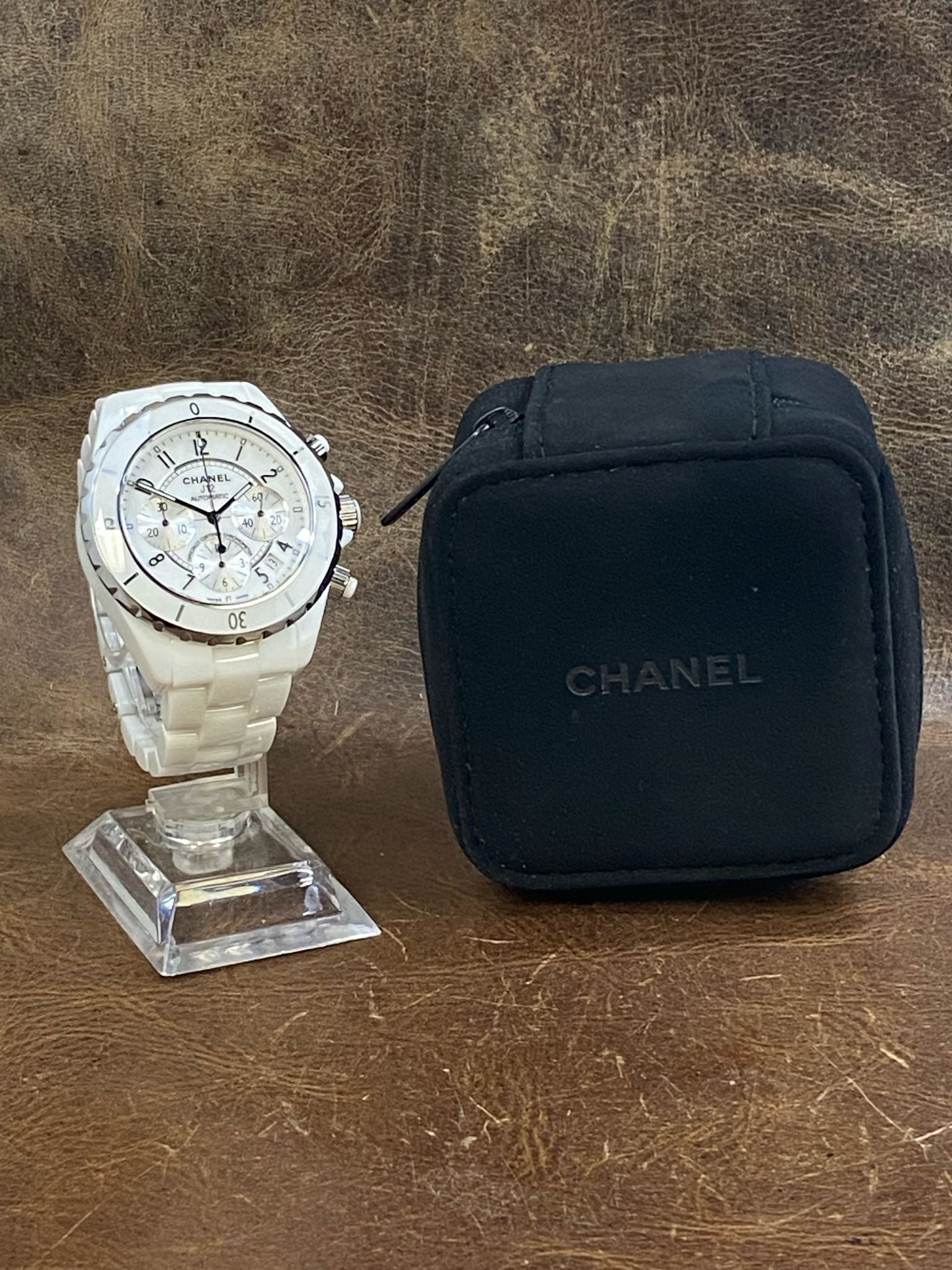 This pre-owned Chanel J12 Chronograph 41mm H1007 is in excellent condition and comes with: original Chanel pouch only. Max wrist size: 6.5 in.